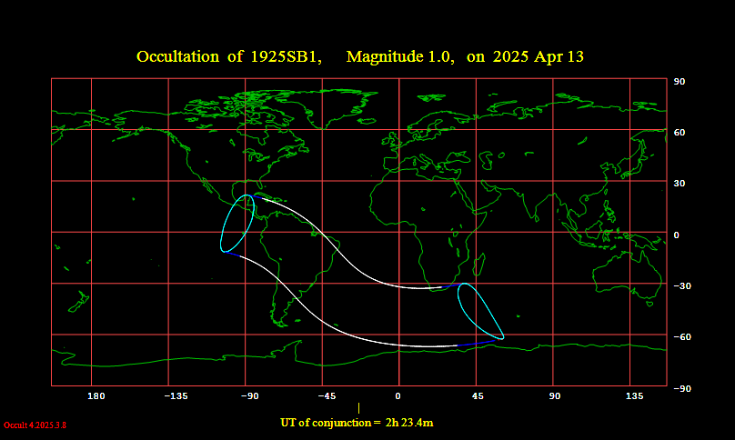 Occultation predictions of 1925SB1 Magnitude 1.0 Date 2025 Apr 13 Moon: % illumination = 100+, Solar elongation = 178 Disappearance U.T. Sun Moon CA PA WA a b Location h m s Alt Alt Az o o o m/o m/o 1 AN Kralendijk 0 0 55 18 106 22S 73 52 +1.4 +1.7 2 AN Willemstad 0 0 2 17 106 21S 74 53 +1.3 +1.6 3 AR Bolivar 1 37 6 49 63 -64S 203 183 -3.0 -5.9 4 AR Buenos Aires 1 26 7 49 65 -83S 186 165 -0.7 -3.8 5 AR Catamarca 1 9 35 42 79 -77S 191 171 -1.2 -4.2 6 AR Chilecito 1 15 33 41 79 -65S 202 181 -2.6 -5.7 7 AR Concordia 1 14 22 48 70 -85S 176 155 -0.2 -3.3 8 AR Cordoba 1 19 26 44 74 -72S 196 176 -1.7 -4.7 9 AR Corrientes 1 2 16 46 77 -77S 168 148 +0.0 -3.1 10 AR Curuzu Cuatia 1 9 28 48 73 -81S 172 152 -0.1 -3.2 11 AR Dolores 1 32 29 50 60 -80S 189 169 -0.9 -4.0 12 AR El Palomar 1 26 28 49 65 -83S 187 166 -0.8 -3.9 13 AR Formosa 0 58 38 46 79 -73S 164 144 +0.2 -2.9 14 AR Gobernador Gordillo 1 18 50 43 77 -66S 201 181 -2.6 -5.6 15 AR Goya 1 7 27 47 75 -83S 173 153 -0.1 -3.2 16 AR Gualeguaychu 1 20 30 49 68 -88S 182 162 -0.5 -3.6 17 AR Iguazu Falls 0 58 38 50 77 -63S 155 135 +0.5 -2.7 18 AR Jose C. Paz 1 26 27 49 65 -82S 187 167 -0.8 -3.9 19 AR Jujuy 0 53 29 39 85 -86N 176 156 -0.3 -3.3 20 AR Junin 1 28 56 48 66 -73S 195 175 -1.5 -4.5 21 AR La Cumbre 1 18 35 44 75 -72S 196 176 -1.7 -4.7 22 AR La Plata 1 27 21 50 63 -84S 185 165 -0.7 -3.8 23 AR La Quiaca 0 46 34 37 88 -81S 171 151 -0.2 -3.1 24 AR La Rioja 1 14 44 42 79 -68S 199 179 -2.1 -5.2 25 AR Laboulaye 1 32 29 47 68 -61S 206 186 -3.8 -6.7 26 AR Las Lomitas 0 54 1 43 82 -75S 166 146 +0.1 -3.0 27 AR Mar Del Plata 1 39 3 50 57 -74S 194 174 -1.4 -4.4 28 AR Marcos Juarez 1 22 27 46 71 -75S 193 172 -1.3 -4.3 29 AR Mercedes 1 7 43 48 74 -80S 171 150 +0.0 -3.2 30 AR Monte Caseros 1 11 3 48 72 -82S 172 152 -0.1 -3.2 31 AR Moron 1 26 43 49 65 -82S 187 166 -0.8 -3.9 32 AR Necochea 1 44 0 50 56 -65S 203 182 -2.8 -5.7 33 AR Obera 1 3 17 50 74 -68S 160 140 +0.4 -2.8 34 AR Olavarria 1 38 59 49 61 -65S 202 182 -2.7 -5.6 35 AR Oran 0 49 21 39 86 -80S 171 150 -0.2 -3.1 36 AR Parana 1 17 15 47 71 -85S 184 164 -0.7 -3.7 37 AR Paso De Los Libres 1 9 10 49 72 -79S 170 149 +0.0 -3.1 38 AR Pehuajo 1 38 6 48 64 -60S 207 186 -4.1 -6.9 39 AR Posadas 1 2 36 49 75 -70S 162 141 +0.3 -2.9 40 AR Presidencia R.S.Pena 1 0 6 45 79 -80S 171 150 -0.1 -3.1 41 AR Punta Indio 1 28 22 50 62 -85S 185 164 -0.6 -3.7 42 AR Reconquista 1 7 50 46 75 -85S 175 155 -0.2 -3.3 43 AR Resistencia 1 2 12 46 77 -78S 169 149 +0.0 -3.1 44 AR Rio Cuarto 1 28 57 46 71 -61S 205 185 -3.6 -6.5 45 AR Rosario 1 21 46 47 69 -80S 189 168 -0.9 -4.0 46 AR Salta 0 55 12 39 84 -89N 178 158 -0.4 -3.4 47 AR San Fernando 1 25 51 49 65 -83S 186 166 -0.7 -3.8 48 AR San Justo 1 26 54 49 64 -82S 187 167 -0.8 -3.9 49 AR Santa Fe 1 17 10 47 72 -84S 185 165 -0.7 -3.8 50 AR Santa Teresita 1 32 27 51 59 -83S 186 166 -0.7 -3.8 51 AR Santiago Del Estero 1 4 56 42 80 -85S 184 163 -0.7 -3.7 52 AR Tandil 1 38 37 50 59 -69S 199 178 -2.0 -5.0 53 AR Tartagal 0 47 45 39 86 -78S 168 148 -0.1 -3.0 54 AR Tinogasta 1 9 43 40 81 -71S 196 176 -1.7 -4.8 55 AR Tucuman 1 2 3 41 82 -86S 183 163 -0.7 -3.7 56 AR Villa Dolores 1 24 23 45 73 -63S 204 184 -3.2 -6.2 57 AR Villa Gesell 1 35 28 51 58 -79S 189 169 -1.0 -4.0 58 AW Oranjestad 23 59 11 16 106 20S 74 54 +1.2 +1.5 59 BO Apolo 0 26 2 30 95 -65S 157 137 +0.1 -2.5 60 BO Ascension De Guarayos 0 29 23 36 93 -58S 150 130 +0.3 -2.4 61 BO Bermejo 0 48 10 39 86 -79S 170 149 -0.1 -3.1 62 BO Camiri 0 40 16 38 89 -70S 161 141 +0.1 -2.8 63 BO Chapacura 0 32 4 34 92 -65S 157 136 +0.2 -2.6 64 BO Charana 0 33 41 31 93 -76S 167 146 -0.2 -2.9 65 BO Cobija 0 17 25 27 97 -55S 148 127 +0.2 -2.1 66 BO Cochabamba 0 33 4 34 92 -69S 160 140 +0.1 -2.7 67 BO Conception 0 30 45 37 92 -57S 149 129 +0.4 -2.4 68 BO Guayaramerin 0 17 57 30 97 -49S 142 121 +0.4 -2.0 69 BO La Paz 0 30 35 31 94 -70S 162 141 +0.0 -2.7 70 BO Magdalena 0 23 28 33 95 -53S 146 125 +0.4 -2.2 71 BO Oruro 0 34 29 33 92 -72S 163 143 +0.0 -2.8 72 BO Potosi 0 38 53 35 90 -74S 165 144 +0.0 -2.9 73 BO Puerto Suarez 0 39 32 43 88 -55S 147 127 +0.6 -2.4 74 BO Reyes 0 25 5 30 95 -62S 154 134 +0.1 -2.4 75 BO Riberalta 0 18 3 30 97 -51S 143 123 +0.3 -2.1 76 BO Robore 0 36 56 41 89 -57S 150 129 +0.5 -2.4 77 BO Rurrenabaque 0 25 21 30 95 -63S 155 134 +0.1 -2.4 78 BO San Borja 0 26 30 31 94 -62S 154 134 +0.1 -2.4 79 BO San Ignacio De Moxos 0 26 55 33 94 -61S 153 132 +0.2 -2.4 80 BO San Ignacio De Velasco 0 31 48 38 92 -55S 148 127 +0.4 -2.3 81 BO San Joaquin 0 22 50 32 95 -54S 146 126 +0.3 -2.2 82 BO San Mathias 0 33 7 41 91 -50S 143 122 +0.6 -2.2 83 BO San Ramon 0 23 19 32 95 -54S 147 126 +0.3 -2.2 84 BO Santa Ana 0 24 8 32 95 -57S 149 129 +0.3 -2.3 85 BO Santa Cruz 0 34 7 37 91 -63S 155 134 +0.3 -2.5 86 BO Sucre 0 37 24 36 91 -71S 162 142 +0.0 -2.8 87 BO Tarija 0 44 39 38 88 -77S 168 147 -0.1 -3.0 88 BO Trinidad 0 26 43 33 94 -59S 151 131 +0.3 -2.4 89 BR Almeirim 0 19 39 41 104 5S 90 70 +2.2 -0.1 90 BR Alpinopolis 0 55 7 57 79 -32S 127 107 +1.5 -2.0 91 BR Alta Floresta 0 22 41 40 97 -29S 123 103 +1.1 -1.6 92 BR Altamira 0 21 5 43 102 -2S 97 77 +2.0 -0.5 93 BR Amapa 0 26 28 44 108 23S 72 51 +3.7 +1.7 94 BR Aracaju 1 14 8 72 93 27S 68 48 +6.9 +2.4 95 BR Aracatuba 0 50 39 52 81 -43S 137 116 +1.1 -2.2 96 BR Araracuara 0 54 50 55 78 -39S 133 113 +1.3 -2.2 97 BR Assis 0 54 1 53 79 -46S 140 120 +1.0 -2.3 98 BR Bage 1 14 52 52 67 -75S 166 146 +0.2 -3.0 99 BR Barbacena 1 0 25 61 75 -27S 122 102 +1.8 -1.9 100 BR Barra Do Garcas 0 37 29 48 90 -35S 130 109 +1.2 -1.9 101 BR Bauru 0 54 53 54 78 -42S 136 116 +1.2 -2.2 102 BR Belem 0 30 54 48 105 16S 79 59 +3.4 +0.8 103 BR Belo Horizonte 0 57 31 60 78 -24S 120 99 +1.9 -1.8 104 BR Boa Vista 0 5 15 29 105 -1S 96 76 +1.3 -0.2 105 BR Bom Jesus Da Lapa 0 49 14 59 90 -7S 102 82 +2.6 -1.1 106 BR Brasilia 0 43 37 54 88 -25S 120 100 +1.6 -1.7 107 BR Campinas 0 58 44 57 75 -39S 134 113 +1.3 -2.2 108 BR Campo Grande 0 45 11 47 85 -51S 144 124 +0.8 -2.4 109 BR Campos 1 5 57 64 71 -22S 117 97 +2.1 -1.7 110 BR Caravelas 1 5 14 67 78 -6S 10