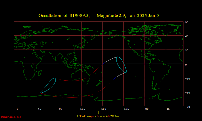 Occultation predictions of 3190SA5 Magnitude 2.9 Date 2025 Jan 3 Moon: % illumination = 12+, Solar elongation = 41 Disappearance U.T. Sun Moon CA PA WA a b Location h m s Alt Alt Az o o o m/o m/o 3 KI Kiritimati 5 57 17 21 252 45N 29 47 -0.1 +1.8 4 PF Anaa 5 42 31 18 258 60S 103 121 +0.7 +0.2 5 PF Bora Bora 5 38 14 24 259 74S 89 108 +0.8 +0.6 6 PF Fakarava 5 42 45 17 258 65S 99 117 +0.7 +0.3 7 PF Fangatau 5 45 37 12 257 58S 106 124 +0.5 +0.0 8 PF Hiva-Oa 5 47 44 8 255 75S 89 107 +0.2 +0.4 9 PF Huahine Island 5 38 40 24 259 72S 91 110 +0.8 +0.6 10 PF Makemo 5 43 55 15 257 60S 104 122 +0.6 +0.1 11 PF Manihi 5 43 10 17 257 70S 93 111 +0.6 +0.4 12 PF Mataiva 5 41 21 20 258 73S 90 108 +0.6 +0.5 13 PF Maupiti 5 37 51 25 260 75S 89 107 +0.8 +0.7 14 PF Moorea 5 39 14 22 259 68S 96 114 +0.8 +0.5 15 PF Napuka Island 5 45 36 12 256 64S 100 118 +0.4 +0.2 16 PF Nuku Hiva 5 47 50 9 255 79S 84 102 +0.2 +0.5 17 PF Puka Puka 5 46 38 10 256 58S 105 123 +0.4 +0.0 18 PF Raiatea Island 5 38 17 24 260 73S 91 109 +0.8 +0.6 19 PF Rangiroa 5 41 59 19 258 71S 92 110 +0.6 +0.5 20 PF Reao 5 49 26 8 256 39S 125 143 +0.8 -1.1 21 PF Rurutu 5 35 53 -10 25 262 55S 108 127 +1.2 +0.1 22 PF Takapoto 5 43 29 17 257 68S 95 113 +0.6 +0.4 23 PF Takaroa 5 43 44 16 257 69S 95 113 +0.5 +0.4 24 PF Tikehau 5 41 32 20 258 72S 92 110 +0.7 +0.5 25 PF Tubuai 5 38 25 -11 23 262 47S 116 134 +1.4 -0.3 26 PF Tureia 5 50 36 10 257 29S 134 152 +1.5 -2.4 Reappearance U.T. Sun Moon CA PA WA a b Location h m s Alt Alt Az o o o m/o m/o 1 CK Aitutaki 6 24 33 21 260 -47S 211 229 -0.1 +2.0 2 CK Avarua 6 19 32 23 261 -41S 205 223 -0.2 +2.2 3 KI Kiritimati 6 48 34 8 254 -78N 265 283 +0.3 +0.1 4 PF Anaa 6 22 22 8 256 -31S 195 213 -0.6 +2.4 5 PF Bora Bora 6 27 17 13 257 -42S 206 224 -0.4 +2.0 6 PF Fakarava 6 25 23 7 255 -36S 199 217 -0.5 +2.2 9 PF Huahine Island 6 26 30 12 257 -41S 204 222 -0.4 +2.1 10 PF Makemo 6 23 4 6 255 -32S 195 213 -0.6 +2.3 11 PF Manihi 6 28 56 7 255 -41S 205 223 -0.5 +2.0 12 PF Mataiva 6 29 15 9 256 -43S 206 225 -0.4 +2.0 13 PF Maupiti 6 27 29 13 257 -43S 206 225 -0.3 +2.0 14 PF Moorea 6 24 15 12 257 -37S 200 218 -0.5 +2.2 18 PF Raiatea Island 6 26 36 13 257 -41S 204 223 -0.4 +2.1 19 PF Rangiroa 6 28 38 8 256 -42S 205 223 -0.4 +2.0 21 PF Rurutu 6 12 57 17 259 -24S 187 205 -0.7 +2.8 22 PF Takapoto 6 28 2 6 255 -40S 203 221 -0.5 +2.1 23 PF Takaroa 6 28 25 6 255 -40S 203 222 -0.5 +2.0 24 PF Tikehau 6 28 33 9 256 -42S 205 223 -0.4 +2.0 25 PF Tubuai 6 8 51 16 259 -16S 180 198 -0.9 +3.2 26 PF Tureia 6 5 46 7 255 -3S 166 184 -1.6 +5.0 27 WS Faleolo 6 30 30 -8 31 259 -78S 242 260 +0.6 +1.3 28 WS Pago Pago 6 30 29 -9 29 259 -75S 238 257 +0.5 +1.4 Sites Location E. Long Latitude 1 CK Aitutaki -159 46.4 -18 49.5 2 CK Avarua -159 48.3 -21 12.2 3 KI Kiritimati -157 21.0 1 59.2 4 PF Anaa -145 30.6 -17 21.2 5 PF Bora Bora -151 45.1 -16 26.7 6 PF Fakarava -145 39.4 -16 3.3 7 PF Fangatau -140 53.2 -15 49.2 8 PF Hiva-Oa -139 0.7 - 9 46.1 9 PF Huahine Island -151 1.3 -16 41.2 10 PF Makemo -143 39.4 -16 35.1 11 PF Manihi -146 4.2 -14 26.2 12 PF Mataiva -148 43.0 -14 52.1 13 PF Maupiti -152 14.6 -16 25.6 14 PF Moorea -149 45.7 -17 29.4 15 PF Napuka Island -141 16.0 -14 10.6 16 PF Nuku Hiva -140 13.7 - 8 47.7 17 PF Puka Puka -138 48.8 -14 48.6 18 PF Raiatea Island -151 27.9 -16 43.4 19 PF Rangiroa -147 39.6 -14 57.3 20 PF Reao -136 26.4 -18 27.9 21 PF Rurutu -151 21.6 -22 26.0 22 PF Takapoto -145 15.2 -14 42.8 23 PF Takaroa -145 1.5 -14 27.3 24 PF Tikehau -148 13.8 -15 7.2 25 PF Tubuai -149 31.4 -23 21.9 26 PF Tureia -138 34.1 -20 47.0 27 WS Faleolo -172 0.5 -13 49.8 28 WS Pago Pago -170 42.6 -14 19.8