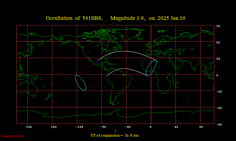 Occultation predictions of 541SB8 Magnitude 3.9 Date 2025 Jan 10 Moon: % illumination = 82+, Solar elongation = 130 Disappearance U.T. Sun Moon CA PA WA a b Location h m s Alt Alt Az o o o m/o m/o 1 AI The Valley 0 41 19 84 358 80S 90 103 +3.1 +0.0 2 AN Fort-De-France 0 50 22 79 337 62S 109 121 +3.7 -1.4 3 AN Grand-Bourg 0 48 8 81 339 68S 103 115 +3.4 -0.9 4 AN Kralendijk 0 26 8 75 33 68S 103 115 +3.6 -0.7 5 AN Oranjestad 0 41 42 83 357 78S 93 105 +3.2 -0.2 6 AN Philipsburg 0 41 11 83 359 80S 91 103 +3.1 -0.1 7 AN Pointe-A-Pitre 0 46 56 81 341 70S 100 113 +3.4 -0.7 8 AN St. Martin 0 41 22 84 358 80S 91 103 +3.1 -0.1 9 AN St.-Barthelemy 0 42 0 83 355 79S 92 104 +3.1 -0.1 10 AN Willemstad 0 23 37 74 36 70S 101 113 +3.5 -0.6 12 AW Oranjestad 0 19 51 73 42 74S 97 109 +3.3 -0.3 13 BB Bridgetown 0 58 59 76 327 52S 119 131 +4.0 -2.5 14 BF Bobo-Dioulasso 2 22 42 10 293 77S 94 106 +0.1 -0.5 15 BF Ouagadougou 2 22 34 8 293 85S 86 98 +0.1 -0.3 16 BJ Cotonou 2 24 50 1 294 71S 100 112 -0.2 -0.5 17 BJ Parakou 2 23 37 2 294 81S 90 102 +0.0 -0.3 18 BS Alice Town 0 17 0 70 88 46N 37 49 +1.1 +2.5 19 BS Andros Town 0 16 25 71 86 52N 43 55 +1.3 +2.3 20 BS Arthur'S Town 0 19 17 74 86 57N 47 59 +1.5 +2.1 21 BS Bullocks Harbour 0 18 46 72 89 49N 40 52 +1.2 +2.4 22 BS Chub Cay 0 17 57 71 88 50N 41 53 +1.3 +2.4 23 BS Clarence Bain 0 15 39 71 85 54N 44 56 +1.4 +2.2 24 BS Cockburn Town 0 20 0 75 85 61N 51 63 +1.7 +1.9 25 BS Colonel Hill 0 18 11 75 80 65N 56 68 +1.8 +1.7 26 BS Congo Town 0 15 30 71 84 54N 45 57 +1.4 +2.2 27 BS Dead Man'S Cay 0 17 22 74 82 62N 53 65 +1.7 +1.9 28 BS Duncan Town 0 14 26 72 79 64N 55 67 +1.7 +1.8 29 BS Freeport 0 19 50 71 91 45N 35 47 +1.1 +2.6 30 BS Governor'S Harbor 0 19 44 73 88 53N 44 56 +1.4 +2.2 31 BS Great Exuma 0 16 48 73 83 59N 50 62 +1.6 +2.0 32 BS Marsh Harbor 0 21 35 73 92 48N 39 51 +1.2 +2.4 33 BS Matthew Town 0 16 18 74 74 71N 62 74 +2.0 +1.5 34 BS Mayaguana 0 19 43 76 78 68N 59 71 +1.9 +1.6 35 BS Nassau 0 17 37 72 87 52N 43 55 +1.3 +2.3 36 BS New Bight 0 18 58 74 85 58N 49 61 +1.6 +2.0 37 BS Norman'S Cay 0 17 31 72 86 54N 45 57 +1.4 +2.2 38 BS North Eleuthera 0 19 40 73 89 52N 43 55 +1.4 +2.3 39 BS Rock Sound 0 19 6 73 87 55N 46 58 +1.5 +2.2 40 BS San Andros 0 16 54 71 87 51N 41 53 +1.3 +2.3 41 BS Sandy Point 0 19 58 72 90 49N 40 52 +1.3 +2.4 42 BS Spring Point 0 18 2 75 79 66N 57 69 +1.9 +1.7 43 BS Staniel Cay 0 17 10 72 85 57N 47 59 +1.5 +2.1 44 BS Stella Maris 0 17 50 74 83 61N 51 63 +1.6 +1.9 45 BS Treasure Cay 0 21 47 73 93 47N 37 49 +1.2 +2.5 46 BS West End 0 19 50 71 92 44N 34 46 +1.1 +2.6 48 CI Abidjan 2 26 48 6 294 56S 115 127 -0.2 -1.0 49 CI Bouake 2 24 49 8 294 64S 107 119 -0.1 -0.8 50 CI Daloa 2 25 44 9 294 58S 113 125 -0.1 -1.0 51 CI Korhogo 2 23 36 10 293 69S 102 114 +0.1 -0.7 52 CI Man 2 25 20 10 294 58S 113 125 -0.1 -1.0 53 CI San Pedro 2 28 7 8 294 50S 121 133 -0.3 -1.3 54 CI Yamoussoukro 2 25 34 8 294 60S 111 123 -0.1 -0.9 55 CO Arauca 0 23 9 69 32 51S 120 132 +4.9 -2.5 56 CO Armenia 0 5 18 61 44 57S 114 126 +4.3 -1.7 57 CO Bahia Solano 23 57 39 -12 60 50 70S 101 113 +3.3 -0.5 58 CO Barrancabermeja 0 9 48 65 43 62S 109 121 +3.9 -1.2 59 CO Barranquilla 0 4 56 66 52 79S 91 103 +2.9 +0.1 60 CO Bogota 0 12 15 64 40 51S 120 132 +4.9 -2.4 61 CO Bucaramanga 0 12 12 66 42 60S 111 123 +4.1 -1.3 62 CO Buenaventura 0 1 15 59 46 58S 113 125 +4.1 -1.5 63 CO Cali 0 4 16 60 44 54S 117 129 +4.5 -2.0 64 CO Carepa 23 59 17 62 51 74S 97 109 +3.1 -0.2 65 CO Cartagena 0 2 45 65 53 80S 91 103 +2.9 +0.1 66 CO Cartago 0 4 8 61 45 59S 112 124 +4.1 -1.5 67 CO Condoto 0 0 56 60 47 63S 108 120 +3.7 -1.1 68 CO Corozal 0 3 25 65 51 75S 96 108 +3.1 -0.1 69 CO Cucuta 0 13 52 67 41 62S 109 121 +4.0 -1.2 70 CO El Banco 0 7 46 66 47 71S 100 112 +3.4 -0.4 71 CO El-Yopal 0 19 38 66 35 47S 124 136 +5.4 -3.1 72 CO Florencia 0 16 14 61 37 36S 135 147 +8.4 -7.2 73 CO Girardot 0 10 10 63 41 52S 119 131 +4.8 -2.4 74 CO Guapi 23 59 30 -10 57 46 55S 116 128 +4.3 -1.8 75 CO Guaymaral 0 12 24 64 40 52S 119 131 +4.9 -2.4 76 CO Ibague 0 8 9 62 42 54S 117 129 +4.6 -2.1 77 CO Ipiales 0 5 27 -11 57 42 44S 127 139 +6.0 -4.0 78 CO La Mina 0 12 2 69 48 75S 96 108 +3.2 -0.2 79 CO Magangue 0 4 52 65 50 74S 97 109 +3.2 -0.2 80 CO Manizales 0 5 39 62 44 58S 113 125 +4.2 -1.5 81 CO Mariquita 0 7 49 63 43 57S 114 126 +4.3 -1.7 82 CO Medellin 0 3 47 62 46 64S 107 119 +3.7 -0.9 83 CO Monteria 0 1 51 63 51 75S 96 108 +3.1 -0.1 84 CO Neiva 0 11 28 61 39 46S 125 137 +5.6 -3.5 85 CO Ocana 0 10 16 67 44 66S 105 117 +3.7 -0.8 86 CO Otu 0 6 23 64 46 65S 106 118 +3.7 -0.9 87 CO Pasto 0 5 36 -12 58 42 46S 125 137 +5.6 -3.5 88 CO Pereira 0 4 52 61 44 58S 113 125 +4.1 -1.5 89 CO Pitalito 0 11 9 60 39 42S 129 141 +6.4 -4.5 90 CO Popayan 0 5 50 59 42 49S 122 134 +5.1 -2.8 91 CO Providencia 23 51 21 -9 59 64 78N 68 80 +1.8 +1.2 92 CO Puerto Asis 0 16 14 60 37 30S 141 153 +9.9 +9.9 93 CO Puerto Bolivar 0 13 32 71 48 77S 94 106 +3.1 +0.0 94 CO Quibdo 0 0 33 61 48 65S 106 118 +3.6 -0.8 95 CO Rio Hacha 0 10 37 69 49 77S 94 106 +3.1 +0.0 96 CO Rio Negro 0 4 27 63 46 63S 108 120 +3.8 -1.0 97 CO San Andres Island 23 49 48 -8 58 64 79N 70 82 +1.8 +1.1 98 CO San Vincente De Caguan 0 18 51 62 35 35S 136 148 +8.5 -7.4 99 CO Santa Marta 0 6 36 67 52 79S 92 104 +3.0 +0.1 100 CO Saravena 0 18 2 68 37 55S 116 128 +4.5 -2.0 101 CO Tame 0 19 43 68 35 52S 119 131 +4.8 -2.4 102 CO Trinidad 0 23 26 67 32 45S 126 138 +5.8 -3.7 103 CO Tulua 0 3 55 60 44 57S 114 126 +4.3 -1.7 104 CO Tumaco 23 57 16 -9 56 46 55S 116 128 +4.3 -1.9 105 CO Valledupar 0 9 44 68 48 74S 97 109 +3.2 -0.2 106 CO Villavicencio 0 16 46 64 36 46S 125 137 +5.7 -3.5 126 CU Baracoa Playa 0 6 59 64 81 47N 38 50 +1.0 +2.4 127 CU Bayamo 0 9 49 70 74 67N 58 70 +1.8 +1.7 128 CU Caibarien 0 9 24 68 80 55N 46 58 +1.3 +2.1 129 CU Camaguey 0 9 34 69 77 62N 53 65 +1.6 +1.9 130 CU Cayo 0 4 52 65 78 54N 44 56 +1.2 +2.2 131 CU Ciego De Avila 0 9 20 68 79 58N 49 61 +1.4 +2.0 132 CU Cienfuegos 0 7 25 66 79 54N 45 57 +1.3 +2.1 133 CU Cunagua 0 10 52 69 80 58N 49 61 +1.4 +2.0 134 CU Florida 0 9 12 6