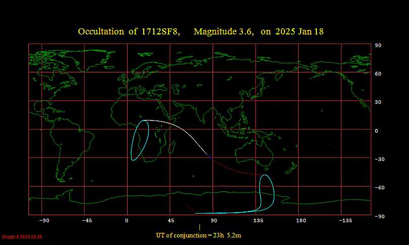 Occultation predictions of 1712SF8 Magnitude 3.6 Date 2025 Jan 18 Moon: % illumination = 76-, Solar elongation = 121 Disappearance U.T. Sun Moon CA PA WA a b Location h m s Alt Alt Az o o o m/o m/o 23 BI Bujumbura 20 29 28 7 88 -80N 103 81 +0.3 -0.6 24 BW Francistown 20 56 40 11 84 -50S 153 131 +0.3 -2.4 25 BW Gaberone 21 5 7 11 83 -40S 163 141 +0.2 -2.8 26 BW Jwaneng 21 4 57 10 84 -40S 163 141 +0.2 -2.8 27 BW Kasane 20 48 37 7 86 -58S 144 123 +0.2 -2.1 28 BW Maun 20 52 54 6 86 -52S 151 129 +0.2 -2.3 29 BW Orapa 20 56 24 9 85 -49S 154 132 +0.2 -2.4 30 BW Selebi-Phikwe 20 59 2 12 84 -48S 155 133 +0.3 -2.5 31 BX Mmabatho 21 8 32 11 83 -36S 166 145 +0.2 -2.9 32 BX Thaba Nchu 21 19 34 14 80 -27S 176 154 +0.1 -3.3 50 ET Gambella 20 44 39 16 91 -19N 43 21 +2.0 +9.6 51 ET Jimma 20 44 52 19 91 -22N 45 23 +2.1 +8.2 63 KE Eldoret 20 30 48 13 88 -65N 88 66 +0.6 +0.1 64 KE Garissa 20 34 2 19 88 -66N 89 67 +0.8 +0.0 65 KE Isiolo 20 32 25 16 88 -64N 87 65 +0.7 +0.1 66 KE Kakamega 20 30 34 13 88 -66N 89 67 +0.6 +0.1 67 KE Kisumu 20 30 34 13 88 -67N 90 68 +0.5 +0.0 68 KE Kitale 20 30 46 13 89 -63N 86 64 +0.6 +0.2 69 KE Lamu 20 35 22 20 87 -71N 94 73 +0.9 -0.3 70 KE Lodwar 20 32 22 14 89 -54N 77 55 +0.7 +0.8 71 KE Lokichoggio 20 32 36 13 89 -49N 72 51 +0.7 +1.2 72 KE Loyangalani 20 32 53 15 89 -55N 78 56 +0.8 +0.8 73 KE Malindi 20 35 3 19 87 -75N 98 76 +0.8 -0.5 74 KE Mandera 20 39 31 22 90 -45N 68 46 +1.4 +1.8 75 KE Marsabit 20 33 32 17 89 -56N 79 57 +0.8 +0.7 76 KE Meru 20 32 52 17 88 -64N 87 65 +0.8 +0.1 77 KE Mombasa 20 35 7 19 87 -78N 101 79 +0.8 -0.6 78 KE Moyale Lower 20 35 38 19 89 -50N 73 51 +1.0 +1.2 79 KE Nairobi 20 31 56 15 88 -70N 94 72 +0.6 -0.2 80 KE Naivasha 20 31 33 15 88 -69N 92 70 +0.6 -0.1 81 KE Nanyuki 20 31 56 16 88 -66N 89 67 +0.7 +0.0 82 KE Nyeri 20 31 54 15 88 -67N 90 68 +0.7 +0.0 83 KE Wajir 20 35 6 19 89 -57N 80 58 +1.0 +0.6 84 KM Anjouan 20 48 3 26 82 -83S 120 98 +0.9 -1.5 85 KM Moheli 20 47 42 25 82 -82S 121 99 +0.9 -1.6 86 KM Moroni 20 46 7 24 83 -83S 120 98 +0.9 -1.5 87 LS Maseru 21 20 9 15 79 -27S 176 154 +0.2 -3.3 88 MG Ambilobe 20 54 24 32 80 -85S 118 97 +1.2 -1.5 89 MG Ampampamena 20 54 30 31 80 -83S 120 98 +1.1 -1.6 90 MG Analalava 20 55 21 30 79 -80S 123 101 +1.1 -1.7 91 MG Andapa 20 57 30 33 78 -82S 121 99 +1.2 -1.7 92 MG Antalaha 20 58 57 34 78 -82S 121 99 +1.2 -1.7 93 MG Antananarivo 21 2 55 31 76 -70S 133 111 +1.0 -2.0 94 MG Antsiranana 20 53 32 32 80 -87S 116 94 +1.2 -1.5 95 MG Antsohihy 20 56 4 31 79 -79S 124 102 +1.1 -1.7 96 MG Besalampy 20 56 4 27 79 -72S 131 110 +0.9 -1.9 97 MG Farafangana 21 11 53 32 72 -62S 141 119 +0.9 -2.3 98 MG Fianarantsoa 21 8 8 31 74 -64S 139 117 +0.9 -2.2 99 MG Mahajanga 20 55 45 29 79 -76S 127 105 +1.0 -1.8 100 MG Manakara 21 10 30 32 73 -63S 139 118 +0.9 -2.2 101 MG Mananjary 21 8 51 33 74 -66S 137 115 +1.0 -2.2 102 MG Maroantsetra 20 58 54 33 78 -80S 123 101 +1.2 -1.7 103 MG Miandrivazo 21 2 40 29 77 -66S 137 115 +0.9 -2.1 104 MG Morombe 21 5 51 27 76 -59S 144 122 +0.7 -2.3 105 MG Morondava 21 3 14 28 77 -63S 140 118 +0.8 -2.2 106 MG Nosy-Be 20 53 52 31 80 -83S 120 98 +1.1 -1.6 107 MG Sainte Marie 21 2 2 33 76 -76S 127 105 +1.1 -1.9 108 MG Sambava 20 57 36 33 78 -83S 120 98 +1.2 -1.6 109 MG Toamasina 21 3 32 33 76 -74S 129 107 +1.1 -2.0 110 MG Tolagnaro 21 16 22 32 71 -56S 147 125 +0.8 -2.4 111 MG Toliara 21 9 53 28 75 -56S 147 125 +0.7 -2.4 112 MG Vohemar 20 55 56 33 79 -85S 118 96 +1.2 -1.5 113 MU Bel-Air 21 18 19 43 67 -80S 123 101 +1.6 -1.9 114 MU Plaisance 21 18 56 43 67 -80S 123 101 +1.6 -1.9 115 MU Port Louis 21 17 55 43 68 -80S 123 101 +1.6 -1.9 116 MU Rodriguez Island 21 28 22 50 61 -88N 111 89 +2.2 -1.5 117 MW Blantyre 20 47 39 16 84 -67S 136 114 +0.5 -1.9 118 MW Karonga 20 37 41 13 86 -82S 121 99 +0.5 -1.4 119 MW Kasungu 20 42 9 14 85 -74S 129 108 +0.4 -1.7 120 MW Mzuzu 20 39 52 14 85 -78S 125 103 +0.5 -1.5 121 MZ Beira 20 56 15 18 82 -57S 146 124 +0.5 -2.3 122 MZ Chimoio 20 54 8 16 83 -58S 145 123 +0.4 -2.2 123 MZ Cuamba 20 46 52 18 83 -70S 133 111 +0.5 -1.8 124 MZ Estima 20 46 47 14 84 -66S 137 115 +0.4 -1.9 125 MZ Inhambane 21 6 23 20 79 -48S 155 134 +0.4 -2.6 126 MZ Lichinga 20 43 25 16 84 -74S 129 107 +0.5 -1.7 127 MZ Lumbo 20 49 53 22 82 -72S 130 109 +0.7 -1.8 128 MZ Maputo 21 10 48 18 79 -40S 163 141 +0.3 -2.8 129 MZ Marrupa 20 44 37 18 84 -75S 128 106 +0.6 -1.7 130 MZ Mocimboa Da Praia 20 43 31 21 84 -82S 121 100 +0.7 -1.5 131 MZ Mueda 20 43 23 20 84 -80S 123 101 +0.7 -1.5 132 MZ Nacala 20 48 55 22 82 -74S 129 107 +0.7 -1.8 133 MZ Nampula 20 49 1 21 82 -71S 132 110 +0.7 -1.9 134 MZ Pemba 20 46 10 22 83 -77S 126 104 +0.7 -1.7 135 MZ Quelimane 20 53 0 19 82 -63S 140 118 +0.5 -2.1 136 MZ Songo 20 46 32 14 84 -67S 136 115 +0.4 -1.9 137 MZ Tete 20 47 53 15 84 -66S 137 115 +0.4 -2.0 138 MZ Ulongwe 20 45 32 15 84 -69S 133 112 +0.5 -1.8 139 MZ Vilankulu 21 1 37 19 80 -52S 151 129 +0.5 -2.5 140 RE Cilaos 21 17 0 41 68 -75S 128 106 +1.4 -2.0 141 RE St Philippe 21 17 51 41 68 -75S 128 106 +1.4 -2.0 142 RE St.-Denis 21 16 33 41 68 -76S 127 105 +1.4 -2.0 143 RE St.-Pierre 21 17 20 41 68 -75S 128 106 +1.4 -2.0 144 RW Gisenyi 20 28 37 7 88 -74N 97 75 +0.3 -0.3 145 RW Kamembe 20 28 52 7 88 -77N 100 78 +0.3 -0.5 146 RW Kigali 20 28 59 8 88 -75N 98 76 +0.3 -0.4 147 SC Alphonse 20 52 41 36 83 -74N 97 75 +1.7 -0.6 148 SC Coetivy 20 59 37 41 82 -69N 92 70 +2.2 -0.4 149 SC Desroches 20 53 45 37 84 -68N 91 70 +1.9 -0.3 150 SC Farquhar 20 53 5 34 81 -85N 108 86 +1.4 -1.2 151 SC Mahe 20 57 36 40 84 -61N 84 63 +2.3 +0.1 152 SC Praslin 20 58 3 40 84 -60N 83 61 +2.4 +0.3 153 SD Juba 20 31 51 10 89 -47N 70 48 +0.5 +1.3 154 SD Wau 20 36 19 8 89 -30N 54 32 +0.4 +3.5 155 SO Baidoa 20 40 44 24 90 -47N 70 48 +1.5 +1.5 156 SO Kismayu 20 36 44 22 88 -63N 86 65 +1.1 +0.2 157 SO Mogadishu 20 41 52 26 89 -50N 73 51 +1.6 +1.2 158 SZ Manzini 21 12 5 17 79 -38S 165 143 +0.3 -2.9 161 TZ Arusha 20 32 36 15 87 -78N 101 79 +0.6 -0.5 162 TZ Dar Es Salaam 20 37 4 19 86 -87N 110 88 +0.7 -1.0 163 TZ Dodoma 20 34 11 15 87 -87N 110 88 +0.5 -0.9 164 TZ Iringa 20 3