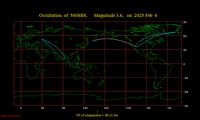 Occultation predictions of 560SB8 Magnitude 3.6 Date 2025 Feb 6 Moon: % illumination = 61+, Solar elongation = 103 Disappearance U.T. Sun Moon CA PA WA a b Location h m s Alt Alt Az o o o m/o m/o 1 CA Abbotsford 8 56 6 17 287 50S 119 130 -0.3 -2.1 2 CA Alert 8 8 17 18 321 39N 27 39 +0.0 -1.2 3 CA Armstrong 8 41 58 1 308 89S 80 92 -0.4 -0.9 4 CA Atikokan 8 44 39 1 307 83S 85 97 -0.5 -1.0 5 CA Baker Lake 8 29 48 13 298 74N 62 74 -0.1 -1.1 6 CA Brandon 8 47 0 6 301 77S 92 103 -0.4 -1.2 7 CA Broughton Island 8 22 4 6 324 45N 34 45 -0.2 -0.6 8 CA Buffalo Narrows 8 41 43 14 293 81S 87 99 -0.2 -1.4 9 CA Burwash 8 30 37 32 263 72S 97 108 +0.3 -1.8 10 CA Calgary 8 49 58 14 291 65S 103 115 -0.3 -1.6 11 CA Cambridge Bay 8 24 25 19 288 72N 60 72 +0.0 -1.2 12 CA Campbell River 8 54 54 20 284 49S 119 131 -0.2 -2.2 13 CA Cape Dorset 8 26 49 7 315 59N 47 59 -0.2 -0.8 14 CA Castlegar 8 54 9 15 290 56S 112 124 -0.3 -1.9 15 CA Chilliwack 8 55 40 17 287 51S 118 129 -0.3 -2.1 16 CA Churchill 8 35 27 9 302 81N 70 81 -0.2 -1.0 17 CA Clyde River 8 20 39 10 320 46N 35 46 -0.1 -0.8 18 CA Cold Lake 8 44 5 14 292 76S 92 104 -0.2 -1.4 19 CA Comox 8 55 20 19 285 49S 119 131 -0.3 -2.2 20 CA Coppermine 8 25 28 22 280 80N 68 80 +0.1 -1.3 21 CA Coral Harbour 8 51 45 15 290 61S 107 119 -0.3 -1.7 22 CA Coronation 8 47 47 13 292 70S 98 110 -0.2 -1.5 23 CA Cranbrook 8 52 59 14 291 59S 109 121 -0.3 -1.8 24 CA Dauphin 8 45 35 7 301 79S 89 101 -0.4 -1.2 25 CA Dawson 8 25 56 32 260 79S 90 101 +0.4 -1.6 26 CA Dawson Creek 8 43 13 20 284 71S 98 110 -0.1 -1.7 27 CA Dease Lake 8 38 7 26 274 69S 99 111 +0.1 -1.8 28 CA Dryden 8 44 4 2 306 84S 84 96 -0.4 -1.0 29 CA Edmonton 8 45 58 15 290 71S 97 109 -0.2 -1.5 30 CA Edson 8 46 28 17 288 69S 100 111 -0.2 -1.6 31 CA Eskimo Point 8 32 59 10 301 77N 66 77 -0.2 -1.0 32 CA Estevan 8 49 7 7 299 72S 96 108 -0.4 -1.3 33 CA Eureka 8 11 43 19 300 48N 37 48 +0.0 -1.2 34 CA Faro 8 30 46 29 267 77S 91 103 +0.3 -1.7 35 CA Flin Flon 8 41 46 10 298 85S 84 95 -0.3 -1.2 36 CA Fort Chipewyan 8 37 58 17 289 85S 83 95 -0.1 -1.4 37 CA Fort McMurray 8 40 58 16 290 80S 88 100 -0.1 -1.4 38 CA Fort McPherson 8 22 9 30 261 89S 79 91 +0.3 -1.4 39 CA Fort Nelson 8 38 4 22 280 76S 92 104 +0.1 -1.6 40 CA Fort Resolution 8 34 41 19 286 88S 81 92 +0.0 -1.4 41 CA Fort Saint John 8 42 26 20 283 71S 97 109 +0.0 -1.7 42 CA Fort Simpson 8 33 30 23 279 84S 85 96 +0.1 -1.5 43 CA Fort Smith 8 36 16 18 288 87S 82 93 +0.0 -1.4 44 CA Gillam 8 38 5 8 303 86N 74 86 -0.3 -1.0 45 CA Gjoa Haven 8 24 57 16 297 67N 55 67 +0.0 -1.1 46 CA Grande Prairie 8 44 5 19 285 70S 98 110 -0.1 -1.7 47 CA Hall Beach 8 23 42 11 309 57N 45 57 -0.1 -0.9 48 CA Hay River 8 35 10 20 284 86S 83 95 +0.0 -1.4 49 CA High Level 8 38 28 20 284 80S 89 100 +0.0 -1.5 50 CA Holman Island 8 21 10 24 275 76N 64 76 +0.1 -1.3 51 CA Hudson Bay 8 44 14 9 298 81S 88 100 -0.3 -1.2 52 CA Inuvik 8 21 15 29 262 88N 77 88 +0.3 -1.4 53 CA Iqaluit 8 25 21 4 321 53N 41 53 -0.2 -0.6 54 CA Kamloops 8 52 15 17 287 57S 111 123 -0.2 -1.9 55 CA Kelowna 8 53 25 16 288 56S 112 124 -0.3 -1.9 56 CA Kenora 8 44 51 3 305 82S 86 98 -0.4 -1.0 57 CA Kindersley 8 48 2 12 294 71S 97 109 -0.3 -1.5 58 CA Kuujjuararapik 8 33 28 0 315 72N 61 72 -0.4 -0.7 59 CA La Ronge 8 42 2 12 295 83S 86 98 -0.2 -1.3 60 CA Lethbridge 8 52 2 12 293 63S 106 117 -0.3 -1.6 61 CA Lloydminster 8 45 39 13 293 74S 94 106 -0.2 -1.4 62 CA Lynn Lake 8 39 1 11 298 90S 79 91 -0.2 -1.2 63 CA Mayo 8 27 40 30 264 79S 89 101 +0.3 -1.6 64 CA Meadow Lake 8 44 7 13 293 77S 91 103 -0.2 -1.4 65 CA Medicine Hat 8 50 43 11 294 66S 103 114 -0.3 -1.5 66 CA Moose Jaw 8 48 34 9 297 72S 96 108 -0.3 -1.4 67 CA Nanaimo 8 56 31 18 286 48S 120 132 -0.3 -2.2 68 CA Nanisivik 8 19 48 15 305 54N 43 54 +0.0 -1.1 69 CA Norman Wells 8 27 20 26 271 88S 80 92 +0.2 -1.5 70 CA North Battleford 8 45 58 12 294 75S 94 105 -0.3 -1.4 71 CA Old Crow 8 20 15 32 256 87S 81 93 +0.4 -1.4 72 CA Pangnirtung 8 23 16 5 323 48N 36 48 -0.2 -0.6 73 CA Peace River 8 42 16 19 286 74S 94 106 -0.1 -1.6 74 CA Pelly Bay 8 24 45 14 302 63N 51 63 -0.1 -1.0 75 CA Penticton 8 54 22 16 288 55S 114 126 -0.3 -1.9 76 CA Pickle Lake 8 41 27 2 307 90S 79 91 -0.4 -0.9 77 CA Pitt Meadows 8 55 48 18 287 50S 118 130 -0.3 -2.1 78 CA Pond Inlet 8 19 41 13 311 51N 39 51 -0.1 -1.0 79 CA Port Hardy 8 53 43 21 282 49S 119 131 -0.2 -2.3 80 CA Portage-La-Prairie 8 46 20 5 302 79S 90 102 -0.4 -1.2 81 CA Prince Albert 8 44 41 11 296 78S 90 102 -0.3 -1.3 82 CA Prince George 8 46 37 20 283 64S 105 117 -0.1 -1.8 83 CA Prince Pupert 8 46 7 25 277 57S 111 123 +0.0 -2.1 84 CA Princeton 8 54 36 17 288 54S 115 127 -0.3 -2.0 85 CA Quesnel 8 48 12 20 284 61S 107 119 -0.1 -1.9 86 CA Rankin Inlet 8 30 53 11 302 73N 61 73 -0.2 -1.0 87 CA Red Deer Industrial 8 48 13 15 291 68S 101 112 -0.2 -1.6 88 CA Regina 8 48 7 9 298 73S 95 107 -0.3 -1.3 89 CA Repulse Bay 8 26 25 11 306 63N 52 63 -0.1 -1.0 90 CA Resolute 8 17 56 18 294 58N 46 58 +0.0 -1.2 91 CA Rocky Mountain House 8 48 2 15 290 67S 101 113 -0.2 -1.6 92 CA Sachs Harbour 8 18 15 26 267 77N 65 77 +0.2 -1.3 93 CA Sandspit 8 48 16 25 277 53S 115 127 +0.0 -2.2 94 CA Saskatoon 8 46 24 11 296 75S 93 105 -0.3 -1.4 95 CA Sioux Lookout 8 43 26 2 306 85S 83 95 -0.4 -1.0 96 CA Slave Lake 8 43 29 17 288 74S 94 106 -0.1 -1.5 97 CA Smithers 8 45 3 23 279 62S 106 118 +0.0 -1.9 98 CA Spence Bay 8 23 51 15 298 64N 53 64 +0.0 -1.1 99 CA Swift Current 8 49 22 10 296 70S 99 110 -0.3 -1.4 100 CA Terrace 8 45 44 24 278 60S 109 120 +0.0 -2.0 101 CA Teslin 8 34 28 28 270 72S 96 108 +0.2 -1.8 102 CA Thompson 8 39 30 9 300 90N 78 90 -0.3 -1.1 103 CA Tofino 8 57 1 19 285 46S 123 134 -0.3 -2.3 104 CA Tuktoyaktuk 8 19 49 29 261 85N 74 86 +0.3 -1.4 105 CA Vancouver 8 55 59 18 286 49S 119 131 -0.3 -2.2 106 CA Vermillion 8 45 44 14 292 74S 95 107 -0.2 -1.5 107 CA Victoria 8 57 17 18 287 47S 121 133 -0.3 -2.2 108 CA Watson Lake 8 35 17 26 273 75S 94 105 +0.2 -1.7 109 CA Whitecourt 8 45 24 17 288 71S 98 109 -0.1 -1.6 110 CA Whitehorse 8 32 58 29 267 72S 96 108 +0.3 -1.8 111 CA Williams Lake 8 49 44 19