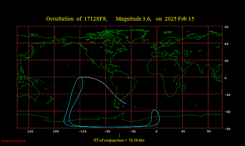 Occultation predictions of 1712SF8 Magnitude 3.6 Date 2025 Feb 15 Moon: % illumination = 93-, Solar elongation = 150 Disappearance U.T. Sun Moon CA PA WA a b Location h m s Alt Alt Az o o o m/o m/o 1 AQ Isla Rey Jorge 7 11 39 -7 25 342 -89N 111 89 +1.0 +0.2 2 AR Chosmadal 7 0 22 51 356 -42N 65 43 +5.5 +2.7 3 AR Comodoro Rivadavia 7 1 4 43 353 -65N 87 65 +2.5 +0.4 4 AR Cutralco 7 1 36 49 354 -45N 68 46 +4.7 +2.1 5 AR El Bolson 6 51 6 47 2 -64N 86 65 +2.8 +0.1 6 AR El Maiten 6 52 8 47 1 -63N 86 64 +2.9 +0.2 7 AR Esquel 6 52 4 46 1 -66N 88 66 +2.7 +0.1 8 AR Fuerte Gral Roca 7 10 24 49 349 -36N 59 37 +6.6 +4.6 9 AR Jose De San Martin 6 53 47 45 359 -67N 89 68 +2.6 +0.0 10 AR Lago Argentino 6 51 57 38 2 -84N 106 85 +1.7 -0.5 11 AR Las Heras 6 57 19 42 356 -70N 92 70 +2.3 +0.0 12 AR Neuquen 7 7 17 49 350 -40N 62 40 +5.7 +3.5 13 AR Puerto Deseado 7 4 2 40 350 -66N 89 67 +2.3 +0.4 14 AR Puerto Madryn 7 11 26 45 345 -47N 69 47 +3.9 +2.1 15 AR Rio Gallegos 6 57 26 37 357 -82N 104 82 +1.7 -0.3 16 AR Rio Grande 7 0 31 35 354 -84N 106 84 +1.5 -0.2 17 AR Rio Turbio 6 52 45 37 2 -86N 109 87 +1.6 -0.6 18 AR San Carlos De Bariloch 6 52 23 47 1 -61N 83 61 +3.1 +0.3 19 AR San Julian 6 59 48 39 354 -74N 97 75 +2.0 +0.0 20 AR San Martin Des Andes 6 52 55 48 1 -57N 80 58 +3.4 +0.6 21 AR Santa Cruz 6 58 23 38 355 -77N 100 78 +1.9 -0.2 22 AR Trelew 7 10 0 45 346 -49N 72 50 +3.6 +1.7 23 AR Ushuaia 7 0 2 34 355 -86N 109 87 +1.4 -0.3 24 CL Alto Palena 6 50 21 45 2 -69N 91 70 +2.5 -0.1 25 CL Ancud 6 44 55 46 7 -70N 92 70 +2.6 -0.3 26 CL Balmaceda 6 51 10 43 2 -74N 97 75 +2.2 -0.3 27 CL Castro 6 45 12 46 7 -71N 93 71 +2.5 -0.3 28 CL Chaiten 6 48 0 46 5 -69N 92 70 +2.5 -0.2 29 CL Chile Chico 6 51 19 42 2 -76N 98 76 +2.1 -0.3 30 CL Chillan 6 52 59 52 2 -47N 69 48 +4.8 +1.7 31 CL Concepcion 6 48 12 52 6 -52N 75 53 +4.1 +0.9 32 CL Coyhaique 6 50 9 43 3 -74N 97 75 +2.2 -0.3 33 CL Curico 7 5 12 54 356 -28N 51 29 +9.9 +9.9 34 CL Easter Island 5 22 38 25 75 -77S 125 103 +0.8 -1.9 35 CL Los Angeles 6 50 13 51 4 -52N 75 53 +4.1 +1.0 36 CL Osorno 6 46 47 48 6 -64N 87 65 +2.9 +0.0 37 CL Porvenir 6 56 29 35 358 -86N 109 87 +1.5 -0.4 38 CL Puerto Montt 6 46 42 47 6 -67N 89 67 +2.7 -0.1 39 CL Puerto Williams 7 1 0 33 354 -86N 108 86 +1.4 -0.3 40 CL Punta Arenas 6 55 34 36 359 -87N 109 87 +1.5 -0.5 41 CL Temuco 6 48 29 50 5 -58N 80 58 +3.5 +0.4 42 CL Valdivia 6 46 45 49 6 -62N 84 62 +3.1 +0.1 43 FK Mount Pleasant 7 17 14 34 337 -63N 86 64 +2.0 +1.0 44 FK Stanley 7 18 40 34 336 -62N 84 62 +2.0 +1.1 Reappearance U.T. Sun Moon CA PA WA a b Location h m s Alt Alt Az o o o m/o m/o 2 AR Chosmadal 7 30 39 50 344 0N 23 1 -2.3 -5.8 3 AR Comodoro Rivadavia 7 58 43 40 334 28N 355 333 +0.2 -2.3 4 AR Cutralco 7 36 42 48 341 4N 18 357 -1.6 -4.9 5 AR El Bolson 7 48 35 45 341 24N 358 336 +0.1 -2.7 6 AR El Maiten 7 48 53 45 341 24N 359 337 +0.0 -2.8 7 AR Esquel 7 51 9 44 340 27N 356 334 +0.2 -2.6 8 AR Fuerte Gral Roca 7 33 18 48 340 -5N 27 5 -3.5 -7.3 9 AR Jose De San Martin 7 54 3 42 339 29N 354 332 +0.2 -2.4 10 AR Lago Argentino 8 4 4 36 340 50N 333 311 +0.7 -1.2 11 AR Las Heras 7 59 58 39 336 33N 349 327 +0.4 -2.0 12 AR Neuquen 7 34 30 48 340 -1N 24 2 -2.6 -6.2 13 AR Puerto Deseado 8 3 19 37 331 31N 352 330 +0.3 -2.0 14 AR Puerto Madryn 7 48 51 42 333 8N 14 352 -1.0 -4.3 15 AR Rio Gallegos 8 7 39 34 335 48N 334 312 +0.7 -1.2 16 AR Rio Grande 8 10 57 -11 32 333 52N 331 309 +0.7 -0.9 17 AR Rio Turbio 8 5 34 35 339 53N 330 308 +0.8 -1.1 18 AR San Carlos De Bariloch 7 46 21 46 341 21N 2 340 -0.1 -3.0 19 AR San Julian 8 5 24 36 333 39N 343 321 +0.5 -1.6 20 AR San Martin Des Andes 7 42 54 47 342 17N 6 344 -0.4 -3.4 21 AR Santa Cruz 8 6 6 36 334 43N 340 318 +0.6 -1.4 22 AR Trelew 7 50 50 42 333 11N 11 349 -0.7 -3.8 23 AR Ushuaia 8 11 26 -10 31 334 55N 328 306 +0.7 -0.8 24 CL Alto Palena 7 52 37 43 341 30N 352 330 +0.3 -2.3 25 CL Ancud 7 47 56 46 344 30N 353 331 +0.3 -2.4 26 CL Balmaceda 7 57 36 41 340 37N 346 324 +0.5 -1.9 27 CL Castro 7 49 21 45 344 32N 351 329 +0.4 -2.3 28 CL Chaiten 7 50 43 44 342 30N 352 330 +0.3 -2.4 29 CL Chile Chico 7 58 47 40 339 39N 344 322 +0.5 -1.8 30 CL Chillan 7 29 33 51 347 4N 19 357 -1.6 -4.9 31 CL Concepcion 7 31 44 51 348 10N 13 351 -1.0 -4.2 32 CL Coyhaique 7 56 45 41 340 37N 346 324 +0.5 -1.9 33 CL Curico 7 14 40 53 352 -15N 38 16 +9.9 +9.9 34 CL Easter Island 6 38 30 40 62 72N 310 288 +1.3 -2.0 35 CL Los Angeles 7 33 44 50 346 10N 13 351 -0.9 -4.1 36 CL Osorno 7 44 47 47 344 24N 359 337 +0.1 -2.8 37 CL Porvenir 8 8 37 33 337 54N 329 307 +0.7 -0.9 38 CL Puerto Montt 7 46 59 46 344 27N 356 334 +0.2 -2.6 39 CL Puerto Williams 8 11 58 -10 31 333 54N 328 306 +0.7 -0.8 40 CL Punta Arenas 8 7 59 33 337 54N 329 307 +0.8 -0.9 41 CL Temuco 7 39 1 49 345 16N 6 345 -0.4 -3.5 42 CL Valdivia 7 41 58 48 345 21N 2 340 -0.1 -3.1 43 FK Mount Pleasant 8 12 55 -7 30 322 32N 351 329 +0.2 -1.7 44 FK Stanley 8 12 48 -7 30 321 30N 352 330 +0.2 -1.8 45 PF Anaa 5 55 54 0 88 76N 306 284 +0.1 -1.6 46 PF Fangatau 5 53 58 4 87 72N 310 288 +0.2 -1.7 47 PF Hiva-Oa 5 43 10 4 88 55N 328 306 +0.1 -2.1 48 PF Makemo 5 54 50 2 88 74N 308 286 +0.1 -1.6 49 PF Mururoa 6 3 47 8 85 86N 296 274 +0.3 -1.5 50 PF Napuka Island 5 51 9 3 87 68N 315 293 +0.1 -1.7 51 PF Nuku Hiva 5 41 0 2 88 51N 331 309 +0.1 -2.2 52 PF Puka Puka 5 52 39 6 87 69N 313 291 +0.2 -1.7 53 PF Reao 5 59 22 10 85 78N 304 283 +0.3 -1.6 54 PF Totegegie 6 7 13 13 83 88N 294 272 +0.5 -1.5 55 PF Tureia 6 2 20 8 85 84N 298 277 +0.3 -1.5 Sites Location E. Long Latitude 1 AQ Isla Rey Jorge - 58 59.2 -62 11.4 2 AR Chosmadal - 70 13.3 -37 26.7 3 AR Comodoro Rivadavia - 67 27.9 -45 47.1 4 AR Cutralco - 69 15.9 -38 56.4 5 AR El Bolson - 71 31.9 -41 56.6 6 AR El Maiten - 71 10.2 -42 1.8 7 AR Esquel - 71 8.4 -42 54.5 8 AR Fuerte Gral Roca - 67 37.2 -39 0.0 9 AR Jose De San Martin - 70 27.6 -44 2.9 10 AR Lago Argentino - 72 14.9 -50 20.1 11 AR Las Heras - 68 57.9 -46 32.3 12 AR Neuquen - 68 9.3 -38 56.9 13 AR Puerto Deseado - 65 54.2 -47 44.1 14 AR Puerto Madryn - 65 6.2 -42 45.5 15 AR Rio Gallegos - 69 18