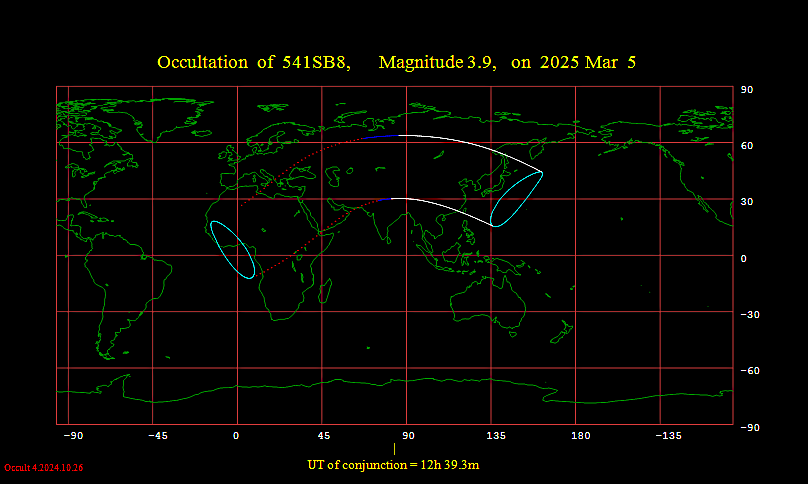 Occultation predictions of 541SB8 Magnitude 3.9 Date 2025 Mar 5 Moon: % illumination = 37+, Solar elongation = 75 Disappearance U.T. Sun Moon CA PA WA a b Location h m s Alt Alt Az o o o m/o m/o 1 CN Beijing 13 22 42 35 274 80S 86 98 +0.8 -1.1 2 CN Changcha 13 43 56 31 283 29S 137 149 +0.0 -3.6 3 CN Chengdu 13 32 20 42 277 29S 137 149 +0.6 -4.1 4 CN Chongqing 13 36 58 39 279 27S 139 151 +0.3 -4.1 5 CN Dalian 13 27 14 30 279 81S 85 97 +0.6 -1.1 6 CN Fuzhou 13 50 23 24 287 28S 138 150 -0.4 -3.3 7 CN Hailar 13 18 58 34 270 67N 53 65 +0.8 -0.3 8 CN Hangzhou 13 39 34 27 284 49S 117 129 +0.2 -2.0 9 CN Harbin 13 25 4 28 277 73N 59 71 +0.6 -0.5 10 CN Hefei 13 35 31 31 282 51S 114 127 +0.4 -2.0 11 CN Hohhot 13 17 54 39 270 79S 87 99 +0.9 -1.1 13 CN Jiamusi 13 27 16 25 280 65N 51 63 +0.6 -0.3 15 CN Lanzhou 13 15 53 46 268 58S 108 120 +1.1 -1.9 16 CN Mudanjiang 13 27 37 25 281 74N 60 72 +0.6 -0.5 17 CN Nanchang 13 42 50 29 284 35S 130 143 +0.1 -2.9 18 CN Nanjing 13 36 12 29 282 53S 113 125 +0.3 -1.9 19 CN Ningbo 13 40 33 26 285 49S 117 129 +0.2 -2.0 20 CN Qingdao 13 29 50 30 280 71S 95 107 +0.5 -1.3 21 CN Shanghai 13 38 1 27 284 54S 112 124 +0.3 -1.8 22 CN Shijiazhuang 13 23 26 36 275 73S 93 105 +0.8 -1.3 23 CN Taiyuan 13 22 34 38 274 69S 97 109 +0.8 -1.4 24 CN Tianjin 13 24 19 34 276 78S 88 100 +0.7 -1.2 25 CN Urumqi 12 42 45 -8 62 235 84S 82 94 +1.7 -0.4 26 CN Wuhan 13 36 35 33 281 43S 123 135 +0.4 -2.4 27 CN Xiamen 13 57 4 23 287 14S 152 164 -1.1 -5.3 28 CN Xi'An 13 24 58 40 275 53S 113 125 +0.8 -2.1 29 CN Yanji 13 28 26 25 281 79N 65 77 +0.5 -0.6 30 CN Yantai 13 28 55 30 280 76S 90 102 +0.6 -1.2 31 CN Yichang 13 36 12 35 280 39S 127 139 +0.4 -2.8 32 CN Zhengzhou 13 28 35 35 277 58S 108 120 +0.6 -1.8 37 JP Akita 13 34 27 15 290 76N 62 74 +0.3 -0.5 38 JP Amami 13 43 35 18 289 55S 111 123 +0.0 -1.6 39 JP Aomori 13 34 7 15 290 72N 58 70 +0.3 -0.4 40 JP Asahikawa 13 33 59 15 290 61N 47 59 +0.4 -0.1 41 JP Ashiya 13 36 32 20 287 75S 91 103 +0.2 -1.1 42 JP Atsugi 13 36 42 14 291 90N 76 88 +0.1 -0.7 43 JP Chitose 13 33 49 15 290 65N 51 63 +0.4 -0.2 44 JP Fukue 13 37 35 21 286 69S 97 109 +0.2 -1.3 45 JP Fukui 13 35 38 16 289 88S 78 90 +0.2 -0.8 46 JP Fukuoka 13 36 48 20 287 74S 92 104 +0.2 -1.1 47 JP Futema 13 47 33 18 289 44S 122 134 -0.2 -2.0 48 JP Gifu 13 36 21 16 289 87S 79 91 +0.2 -0.8 49 JP Hachijojima 13 38 28 12 291 84S 82 94 +0.1 -0.8 50 JP Hachinoe 13 34 25 14 290 72N 58 70 +0.3 -0.4 51 JP Hakodate 13 33 49 15 289 69N 55 67 +0.3 -0.3 52 JP Hamamatsu 13 36 59 15 290 86S 80 92 +0.1 -0.8 53 JP Hanamaki 13 34 47 14 290 76N 62 74 +0.3 -0.4 54 JP Hiroshima 13 36 27 18 288 79S 87 99 +0.2 -1.0 55 JP Hofu 13 36 32 19 287 76S 90 102 +0.2 -1.0 56 JP Hyakuri 13 36 22 13 291 86N 72 84 +0.2 -0.6 57 JP Iejima 13 46 40 18 289 46S 120 132 -0.2 -1.9 58 JP Iki 13 36 28 21 286 73S 93 105 +0.2 -1.1 59 JP Iruma 13 36 25 14 290 89N 75 87 +0.2 -0.7 60 JP Ishigaki 13 53 22 19 289 29S 137 149 -0.5 -3.0 61 JP Iwakuni 13 36 34 19 287 77S 88 101 +0.2 -1.0 62 JP Iwojima 13 46 19 6 294 60S 106 118 -0.3 -1.2 63 JP Izumo 13 35 29 19 287 82S 84 96 +0.2 -0.9 64 JP Kadena 13 47 23 18 289 45S 121 133 -0.2 -2.0 65 JP Kagoshima 13 38 58 19 288 68S 98 110 +0.1 -1.2 66 JP Kanazawa 13 35 29 16 289 89S 77 89 +0.2 -0.7 67 JP Kanoya 13 39 32 18 288 67S 99 111 +0.1 -1.3 68 JP Kisarazu 13 36 48 13 291 89N 75 87 +0.1 -0.7 69 JP Kitadaito 13 47 22 15 290 49S 117 129 -0.2 -1.7 70 JP Kitakyushu 13 36 38 20 287 75S 91 103 +0.2 -1.1 71 JP Kochi 13 37 26 17 288 77S 89 101 +0.2 -1.0 72 JP Kohnan 13 36 29 18 288 81S 85 97 +0.2 -0.9 73 JP Kumamoto 13 37 46 19 287 72S 94 106 +0.2 -1.2 74 JP Kumejima 13 47 34 19 289 43S 123 135 -0.2 -2.1 75 JP Matsumoto 13 35 59 15 289 89N 75 88 +0.2 -0.7 76 JP Matsushima 13 35 17 14 291 79N 65 77 +0.2 -0.5 77 JP Matsuyama 13 36 59 18 288 77S 89 101 +0.2 -1.0 78 JP Memanbetsu 13 34 38 14 291 58N 44 56 +0.4 +0.0 79 JP Miho 13 35 30 19 287 83S 83 95 +0.2 -0.9 80 JP Minami Daito 13 47 35 15 290 48S 118 130 -0.2 -1.7 81 JP Misawa 13 34 20 14 290 72N 58 70 +0.3 -0.4 82 JP Miyake Jima 13 37 43 13 291 86S 80 92 +0.1 -0.7 83 JP Miyako 13 51 40 18 289 33S 133 145 -0.4 -2.6 84 JP Miyazaki 13 38 59 18 288 69S 97 109 +0.1 -1.2 85 JP Monbetsu 13 34 18 14 290 57N 43 55 +0.4 +0.0 86 JP Nagasaki 13 37 30 20 287 71S 95 107 +0.2 -1.2 87 JP Nagoya 13 36 27 15 289 87S 79 92 +0.2 -0.8 88 JP Naha 13 47 44 18 289 44S 122 134 -0.2 -2.0 89 JP Nakashibetsu 13 34 57 13 292 58N 44 56 +0.4 +0.0 90 JP Nanki-Shirahama 13 37 36 16 289 80S 86 98 +0.1 -0.9 91 JP Nyutabaru 13 38 44 18 288 70S 96 108 +0.1 -1.2 92 JP Obihiro 13 34 24 14 291 63N 49 61 +0.4 -0.2 93 JP Oita 13 37 11 19 287 75S 91 103 +0.2 -1.1 94 JP Okayama 13 36 19 18 288 81S 85 97 +0.2 -0.9 95 JP Oki Island 13 34 55 19 287 85S 81 93 +0.3 -0.9 96 JP Okierabu 13 45 13 18 289 50S 116 128 -0.1 -1.7 97 JP Osaka 13 36 47 16 289 83S 83 95 +0.2 -0.9 98 JP Oshima 13 37 10 13 291 88S 78 90 +0.1 -0.7 99 JP Ozuki 13 36 26 20 287 76S 90 102 +0.2 -1.1 100 JP Rishiri Island 13 33 16 16 289 57N 43 55 +0.5 -0.1 101 JP Sapporo 13 33 50 15 290 65N 51 63 +0.4 -0.2 102 JP Sendai 13 35 22 14 291 80N 66 78 +0.2 -0.5 103 JP Shimofusa 13 36 33 13 291 88N 74 86 +0.1 -0.7 104 JP Shimojishima 13 51 37 19 289 33S 133 145 -0.4 -2.6 105 JP Shonai 13 34 45 15 290 79N 65 77 +0.2 -0.5 106 JP Takamatsu 13 36 52 17 288 80S 86 98 +0.2 -0.9 107 JP Tanegashima 13 40 35 18 288 64S 102 114 +0.1 -1.3 108 JP Tateyama 13 37 5 13 291 89S 77 89 +0.1 -0.7 109 JP Tokachi 13 34 22 14 291 62N 48 61 +0.4 -0.2 110 JP Tokunoshima 13 44 31 18 289 52S 114 126 -0.1 -1.7 111 JP Tokushima 13 37 3 17 289 80S 86 98 +0.2 -0.9 112 JP Tokyo 13 36 38 13 291 88N 74 86 +0.1 -0.6 113 JP Tottori 13 35 42 18 288 84S 82 94 +0.2 -0.9 114 JP Toyama 13 35 28 16 289 89N 75 87 +0.2 -0.7 115 JP Tsuiki 13 36 49 20 287 75S 91 103 +0.2 -1.1 116 JP Tsushima 13 35 45 21 286 74S 91 104 +0.3 -1.1 117 JP Wakkanai 13 33 33 16 289 56N 42 54 +0.5 +0.0 118 JP Yaizu 13 37 1 14 290 87S 79 91 +0.1 -0.8 119 JP Yakushima 13 40 47 18 288 63S 102 115 +0.1 -1.3 120 JP Yamagata 13 35 