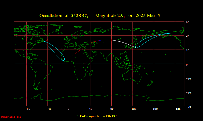 Occultation predictions of 552SB7 Magnitude 2.9 Date 2025 Mar 5 Moon: % illumination = 37+, Solar elongation = 75 Disappearance U.T. Sun Moon CA PA WA a b Location h m s Alt Alt Az o o o m/o m/o 1 CN Hailar 14 2 57 26 277 39S 128 140 -0.1 -2.8 2 CN Harbin 14 11 12 20 284 32S 134 146 -0.5 -2.9 3 CN Jiamusi 14 6 26 18 286 43S 123 135 -0.3 -2.3 4 CN Mudanjiang 14 12 36 17 287 33S 133 145 -0.5 -2.7 5 CN Yanji 14 17 27 16 288 25S 141 153 -0.8 -3.3 6 JP Akita 14 17 42 7 295 31S 135 147 -0.9 -2.5 7 JP Aomori 14 14 46 8 295 37S 129 141 -0.7 -2.2 8 JP Asahikawa 14 7 44 9 295 49S 117 129 -0.5 -1.8 9 JP Atsugi 14 34 36 3 298 0S 166 178 -4.4 -9.8 10 JP Chitose 14 9 49 9 295 45S 121 133 -0.6 -1.9 11 JP Hachinoe 14 14 35 7 296 37S 129 141 -0.7 -2.2 12 JP Hakodate 14 12 26 9 295 41S 126 137 -0.7 -2.1 13 JP Hanamaki 14 17 21 7 296 32S 134 146 -0.9 -2.4 14 JP Hyakuri 14 27 58 4 297 13S 153 165 -1.8 -4.1 15 JP Iruma 14 31 49 4 297 6S 160 172 -2.7 -6.0 16 JP Kisarazu 14 33 13 3 298 3S 163 175 -3.4 -7.4 17 JP Matsumoto 14 34 17 4 297 1S 166 177 -4.3 -9.6 18 JP Matsushima 14 19 46 6 296 28S 138 150 -1.0 -2.6 19 JP Memanbetsu 14 6 29 8 296 52S 114 126 -0.5 -1.7 20 JP Misawa 14 14 20 7 296 38S 128 140 -0.7 -2.2 21 JP Monbetsu 14 6 9 9 295 52S 114 126 -0.5 -1.7 22 JP Nakashibetsu 14 6 36 8 296 52S 114 126 -0.5 -1.7 23 JP Obihiro 14 9 3 8 296 47S 119 131 -0.6 -1.8 24 JP Rishiri Island 14 5 32 11 293 52S 114 126 -0.4 -1.8 25 JP Sapporo 14 9 51 9 295 45S 121 133 -0.6 -1.9 26 JP Sendai 14 20 43 6 296 26S 140 152 -1.1 -2.7 27 JP Shimofusa 14 30 31 3 297 8S 158 170 -2.3 -5.2 28 JP Shonai 14 20 3 7 296 27S 139 151 -1.0 -2.7 29 JP Tokachi 14 8 48 8 295 48S 118 130 -0.6 -1.8 30 JP Tokyo 14 29 44 3 298 10S 157 168 -2.1 -4.8 31 JP Toyama 14 32 54 5 296 3S 163 175 -3.4 -7.8 32 JP Wakkanai 14 4 59 11 294 54S 113 125 -0.4 -1.7 33 JP Yamagata 14 20 33 6 296 26S 140 152 -1.1 -2.7 34 JP Yokota 14 32 32 4 297 4S 162 174 -3.0 -6.7 35 JP Zama 14 34 19 3 298 1S 165 177 -4.1 -9.1 36 KZ Petropavlovsk 13 49 15 7 302 89S 77 89 -0.3 -1.0 38 MN Ulan Bator 14 14 23 33 271 5S 161 173 +9.9 +9.9 39 RU Abakan 13 39 25 47 244 35S 131 143 +0.8 -3.5 40 RU Anadyr 13 35 34 7 313 54N 41 53 -0.1 -0.7 41 RU Barnaul 13 32 59 52 234 31S 135 147 +1.2 -4.1 42 RU Blagoveschensk 13 59 9 22 281 52S 115 126 -0.1 -2.1 43 RU Bratsk 13 39 10 40 252 52S 115 127 +0.6 -2.4 44 RU Chita 13 54 58 32 269 43S 123 135 +0.2 -2.7 45 RU Irkutsk 13 52 5 38 261 36S 131 143 +0.3 -3.3 46 RU Kemorovo 13 29 25 50 234 42S 124 136 +1.1 -2.8 47 RU Khabarovsk 14 1 37 17 288 55S 112 124 -0.2 -1.9 48 RU Magadan 13 43 10 15 293 85N 71 83 -0.1 -1.2 50 RU Okha 13 52 8 15 290 75S 91 103 -0.1 -1.4 52 RU Pevek 13 34 6 11 307 56N 43 54 -0.1 -0.9 53 RU Polyarny 13 27 17 34 252 87S 80 92 +0.4 -1.3 54 RU Provideniya Bay 13 36 26 9 310 59N 45 57 -0.1 -0.8 57 RU Ulan-Ude 13 54 29 36 265 36S 130 142 +0.2 -3.2 58 RU Vladivostok 14 14 8 15 289 33S 134 145 -0.6 -2.7 59 RU Yakutsk 13 39 8 25 274 85S 82 93 +0.2 -1.5 60 RU Yuzhno-Sakhalinsk 14 2 9 11 293 59S 107 119 -0.4 -1.6 61 US Deadhorse Ak 13 32 3 5 342 11N 357 9 +0.6 -0.4 Reappearance U.T. Sun Moon CA PA WA a b Location h m s Alt Alt Az o o o m/o m/o 1 CN Hailar 14 43 21 20 284 -49S 215 227 +0.6 +0.2 2 CN Harbin 14 46 11 14 290 -44S 211 222 +0.6 +0.5 3 CN Jiamusi 14 48 15 12 293 -55S 222 233 +0.3 -0.1 4 CN Mudanjiang 14 47 38 11 293 -45S 212 224 +0.5 +0.4 5 CN Yanji 14 46 28 11 293 -38S 204 216 +0.8 +1.0 24 JP Rishiri Island 14 50 5 4 301 -65S 231 243 +0.0 -0.3 37 KZ Tselinograd 13 41 33 -7 58 223 -8S 174 186 +9.9 +9.9 38 MN Ulan Bator 14 24 6 31 272 -13S 180 191 +3.3 +9.2 39 RU Abakan 14 19 9 41 254 -37S 203 215 +1.2 +1.6 40 RU Anadyr 14 13 59 5 322 -48N 298 310 -0.7 -1.2 41 RU Barnaul 14 8 42 47 244 -30S 196 208 +1.3 +2.7 42 RU Blagoveschensk 14 46 25 15 290 -62S 229 240 +0.3 -0.4 43 RU Bratsk 14 30 42 33 264 -56S 222 234 +0.8 -0.1 44 RU Chita 14 39 19 25 278 -51S 217 229 +0.7 +0.1 45 RU Irkutsk 14 31 52 32 269 -42S 208 220 +1.0 +0.8 46 RU Kemorovo 14 15 19 44 247 -42S 208 220 +1.1 +1.3 47 RU Khabarovsk 14 48 37 9 296 -66S 233 244 +0.1 -0.5 48 RU Magadan 14 34 27 9 304 -76N 270 282 -0.4 -1.3 49 RU Nizhnevartovsk 14 9 32 46 229 -62S 229 241 +0.9 +0.3 50 RU Okha 14 44 8 8 300 -85S 252 264 -0.2 -1.0 51 RU Omsk 14 0 26 -11 52 228 -38S 205 216 +1.1 +2.0 52 RU Pevek 14 14 37 8 316 -51N 296 308 -0.6 -1.3 53 RU Polyarny 14 26 55 28 267 -90S 257 268 +0.3 -1.4 54 RU Provideniya Bay 14 17 19 5 319 -52N 294 306 -0.6 -1.2 55 RU Salekhard 14 1 33 -7 45 211 -81S 247 259 +0.8 -0.1 56 RU Surgut 14 6 56 -11 47 225 -63S 230 242 +0.9 +0.3 57 RU Ulan-Ude 14 34 30 29 273 -43S 210 221 +0.9 +0.6 58 RU Vladivostok 14 48 27 9 295 -46S 212 224 +0.5 +0.4 59 RU Yakutsk 14 35 23 19 286 -89N 258 270 +0.0 -1.4 60 RU Yuzhno-Sakhalinsk 14 49 14 4 302 -71S 238 249 -0.1 -0.5 61 US Deadhorse Ak 13 39 40 5 344 -8N 339 350 -1.5 -0.5 Sites Location E. Long Latitude 1 CN Hailar 119 49.5 49 12.3 2 CN Harbin 126 15.0 45 37.4 3 CN Jiamusi 130 27.9 46 50.6 4 CN Mudanjiang 129 34.1 44 31.4 5 CN Yanji 129 26.9 42 52.9 6 JP Akita 140 13.1 39 36.9 7 JP Aomori 140 41.4 40 44.1 8 JP Asahikawa 142 26.9 43 40.2 9 JP Atsugi 139 27.0 35 27.3 10 JP Chitose 141 40.0 42 47.7 11 JP Hachinoe 141 28.0 40 33.4 12 JP Hakodate 140 49.3 41 46.2 13 JP Hanamaki 141 8.1 39 25.8 14 JP Hyakuri 140 24.9 36 10.8 15 JP Iruma 139 24.6 35 50.5 16 JP Kisarazu 139 54.6 35 23.9 17 JP Matsumoto 137 55.4 36 10.0 18 JP Matsushima 141 13.2 38 24.3 19 JP Memanbetsu 144 9.8 43 52.8 20 JP Misawa 141 22.1 40 42.2 21 JP Monbetsu 143 24.2 44 18.2 22 JP Nakashibetsu 144 57.6 43 34.6 23 JP Obihiro 143 13.0 42 44.0 24 JP Rishiri Island 141 11.2 45 14.5 25 JP Sapporo 141 41.5 42 46.5 26 JP Sendai 140 55.0 38 8.4 27 JP Shimofusa 140 0.7 35 47.9 28 JP Shonai 139 47.2 38 48.7 29 JP Tokachi 143 9.5 42 53.4 30 JP Tokyo 140 23.2 35 45.9 31 JP Toyama 137 11.2 36 38.9 32 JP Wakkanai 141 48.0 45 24.2 33 JP Yamagata 140 22.3 38 24.7 34 JP Yokota 139 20.9 35 44.9 35 JP Zama 139 23.6 35 30.8 36 KZ Petropavlovsk 158 27.2 53 10.0 37 KZ Tselinograd 7