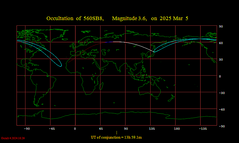 Occultation predictions of 560SB8 Magnitude 3.6 Date 2025 Mar 5 Moon: % illumination = 37+, Solar elongation = 75 Disappearance U.T. Sun Moon CA PA WA a b Location h m s Alt Alt Az o o o m/o m/o 1 CA Fort McPherson 13 42 30 1 357 55N 42 54 -0.5 -0.1 2 CA Holman Island 13 34 48 -8 5 11 51N 38 49 -0.4 +0.1 3 CA Inuvik 13 41 46 2 358 55N 42 53 -0.5 -0.1 4 CA Old Crow 13 44 46 2 353 58N 44 56 -0.5 -0.2 5 CA Sachs Harbour 13 37 58 -10 6 5 54N 40 52 -0.4 +0.0 6 CA Tuktoyaktuk 13 41 26 3 358 55N 42 53 -0.4 -0.1 7 JP Asahikawa 14 55 23 2 302 15S 151 163 -1.6 -3.4 8 JP Chitose 15 0 50 1 303 5S 162 173 -2.8 -5.9 9 JP Memanbetsu 14 52 8 1 303 21S 146 157 -1.3 -2.8 10 JP Monbetsu 14 51 58 2 302 21S 145 157 -1.3 -2.8 11 JP Nakashibetsu 14 51 55 1 303 21S 145 157 -1.3 -2.8 12 JP Obihiro 14 57 22 0 303 11S 155 167 -1.9 -4.0 13 JP Rishiri Island 14 52 5 4 301 20S 146 158 -1.3 -3.0 14 JP Sapporo 15 0 52 1 303 5S 162 173 -2.9 -5.9 15 JP Tokachi 14 56 58 1 303 12S 154 166 -1.9 -3.8 16 JP Wakkanai 14 50 51 4 301 23S 144 156 -1.2 -2.8 17 KZ Petropavlovsk 14 25 0 3 308 66S 100 112 -0.6 -1.2 18 RU Anadyr 14 4 14 5 319 83N 69 81 -0.4 -0.9 19 RU Blagoveschensk 14 51 50 14 290 15S 152 164 -1.3 -4.3 20 RU Khabarovsk 14 49 21 9 296 23S 144 155 -1.1 -3.0 21 RU Magadan 14 19 33 11 300 71S 95 107 -0.3 -1.4 22 RU Nizhnevartovsk 14 17 40 45 231 11S 156 167 +9.9 +9.9 23 RU Okha 14 32 51 10 298 50S 116 128 -0.5 -1.8 24 RU Pevek 14 3 48 9 313 85N 71 83 -0.3 -1.1 25 RU Polyarny 14 11 44 30 263 58S 109 121 +0.2 -2.1 26 RU Provideniya Bay 14 6 13 6 316 86N 73 84 -0.4 -1.0 28 RU Surgut 14 12 48 -12 47 226 15S 152 163 +0.9 -8.1 29 RU Yakutsk 14 20 59 21 283 58S 108 120 -0.1 -2.0 30 RU Yuzhno-Sakhalinsk 14 46 12 5 301 31S 136 148 -1.0 -2.3 31 US Barter Island Ak 13 45 41 4 350 59N 46 58 -0.4 -0.3 32 US Deadhorse Ak 13 47 35 5 346 61N 48 60 -0.4 -0.4 33 US Fort Yukon Ak 13 47 27 1 349 60N 47 59 -0.5 -0.3 Reappearance U.T. Sun Moon CA PA WA a b Location h m s Alt Alt Az o o o m/o m/o 5 CA Sachs Harbour 14 16 56 -7 7 14 -54N 293 304 -0.5 +0.5 19 RU Blagoveschensk 15 10 16 12 294 -26S 192 204 +1.1 +1.8 20 RU Khabarovsk 15 14 18 6 300 -34S 201 213 +0.5 +0.7 21 RU Magadan 15 8 29 6 310 -79S 246 258 -0.3 -0.9 22 RU Nizhnevartovsk 14 29 27 44 235 -10S 176 188 +1.2 +9.2 24 RU Pevek 14 52 58 6 324 -79N 268 279 -0.5 -0.9 25 RU Polyarny 15 1 52 25 274 -62S 229 240 +0.3 -0.9 27 RU Salekhard 14 35 25 -10 43 221 -45S 211 223 +0.7 +1.0 28 RU Surgut 14 28 33 45 231 -13S 179 191 +1.0 +6.7 29 RU Yakutsk 15 9 6 15 293 -66S 232 244 +0.1 -0.9 Sites Location E. Long Latitude 1 CA Fort McPherson -134 51.6 67 24.5 2 CA Holman Island -117 48.3 70 45.8 3 CA Inuvik -133 29.0 68 18.3 4 CA Old Crow -139 50.4 67 34.2 5 CA Sachs Harbour -125 14.6 71 59.6 6 CA Tuktoyaktuk -133 1.6 69 26.0 7 JP Asahikawa 142 26.9 43 40.2 8 JP Chitose 141 40.0 42 47.7 9 JP Memanbetsu 144 9.8 43 52.8 10 JP Monbetsu 143 24.2 44 18.2 11 JP Nakashibetsu 144 57.6 43 34.6 12 JP Obihiro 143 13.0 42 44.0 13 JP Rishiri Island 141 11.2 45 14.5 14 JP Sapporo 141 41.5 42 46.5 15 JP Tokachi 143 9.5 42 53.4 16 JP Wakkanai 141 48.0 45 24.2 17 KZ Petropavlovsk 158 27.2 53 10.0 18 RU Anadyr 177 44.5 64 44.1 19 RU Blagoveschensk 127 24.6 50 25.3 20 RU Khabarovsk 135 11.3 48 31.7 21 RU Magadan 150 43.0 59 54.6 22 RU Nizhnevartovsk 76 28.0 60 57.0 23 RU Okha 142 53.3 53 30.9 24 RU Pevek 171 0.0 67 30.0 25 RU Polyarny 112 3.0 66 25.0 26 RU Provideniya Bay 173 14.8 64 22.8 27 RU Salekhard 66 36.6 66 35.4 28 RU Surgut 73 30.0 61 15.0 29 RU Yakutsk 129 46.2 62 5.6 30 RU Yuzhno-Sakhalinsk 142 43.0 46 53.3 31 US Barter Island Ak -143 34.6 70 8.0 32 US Deadhorse Ak -148 27.9 70 11.7 33 US Fort Yukon Ak -145 15.0 66 34.3