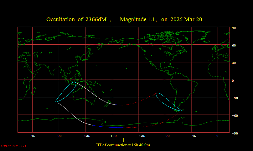 Occultation predictions of 2366dM1 Magnitude 1.1 Date 2025 Mar 20 Moon: % illumination = 67-, Solar elongation = 110 Disappearance U.T. Sun Moon CA PA WA a b Location h m s Alt Alt Az o o o m/o m/o 1 AU Adelaide 14 44 40 31 103 -87N 97 89 +0.5 -1.4 2 AU Adelaide 14 44 31 31 103 -86N 97 88 +0.5 -1.3 3 AU Albury 14 52 49 39 97 -75N 85 77 +1.1 -1.1 4 AU Alice Springs 14 31 15 21 111 -68N 78 70 +0.7 -0.5 5 AU Argyle 14 41 7 29 105 -83N 93 85 +0.5 -1.2 6 AU Avalon 14 52 53 38 97 -84N 94 86 +0.8 -1.4 7 AU Camden 14 56 17 43 96 -61N 72 64 +1.7 -0.5 8 AU Canberra 14 54 51 41 96 -68N 79 71 +1.4 -0.8 9 AU Charlieville 14 47 49 36 105 -46N 56 48 +2.3 +0.7 10 AU Coff'S Harbour 15 2 48 46 98 -40N 50 42 +3.3 +1.6 11 AU Dubbo 14 51 52 40 99 -61N 71 63 +1.6 -0.4 12 AU East Sale 14 55 23 40 95 -79N 90 81 +1.0 -1.3 13 AU Edinburgh 14 44 24 31 103 -86N 97 88 +0.5 -1.3 14 AU Hobart 15 2 29 42 89 -89N 100 91 +0.8 -1.6 15 AU Kalgoorlie 14 37 4 14 113 -77S 114 105 -0.2 -1.4 16 AU Karratha 14 26 50 4 117 -87N 98 90 -0.3 -0.8 17 AU Kununurra 14 26 59 12 114 -52N 63 55 +0.8 +0.5 18 AU Launceston 15 0 14 41 91 -87N 97 89 +0.9 -1.5 19 AU Learmonth 14 29 8 3 117 -86S 105 97 -0.4 -1.0 20 AU Melbourne 14 52 47 38 97 -82N 93 84 +0.9 -1.3 21 AU Mount Isa 14 38 15 26 110 -42N 53 44 +2.1 +1.2 22 AU Oakey 15 5 50 45 101 -25N 35 27 +7.3 +7.0 23 AU Perth 14 40 43 11 114 -67S 123 115 -0.5 -1.6 24 AU Point Cook 14 52 58 38 97 -83N 93 85 +0.8 -1.4 25 AU Port Hedland 14 26 9 5 116 -84N 95 86 -0.2 -0.7 26 AU Richmond 14 56 13 43 97 -60N 71 62 +1.8 -0.4 27 AU Sydney 14 57 4 43 96 -60N 71 62 +1.8 -0.4 28 AU Tamworth 14 56 8 42 99 -51N 62 53 +2.2 +0.2 29 AU Wagga Wagga 14 52 28 39 97 -71N 82 74 +1.2 -0.9 30 AU Woomera 14 39 2 27 106 -81N 92 83 +0.5 -1.1 33 ID Ende 14 27 34 3 116 -39N 49 41 +1.1 +1.8 34 ID Kupang 14 27 31 6 116 -40N 51 42 +1.1 +1.6 39 ID Maumere 14 28 40 4 116 -35N 46 38 +1.3 +2.2 48 NZ Alexandra 15 37 33 62 56 -61N 71 63 +2.2 +0.0 49 NZ Chatham Island 15 56 59 70 37 -42N 53 45 +3.0 +2.1 50 NZ Christchurch 15 46 13 66 51 -48N 59 51 +2.7 +1.2 51 NZ Dunedin 15 39 24 63 53 -62N 73 64 +2.1 +0.0 52 NZ Glentanner 15 39 41 64 57 -55N 65 57 +2.5 +0.5 53 NZ Hokitika 15 42 50 66 56 -48N 58 50 +2.8 +1.2 54 NZ Invercargill 15 35 40 61 57 -66N 77 69 +1.9 -0.4 55 NZ Manapouri 15 34 4 61 60 -65N 75 67 +2.0 -0.3 56 NZ Masterton 16 5 4 72 40 -24N 34 26 +5.1 +7.7 57 NZ Mount Cook 15 39 47 64 57 -54N 65 56 +2.5 +0.5 58 NZ Nelson 15 53 2 69 51 -35N 45 37 +3.7 +3.4 59 NZ Oamaru 15 41 34 64 53 -57N 68 59 +2.3 +0.4 60 NZ Paraparaumu 16 2 20 72 43 -25N 36 28 +4.8 +6.6 61 NZ Pukaki 15 39 30 64 56 -56N 67 58 +2.4 +0.4 62 NZ Queenstown International 15 36 13 62 58 -61N 72 63 +2.2 +0.0 63 NZ Timaru 15 42 13 65 53 -54N 65 56 +2.5 +0.6 64 NZ Wanaka 15 37 17 63 58 -59N 70 61 +2.2 +0.1 65 NZ Wellington 15 59 8 71 44 -30N 41 32 +4.1 +4.7 66 NZ Westport 15 46 11 67 56 -42N 52 44 +3.2 +2.0 67 NZ Weydon 16 26 47 -8 38 18 -23S 167 159 +0.1 -3.3 68 NZ Wigram 15 46 12 66 51 -49N 59 51 +2.7 +1.2 69 NZ Woodbourne 15 54 40 70 48 -34N 45 37 +3.7 +3.5 Reappearance U.T. Sun Moon CA PA WA a b Location h m s Alt Alt Az o o o m/o m/o 1 AU Adelaide 15 51 6 44 95 62N 308 300 +0.5 -2.2 2 AU Adelaide 15 50 48 44 95 62N 308 300 +0.5 -2.2 3 AU Albury 15 58 18 53 88 50N 320 312 +0.5 -2.7 4 AU Alice Springs 15 24 24 32 107 42N 328 320 -0.3 -2.5 5 AU Argyle 15 45 19 42 98 58N 312 304 +0.4 -2.3 6 AU Avalon 16 1 42 51 86 60N 311 302 +0.7 -2.4 7 AU Camden 15 53 35 55 89 36N 334 326 +0.2 -3.4 8 AU Canberra 15 57 15 54 88 43N 327 319 +0.4 -3.0 9 AU Charlieville 15 26 14 44 102 18N 352 344 -1.1 -4.4 10 AU Coff'S Harbour 15 37 9 53 95 13N 358 350 -1.3 -5.5 11 AU Dubbo 15 47 9 52 93 35N 336 328 +0.0 -3.4 12 AU East Sale 16 3 44 54 84 55N 315 307 +0.7 -2.5 13 AU Edinburgh 15 50 37 44 95 62N 309 301 +0.5 -2.2 14 AU Hobart 16 15 5 55 75 67N 303 295 +1.0 -2.2 15 AU Kalgoorlie 15 37 7 26 107 82N 289 281 +0.2 -1.5 16 AU Karratha 15 22 11 16 113 66N 304 296 -0.2 -1.5 17 AU Kununurra 15 6 15 21 113 28N 343 335 -1.0 -2.9 18 AU Launceston 16 12 0 55 78 64N 306 298 +0.9 -2.2 19 AU Learmonth 15 24 54 15 113 74N 296 288 -0.2 -1.3 20 AU Melbourne 16 1 16 51 86 58N 312 304 +0.7 -2.4 21 AU Mount Isa 15 10 24 33 109 15N 356 347 -1.5 -4.3 22 AU Oakey 15 20 11 48 100 -3N 14 5 +9.9 +9.9 23 AU Perth 15 37 25 22 108 88S 278 270 +0.2 -1.2 24 AU Point Cook 16 1 39 51 86 59N 311 303 +0.7 -2.4 25 AU Port Hedland 15 21 10 17 113 62N 308 300 -0.3 -1.6 26 AU Richmond 15 52 4 54 90 34N 336 328 +0.1 -3.5 27 AU Sydney 15 53 20 55 89 34N 336 328 +0.2 -3.5 28 AU Tamworth 15 42 35 52 94 24N 346 338 -0.4 -4.1 29 AU Wagga Wagga 15 56 4 52 89 46N 324 316 +0.4 -2.9 30 AU Woomera 15 41 56 40 100 56N 314 306 +0.3 -2.3 31 ID Bima 14 57 16 7 116 23N 347 339 -1.3 -2.9 32 ID Denpasar 15 1 53 5 116 33N 338 329 -1.0 -2.3 33 ID Ende 14 53 46 9 116 16N 355 346 -1.7 -3.6 34 ID Kupang 14 55 5 12 115 17N 354 346 -1.7 -3.6 35 ID Labuhan Bajo 14 55 23 8 116 19N 351 343 -1.5 -3.2 36 ID Madiun 15 3 14 2 117 36N 334 326 -1.0 -2.1 37 ID Malang 15 2 35 3 116 35N 336 327 -1.0 -2.2 38 ID Mataram 15 0 26 5 116 30N 340 332 -1.1 -2.4 39 ID Maumere 14 51 53 9 116 12N 358 350 -2.0 -4.1 40 ID Ruteng 14 54 49 8 116 18N 352 344 -1.6 -3.3 41 ID Semarang 15 3 1 0 117 36N 335 326 -1.0 -2.1 42 ID Solo City 15 3 42 1 117 37N 333 325 -1.0 -2.0 43 ID Sumbawa 14 58 44 6 116 26N 344 336 -1.2 -2.7 44 ID Surabaya 15 1 21 2 116 32N 338 330 -1.1 -2.3 45 ID Waikabubak 14 58 57 8 116 26N 345 336 -1.2 -2.7 46 ID Waingapu 14 58 22 9 116 24N 346 338 -1.3 -2.9 47 ID Yogyakarta 15 4 33 1 117 39N 332 323 -1.0 -2.0 48 NZ Alexandra 16 45 22 70 23 45N 326 318 +1.3 -3.0 49 NZ Chatham Island 16 48 54 73 2 29N 341 333 +1.2 -4.6 50 NZ Christchurch 16 43 5 73 18 33N 337 329 +1.1 -4.1 51 NZ Dunedin 16 48 33 70 18 47N 324 316 +1.3 -2.8 52 NZ Glentanner 16 41 56 71 25 38N 332 324 +1.2 -3.5 53 NZ Hokitika 16 38 12 72 27 31N 339 331 +1.0 -4.3 54 NZ Invercargill 16 47 18 69 23 51N 320 312 +1.3 -2.6 55 NZ Manapouri 16 44 6 69 28 48N 322 314 +1.3 -2.8 56 NZ Masterton 16 29 58 75 21 9N
