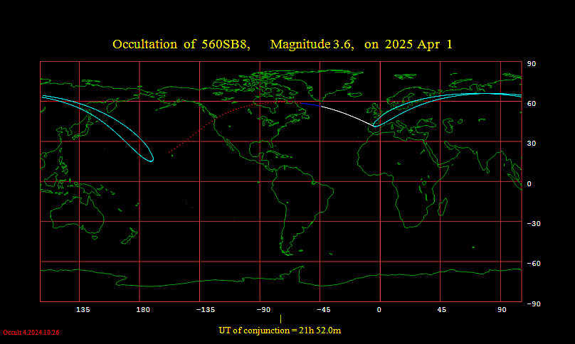 Occultation predictions of 560SB8 Magnitude 3.6 Date 2025 Apr 1 Moon: % illumination = 17+, Solar elongation = 48 Disappearance U.T. Sun Moon CA PA WA a b Location h m s Alt Alt Az o o o m/o m/o 1 BE Antwerp 22 24 32 5 303 54S 109 121 -0.6 -1.5 2 BE Beauvechain 22 25 0 5 303 54S 110 122 -0.6 -1.5 3 BE Bertrix 22 26 1 4 304 52S 111 123 -0.6 -1.5 4 BE Brasschaat 22 24 17 5 303 55S 109 121 -0.6 -1.5 5 BE Brussels 22 24 57 5 303 54S 110 122 -0.6 -1.5 6 BE Charleroi 22 25 37 5 303 53S 111 123 -0.6 -1.5 7 BE Chievres 22 25 49 5 303 52S 111 123 -0.6 -1.5 8 BE Florennes 22 25 49 4 303 53S 111 123 -0.6 -1.5 9 BE Kleine Brogel 22 23 58 5 303 56S 108 120 -0.6 -1.4 10 BE Koksijde 22 25 42 6 302 52S 112 123 -0.6 -1.5 11 BE Kortrijk-Vevelgem 22 25 48 5 302 52S 112 123 -0.6 -1.5 12 BE Liege 22 24 47 4 304 54S 109 121 -0.6 -1.4 13 BE Ostend 22 25 24 6 302 53S 111 123 -0.6 -1.5 14 BE Sint-Truiden 22 24 42 4 303 54S 109 121 -0.6 -1.4 15 BE Ursel 22 25 10 6 302 53S 111 122 -0.6 -1.5 16 BE Weelde 22 23 56 5 303 55S 108 120 -0.6 -1.4 17 BE Zoersel 22 24 15 5 303 55S 109 121 -0.6 -1.5 18 BE Zutendaal 22 24 14 4 304 55S 109 120 -0.6 -1.4 19 CH Alpnach 22 28 11 0 306 49S 115 127 -0.7 -1.4 20 CH Bern 22 28 48 0 306 48S 116 128 -0.7 -1.5 21 CH Buochs 22 28 5 0 306 49S 114 126 -0.7 -1.4 22 CH Dubendorf 22 27 17 0 307 51S 113 125 -0.7 -1.4 23 CH Emmen 22 27 58 0 306 49S 114 126 -0.7 -1.4 24 CH Geneva 22 30 55 1 305 44S 119 131 -0.8 -1.6 25 CH Grenchen 22 28 28 1 306 49S 115 127 -0.7 -1.5 26 CH Interlaken 22 28 52 0 306 48S 116 128 -0.7 -1.5 27 CH Les Eplatures 22 29 4 1 306 48S 116 128 -0.7 -1.5 28 CH Meiringen 22 28 36 0 306 48S 115 127 -0.7 -1.4 29 CH Payerne 22 29 20 1 306 47S 117 129 -0.7 -1.5 30 CH Saanen 22 29 37 0 306 47S 117 129 -0.7 -1.5 31 CH Zurich 22 27 16 0 306 51S 113 125 -0.7 -1.4 32 CZ Karlovy Vary 22 20 54 1 308 62S 102 114 -0.6 -1.2 33 CZ Line 22 21 20 0 309 61S 103 115 -0.6 -1.2 34 CZ Mnichovo Hradiste 22 19 16 0 310 64S 99 111 -0.6 -1.1 35 CZ Vodochody 22 19 58 0 309 63S 101 113 -0.6 -1.2 36 DE Aachen 22 24 3 4 304 56S 108 120 -0.6 -1.4 37 DE Aalen-Heidenheim 22 24 22 1 307 56S 108 120 -0.7 -1.3 38 DE Allendorf 22 22 20 3 306 59S 105 117 -0.6 -1.3 39 DE Altenburg 22 20 13 1 308 63S 101 113 -0.6 -1.2 40 DE Anklam 22 16 14 3 308 69S 95 107 -0.5 -1.2 41 DE Arnsberg 22 22 10 4 305 59S 105 117 -0.6 -1.3 42 DE Augsburg 22 24 23 0 308 56S 108 120 -0.7 -1.3 43 DE Baden-Baden 22 25 43 2 306 53S 111 122 -0.7 -1.4 44 DE Bamberg 22 22 27 1 307 59S 105 117 -0.6 -1.3 45 DE Barth 22 16 7 4 307 69S 95 107 -0.5 -1.2 46 DE Baumholder 22 25 5 3 305 54S 110 121 -0.6 -1.4 47 DE Bautzen 22 18 48 1 309 65S 99 111 -0.6 -1.1 48 DE Bayreuth 22 21 57 1 308 60S 104 116 -0.6 -1.2 49 DE Berlin 22 18 0 2 308 66S 97 109 -0.5 -1.2 50 DE Biberach 22 25 36 0 307 54S 110 122 -0.7 -1.3 51 DE Borkum 22 19 59 6 303 62S 102 114 -0.5 -1.4 52 DE Braunschweig 22 19 40 3 306 63S 101 112 -0.5 -1.2 53 DE Bremen 22 19 40 5 305 63S 101 113 -0.5 -1.3 54 DE Bremerhaven 22 19 10 5 305 64S 100 112 -0.5 -1.3 55 DE Brueckeburg 22 20 30 4 305 62S 102 114 -0.5 -1.3 56 DE Brueggen 22 23 34 4 304 56S 107 119 -0.6 -1.4 57 DE Buechel 22 24 28 3 305 55S 109 121 -0.6 -1.4 58 DE Burg Feuerstein 22 22 29 1 307 59S 105 117 -0.6 -1.3 59 DE Celle 22 19 36 4 306 63S 101 112 -0.5 -1.3 60 DE Coburg 22 22 0 2 307 60S 104 116 -0.6 -1.3 61 DE Cochstedt 22 19 46 3 307 63S 101 112 -0.6 -1.2 62 DE Coleman 22 24 26 2 306 55S 108 120 -0.6 -1.4 63 DE Cologne 22 23 27 4 305 57S 107 119 -0.6 -1.4 64 DE Cottbus 22 18 0 1 309 66S 97 109 -0.6 -1.1 65 DE Dahlemer Binz 22 24 28 4 304 55S 109 121 -0.6 -1.4 66 DE Dessau 22 19 23 2 308 64S 100 112 -0.6 -1.2 67 DE Diepholz 22 20 29 4 305 62S 102 114 -0.5 -1.3 68 DE Donaueschingen 22 26 37 1 306 52S 112 124 -0.7 -1.4 69 DE Dortmund 22 22 17 4 305 59S 105 117 -0.6 -1.4 70 DE Dresden 22 19 20 1 309 64S 100 111 -0.6 -1.2 71 DE Duesseldorf 22 23 5 4 304 57S 107 118 -0.6 -1.4 72 DE Egelsbach 22 23 48 2 306 56S 107 119 -0.6 -1.3 73 DE Eggebeck 22 17 23 5 305 66S 97 109 -0.5 -1.3 74 DE Eisenach 22 21 24 2 307 61S 103 115 -0.6 -1.3 75 DE Eisenhuettenstadt 22 17 37 1 309 67S 97 109 -0.6 -1.1 76 DE Emden 22 20 0 5 304 62S 102 114 -0.5 -1.3 77 DE Erfurt 22 21 8 2 307 61S 103 115 -0.6 -1.3 78 DE Essen 22 22 50 4 304 58S 106 118 -0.6 -1.4 79 DE Fassberg 22 19 8 4 306 64S 100 112 -0.5 -1.3 80 DE Flensburg 22 17 10 6 305 67S 97 109 -0.5 -1.3 81 DE Frankfurt 22 23 46 2 306 56S 107 119 -0.6 -1.3 82 DE Freiburg 22 26 59 1 306 51S 113 125 -0.7 -1.4 83 DE Friedrichshafen 22 26 22 0 307 52S 111 123 -0.7 -1.4 84 DE Fritzlar 22 21 55 3 306 60S 104 116 -0.6 -1.3 85 DE Geilenkirchen 22 23 57 4 304 56S 108 120 -0.6 -1.4 86 DE Giebelstadt 22 23 24 1 307 57S 107 118 -0.6 -1.3 87 DE Grafenwoehr 22 22 8 1 308 60S 104 116 -0.6 -1.2 88 DE Guetersloh 22 21 24 4 305 60S 104 116 -0.5 -1.3 89 DE Hahn 22 24 40 3 305 55S 109 121 -0.6 -1.4 90 DE Halle 22 19 48 2 308 63S 101 112 -0.6 -1.2 91 DE Hamburg 22 18 19 4 306 65S 99 110 -0.5 -1.3 92 DE Hamburg 22 18 31 4 306 65S 99 111 -0.5 -1.3 93 DE Hanau 22 23 19 2 306 57S 107 118 -0.6 -1.3 94 DE Hannover 22 19 57 4 306 63S 101 113 -0.5 -1.3 95 DE Hassfurt 22 22 34 2 307 59S 105 117 -0.6 -1.3 96 DE Heidelberg 22 24 33 2 306 55S 109 120 -0.6 -1.4 97 DE Heringsdorf 22 15 56 3 308 70S 94 106 -0.5 -1.1 98 DE Hildesheim 22 20 10 3 306 62S 101 113 -0.5 -1.3 99 DE Hof 22 21 28 1 308 61S 103 115 -0.6 -1.2 100 DE Hohenfels 22 22 45 0 308 58S 105 117 -0.6 -1.2 101 DE Hohn 22 17 40 5 305 66S 98 110 -0.5 -1.3 102 DE Holzdorf 22 18 55 2 308 65S 99 111 -0.6 -1.2 103 DE Hopsten 22 21 15 5 304 60S 104 115 -0.5 -1.3 104 DE Ingolstadt 22 23 36 0 308 57S 107 119 -0.7 -1.3 105 DE Itzehoe 22 18 3 5 305 66S 98 110 -0.5 -1.3 106 DE Jena 22 20 45 2 308 62S 102 114 -0.6 -1.2 107 DE Jever 22 19 28 5 304 63S 101 113 -0.5 -1.3 108 DE Kamenz 22 18 55 1 309 65S 99 111 -0.6 -1.2 109 DE Kamp 22 22 52 4 304 57S 106 118 -0.6 -1.4 110 DE Karlsruhe 22 25 21 2 306 54S 110 122 -0.6 -1.4 111 DE Kassel 22 21 28 3 306 60S 104 115 -0.6 -1.3 112 DE Kiel 22 17 18 5 305 67S