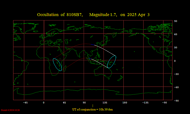 Occultation predictions of 810SB7 Magnitude 1.7 Date 2025 Apr 3 Moon: % illumination = 32+, Solar elongation = 69 Disappearance U.T. Sun Moon CA PA WA a b Location h m s Alt Alt Az o o o m/o m/o 1 AU Amberley 11 58 18 10 302 30S 145 148 -0.6 -1.7 2 AU Cairns 12 9 14 2 301 6S 169 172 -2.3 -4.2 3 AU Weipa 12 2 3 9 302 20S 155 158 -1.0 -2.4 4 BN Brunei 11 19 1 49 310 36S 139 142 +1.3 -2.7 7 CN Fuzhou 11 13 10 56 284 60N 55 58 +2.4 +1.1 10 CN Hangzhou 11 24 6 54 278 35N 29 33 +3.3 +3.9 11 CN Hefei 11 20 14 -11 58 275 31N 25 28 +3.5 +4.9 13 CN Nanchang 11 7 20 -8 61 278 53N 48 51 +2.6 +1.7 14 CN Nanjing 11 25 53 55 276 26N 20 23 +4.2 +6.8 15 CN Ningbo 11 25 59 53 279 35N 30 33 +3.3 +3.8 16 CN Shanghai 11 33 36 51 278 20N 15 18 +9.9 +9.9 17 CN Shantou 11 4 9 -9 60 287 75N 69 72 +2.4 +0.4 20 CN Xiamen 11 8 14 -11 58 285 68N 63 66 +2.4 +0.7 22 FM Chuuk 11 54 2 12 298 68N 63 66 +0.8 +0.7 23 FM Pohnpei 11 59 2 5 298 55N 50 53 +0.9 +1.3 24 FM Yap 11 41 34 28 297 89N 83 87 +1.1 -0.1 27 ID Ambon 11 48 38 28 305 25S 150 153 -0.2 -2.7 28 ID Balikpapan 11 47 26 39 309 0S 175 178 +9.9 +9.9 29 ID Biak 11 46 0 23 302 53S 122 125 +0.4 -1.1 30 ID Gorontalo 11 36 59 37 306 32S 142 146 +0.5 -2.5 31 ID Jayapura 11 48 48 18 301 57S 118 121 +0.3 -0.8 32 ID Kaimana 11 48 37 23 303 39S 136 139 +0.1 -1.6 33 ID Kendari 11 56 15 31 307 0S 174 178 -3.2 -8.7 34 ID Langgur 11 52 20 22 304 28S 146 150 -0.3 -2.2 35 ID Luwuk 11 41 26 35 307 24S 151 154 +0.1 -3.1 36 ID Makale 11 56 27 33 308 -6S 180 184 +9.9 +9.9 37 ID Manado 11 36 14 36 305 40S 134 137 +0.7 -1.9 38 ID Manokwari 11 44 47 25 302 50S 125 128 +0.4 -1.2 39 ID Masamba 11 49 46 35 308 5S 170 173 -1.8 -6.8 40 ID Merauke 11 55 25 14 302 35S 139 143 -0.3 -1.5 41 ID Nabire 11 48 25 22 303 44S 131 134 +0.2 -1.3 42 ID Natuna 11 15 10 -6 54 317 17S 157 161 +0.9 -5.7 43 ID Palu 11 41 30 38 308 16S 158 161 -0.3 -4.2 44 ID Ponggaluku 11 58 11 30 307 -3S 178 181 +9.9 +9.9 45 ID Poso 11 43 22 36 308 15S 159 162 -0.4 -4.3 46 ID Putusibau 11 36 19 45 312 4S 171 174 -1.7 -9.2 47 ID Samarinda 11 40 51 40 309 10S 165 168 -0.9 -5.9 48 ID Soroako 11 47 55 34 308 10S 165 168 -1.1 -5.2 49 ID Sorong 11 43 41 28 303 44S 131 134 +0.4 -1.5 50 ID Tahuna 11 32 57 37 304 50S 125 128 +0.9 -1.5 51 ID Tanjung Redep 11 29 32 44 309 27S 147 151 +0.6 -3.2 52 ID Tanjung Santan 11 38 26 41 309 14S 161 164 -0.4 -5.0 53 ID Taraken 11 26 18 45 308 33S 141 145 +0.9 -2.8 54 ID Ternate 11 39 2 33 304 43S 132 135 +0.6 -1.7 55 ID Timika 11 50 10 20 303 43S 132 135 +0.1 -1.3 56 ID Wamena 11 49 55 18 302 48S 126 129 +0.1 -1.1 57 JP Futema 11 34 19 45 285 41N 36 39 +2.8 +2.5 58 JP Iejima 11 35 36 44 285 38N 33 36 +3.0 +3.0 59 JP Ishigaki 11 22 17 50 286 60N 54 57 +2.3 +1.0 60 JP Kadena 11 34 32 45 285 41N 36 39 +2.9 +2.6 61 JP Kitadaito 11 44 41 39 287 31N 25 29 +3.8 +4.6 62 JP Kumejima 11 31 39 46 285 44N 38 42 +2.7 +2.3 63 JP Minami Daito 11 44 0 39 287 32N 27 30 +3.6 +4.3 64 JP Miyako 11 25 24 48 286 55N 50 53 +2.4 +1.3 65 JP Naha 11 33 47 45 285 42N 37 40 +2.8 +2.4 66 JP Okierabu 11 41 39 43 285 29N 23 27 +4.1 +5.4 67 JP Shimojishima 11 25 6 49 286 56N 50 53 +2.4 +1.3 68 JP Tokunoshima 11 45 21 42 285 22N 17 20 +6.2 +9.8 69 JP Yonaguni Jima 11 19 36 52 286 61N 56 59 +2.3 +1.0 70 JP Yoron 11 38 45 43 285 34N 28 32 +3.4 +3.9 82 MY Bintulu 11 22 36 49 312 23S 152 155 +0.8 -4.1 85 MY Kota Kinabalu 11 17 59 49 308 42S 133 136 +1.4 -2.3 87 MY Kuching 11 35 26 48 313 -3S 177 180 +9.9 +9.9 88 MY Labuan 11 18 30 50 309 38S 137 140 +1.3 -2.6 89 MY Lahad Datu 11 22 57 46 307 42S 133 136 +1.2 -2.2 90 MY Marudi 11 20 30 49 311 31S 144 147 +1.1 -3.2 91 MY Miri 11 19 39 50 311 31S 144 147 +1.2 -3.2 92 MY Sibu 11 26 37 48 313 14S 161 164 +0.2 -5.8 93 MY Tawau 11 24 23 45 308 38S 136 139 +1.1 -2.4 94 PG Goroka 11 52 19 11 301 54S 120 123 +0.0 -0.7 95 PG Madang 11 51 39 12 301 58S 116 120 +0.1 -0.6 96 PG Mount Hagen 11 52 4 12 301 53S 121 125 +0.0 -0.8 97 PG Nadzab 11 52 37 10 301 55S 119 122 +0.0 -0.7 98 PG Port Moresby 11 54 46 8 301 46S 128 131 -0.2 -0.9 99 PG Wewak 11 50 17 15 301 59S 115 118 +0.2 -0.7 100 PH Bacolod 11 21 13 46 300 69S 105 108 +1.6 -0.9 101 PH Bagabag 11 14 13 51 295 87S 87 91 +2.0 -0.4 102 PH Baguio 11 13 8 52 296 85S 89 93 +2.0 -0.4 103 PH Basco 11 15 15 52 291 79N 73 76 +2.1 +0.2 104 PH Calbayog 11 22 34 45 299 76S 98 101 +1.6 -0.7 105 PH Catarman 11 22 28 45 298 78S 96 100 +1.6 -0.6 106 PH Cauayan 11 15 5 51 295 89S 86 89 +2.0 -0.3 107 PH Cebu 11 26 46 42 302 60S 115 118 +1.3 -1.2 108 PH Cubi Nas 11 29 22 40 303 58S 117 120 +1.2 -1.3 109 PH Daet 11 18 36 48 297 81S 93 97 +1.8 -0.6 110 PH Dumaguete 11 23 4 44 301 65S 109 112 +1.5 -1.1 111 PH Floridablanca 11 13 30 52 298 80S 94 97 +1.9 -0.6 112 PH Guiuan 11 25 10 43 299 75S 100 103 +1.5 -0.7 113 PH Iba 11 12 17 52 297 81S 94 97 +2.0 -0.6 114 PH Iloilo 11 20 33 46 301 69S 105 109 +1.6 -1.0 115 PH Jose Panganiban 11 17 55 48 297 81S 93 97 +1.8 -0.6 116 PH Kalibo 11 19 21 47 300 72S 102 106 +1.7 -0.9 117 PH Ladag 11 25 55 42 301 64S 110 113 +1.4 -1.1 118 PH Legazpi 11 24 58 43 302 61S 114 117 +1.3 -1.2 119 PH Lingayen 11 12 27 52 296 84S 91 94 +2.0 -0.5 120 PH Lipa 11 15 26 50 298 78S 97 100 +1.8 -0.7 121 PH Mamburao 11 15 0 50 299 75S 100 103 +1.8 -0.8 122 PH Manila 11 14 51 51 298 79S 95 98 +1.9 -0.6 123 PH Marinduque 11 17 5 49 299 77S 98 101 +1.8 -0.7 124 PH Masbate 11 23 7 44 300 70S 105 108 +1.5 -0.9 125 PH Naga 11 19 29 47 298 80S 95 98 +1.7 -0.6 126 PH Ormoc 11 23 20 44 299 73S 101 105 +1.5 -0.8 127 PH Puerto Princesa 11 15 25 50 304 60S 114 118 +1.7 -1.4 128 PH Romblon 11 29 14 40 303 57S 117 121 +1.2 -1.3 129 PH Roxas 11 20 1 47 300 72S 102 106 +1.6 -0.9 130 PH San Fernando 11 12 20 53 296 86S 89 92 +2.0 -0.4 131 PH San Jose 11 19 30 47 301 68S 106 110 +1.6 -1.0 132 PH Sangley Point 11 25 49 42 300 70S 104 107 +1.4 -0.9 133 PH Tacloban 11 23 57 44 299 74S 100 103 +1.5 -0.8 134 PH Tuguegarao 11 14 52 51 294 89N 83 87 +2.0 -0.2 135 PH Vigan 11 12 6 53 295 89S 85 89 +2.0 -0.3 136 PH Virac 11 21 3 46 297 81S 93 97 +1.7 -0.6 137 PH Zamboanga 11 24