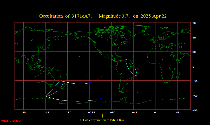 Occultation predictions of 3171cA7 Magnitude 3.7 Date 2025 Apr 22 Moon: % illumination = 33-, Solar elongation = 71 Disappearance U.T. Sun Moon CA PA WA a b Location h m s Alt Alt Az o o o m/o m/o 4 NZ Chatham Island 13 24 28 6 107 -70N 50 68 +0.1 -0.2 7 NZ Gisborne 13 26 15 6 106 -49N 29 47 +0.4 +0.9 10 NZ Hastings 13 25 10 6 107 -54N 34 52 +0.3 +0.5 31 NZ Wairoa 13 25 44 6 106 -51N 31 49 +0.4 +0.7 36 NZ Whakatane 13 26 31 5 107 -47N 27 44 +0.4 +1.0 Reappearance U.T. Sun Moon CA PA WA a b Location h m s Alt Alt Az o o o m/o m/o 1 NZ Alexandra 14 19 16 11 102 76N 264 282 +0.0 -1.2 2 NZ Ardmore 14 4 59 11 102 40N 300 318 -0.3 -2.5 3 NZ Auckland 14 4 59 11 102 40N 300 318 -0.3 -2.5 4 NZ Chatham Island 14 18 1 16 98 66N 273 291 +0.1 -1.5 5 NZ Christchurch 14 17 10 13 101 68N 272 290 +0.0 -1.4 6 NZ Dunedin 14 20 10 12 101 78N 262 280 +0.1 -1.2 7 NZ Gisborne 14 8 30 15 100 45N 295 313 -0.1 -2.4 8 NZ Glentanner 14 17 37 11 102 71N 268 286 +0.0 -1.3 9 NZ Hamilton 14 6 57 12 102 43N 296 314 -0.2 -2.3 10 NZ Hastings 14 10 43 14 100 50N 290 308 +0.0 -2.1 11 NZ Hokitika 14 16 3 11 102 67N 273 291 +0.0 -1.4 12 NZ Invercargill 14 20 37 11 102 81N 259 277 +0.0 -1.1 13 NZ Kaitaia 14 0 7 8 104 31N 308 326 -0.5 -3.1 14 NZ Kerikeri 14 0 21 9 104 32N 308 326 -0.5 -3.1 15 NZ Manapouri 14 19 36 10 103 78N 261 279 +0.0 -1.1 16 NZ Masterton 14 13 16 14 100 56N 283 301 +0.0 -1.8 17 NZ Mount Cook 14 17 26 11 102 71N 269 287 +0.0 -1.3 18 NZ Nelson 14 13 50 12 101 60N 280 298 +0.0 -1.7 19 NZ New Plymouth 14 9 36 12 102 50N 290 308 -0.1 -2.0 20 NZ Oamaru 14 19 2 13 101 74N 266 284 +0.1 -1.2 21 NZ Ohakea 14 11 50 13 100 54N 286 304 +0.0 -1.9 22 NZ Palmerston North 14 12 3 14 100 54N 286 304 +0.0 -1.9 23 NZ Paraparaumu 14 13 8 14 100 57N 283 301 +0.0 -1.8 24 NZ Pukaki 14 18 3 12 102 72N 267 285 +0.0 -1.3 25 NZ Queenstown International 14 19 1 11 103 76N 264 282 +0.0 -1.2 26 NZ Rotorua 14 7 21 13 101 44N 296 314 -0.1 -2.4 27 NZ Taupo 14 8 50 13 101 47N 293 311 -0.1 -2.2 28 NZ Tauranga 14 6 21 13 101 42N 298 316 -0.2 -2.5 29 NZ Timaru 14 18 13 12 101 72N 268 286 +0.0 -1.3 30 NZ Waiouru 14 10 20 13 101 50N 290 307 -0.1 -2.0 31 NZ Wairoa 14 9 20 14 100 47N 293 311 -0.1 -2.2 32 NZ Wanaka 14 18 39 11 102 75N 265 283 +0.0 -1.2 33 NZ Wanganui 14 11 23 13 101 53N 287 305 +0.0 -1.9 34 NZ Wellington 14 13 52 14 100 59N 281 299 +0.0 -1.7 35 NZ Westport 14 14 35 11 102 63N 277 295 +0.0 -1.5 36 NZ Whakatane 14 6 51 13 101 42N 298 316 -0.1 -2.5 37 NZ Whangarei 14 1 44 10 103 34N 306 324 -0.4 -2.9 38 NZ Whenuapai 14 4 25 11 103 39N 301 319 -0.3 -2.6 39 NZ Wigram 14 17 15 13 101 68N 271 289 +0.0 -1.4 40 NZ Woodbourne 14 14 11 13 101 60N 280 298 +0.0 -1.7 Sites Location E. Long Latitude 1 NZ Alexandra 169 22.4 -45 12.7 2 NZ Ardmore 174 58.4 -37 1.8 3 NZ Auckland 174 47.5 -37 0.5 4 NZ Chatham Island 176 27.4 -43 48.6 5 NZ Christchurch 172 31.9 -43 29.4 6 NZ Dunedin 170 11.9 -45 55.7 7 NZ Gisborne 177 58.7 -38 39.8 8 NZ Glentanner 170 7.7 -43 54.4 9 NZ Hamilton 175 19.9 -37 52.0 10 NZ Hastings 176 46.0 -39 38.8 11 NZ Hokitika 170 59.1 -42 42.8 12 NZ Invercargill 168 18.8 -46 24.7 13 NZ Kaitaia 173 17.1 -35 4.2 14 NZ Kerikeri 173 54.7 -35 15.8 15 NZ Manapouri 167 39.0 -45 32.0 16 NZ Masterton 175 38.0 -40 58.4 17 NZ Mount Cook 170 8.0 -43 45.9 18 NZ Nelson 173 13.3 -41 17.9 19 NZ New Plymouth 174 10.8 -39 0.5 20 NZ Oamaru 171 4.9 -44 58.2 21 NZ Ohakea 175 23.3 -40 12.3 22 NZ Palmerston North 175 37.0 -40 19.2 23 NZ Paraparaumu 174 59.4 -40 54.3 24 NZ Pukaki 170 7.1 -44 14.1 25 NZ Queenstown International 168 44.4 -45 1.3 26 NZ Rotorua 176 19.0 -38 6.6 27 NZ Taupo 176 5.1 -38 44.4 28 NZ Tauranga 176 11.8 -37 40.3 29 NZ Timaru 171 13.5 -44 18.2 30 NZ Waiouru 175 39.5 -39 26.8 31 NZ Wairoa 177 24.4 -39 0.4 32 NZ Wanaka 169 14.6 -44 43.5 33 NZ Wanganui 175 1.5 -39 57.7 34 NZ Wellington 174 48.3 -41 19.6 35 NZ Westport 171 34.8 -41 44.3 36 NZ Whakatane 176 54.9 -37 55.2 37 NZ Whangarei 174 21.9 -35 46.1 38 NZ Whenuapai 174 37.8 -36 47.3 39 NZ Wigram 172 33.2 -43 33.1 40 NZ Woodbourne 173 52.2 -41 31.1