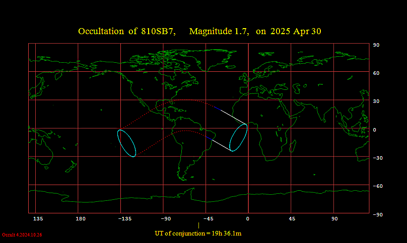 Occultation predictions of 810SB7 Magnitude 1.7 Date 2025 Apr 30 Moon: % illumination = 13+, Solar elongation = 42 Disappearance U.T. Sun Moon CA PA WA a b Location h m s Alt Alt Az o o o m/o m/o 1 BR Aracaju 20 42 37 -7 27 310 10S 161 164 -0.7 -3.7 2 BR Fernando Do Noronha 20 31 11 -7 30 306 51S 120 123 +0.8 -1.0 5 BR MacEio 20 37 52 -7 28 310 22S 149 152 +0.0 -2.4 11 BR Recife 20 35 20 -7 29 309 30S 140 144 +0.4 -1.8 14 CI San Pedro 21 0 30 6 298 41N 32 35 +2.0 +3.1 15 CV Francisco Mendez 20 51 38 27 295 37N 28 31 +3.5 +4.3 16 CV Maio 20 53 50 27 295 33N 24 27 +4.2 +5.6 17 LR Monrovia 20 56 57 11 298 47N 38 41 +1.8 +2.4 18 PT Wide Awake 20 43 52 10 301 70S 100 103 +0.4 +0.0 19 SL Freetown 20 58 26 14 297 40N 31 34 +2.5 +3.3 20 SL Hastings 20 57 50 14 298 42N 33 36 +2.3 +3.1 Reappearance U.T. Sun Moon CA PA WA a b Location h m s Alt Alt Az o o o m/o m/o 1 BR Aracaju 21 15 6 21 307 -44S 215 218 +3.0 +3.7 2 BR Fernando Do Noronha 21 34 39 17 301 -86S 257 260 +1.0 +0.6 3 BR Fortaleza 21 26 44 24 304 -74S 245 248 +1.6 +1.1 4 BR Joao Pessoa 21 26 34 20 304 -66S 237 240 +1.7 +1.6 5 BR MacEio 21 22 32 19 305 -57S 228 231 +2.1 +2.3 6 BR Mocord 21 26 58 22 304 -71S 242 245 +1.7 +1.3 7 BR Natal 21 29 27 19 303 -73S 244 247 +1.5 +1.2 8 BR Parnaiba 21 22 2 -10 28 305 -71S 242 245 +1.9 +1.3 9 BR Paulo Alfonso 21 16 59 22 306 -50S 221 224 +2.7 +3.0 10 BR Petrolina 21 10 5 -10 26 308 -42S 213 216 +3.5 +4.2 11 BR Recife 21 26 51 18 304 -65S 236 239 +1.7 +1.7 12 BR Sao Luis 21 17 15 -6 31 306 -66S 237 240 +2.2 +1.5 13 BR Teresina 21 16 5 -8 29 307 -59S 230 233 +2.4 +2.1 15 CV Francisco Mendez 21 12 17 23 295 -2N 349 352 -2.2 -5.5 16 CV Maio 21 10 13 23 295 2N 353 356 -3.0 -6.8 17 LR Monrovia 21 24 15 5 298 -12N 340 343 -1.6 -3.1 19 SL Freetown 21 20 16 9 298 -5N 346 349 -2.0 -4.2 20 SL Hastings 21 21 1 9 298 -7N 345 348 -1.9 -3.9 Sites Location E. Long Latitude 1 BR Aracaju - 37 4.2 -10 59.0 2 BR Fernando Do Noronha - 32 25.4 - 3 51.3 3 BR Fortaleza - 38 32.0 - 3 46.6 4 BR Joao Pessoa - 35 53.8 - 7 16.2 5 BR MacEio - 35 47.6 - 9 30.6 6 BR Mocord - 37 21.9 - 5 12.1 7 BR Natal - 35 14.9 - 5 54.7 8 BR Parnaiba - 41 43.9 - 2 53.6 9 BR Paulo Alfonso - 38 15.0 - 9 24.0 10 BR Petrolina - 40 33.8 - 9 21.8 11 BR Recife - 34 55.4 - 8 7.6 12 BR Sao Luis - 44 14.2 - 2 35.3 13 BR Teresina - 42 49.4 - 5 3.6 14 CI San Pedro - 6 39.6 4 44.8 15 CV Francisco Mendez - 23 29.6 14 55.5 16 CV Maio - 23 12.8 15 9.3 17 LR Monrovia - 10 45.5 6 17.3 18 PT Wide Awake - 14 23.6 - 7 58.2 19 SL Freetown - 13 11.7 8 37.0 20 SL Hastings - 13 7.7 8 23.7