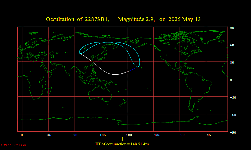 Occultation predictions of 2287SB1 Magnitude 2.9 Date 2025 May 13 Moon: % illumination = 99-, Solar elongation = 169 Disappearance U.T. Sun Moon CA PA WA a b Location h m s Alt Alt Az o o o m/o m/o 1 CN Beijing 13 37 3 10 138 -60S 159 148 -0.2 -0.9 2 CN Dalian 13 38 5 14 141 -67S 152 141 +0.2 -0.7 4 CN Hangzhou 13 57 31 23 143 -26S 193 182 -3.7 -6.4 5 CN Harbin 13 39 45 11 146 -88N 128 117 +0.8 +0.3 6 CN Hohhot 13 37 48 7 134 -51S 168 157 -0.6 -1.4 7 CN Jiamusi 13 44 17 12 151 -80N 120 108 +1.1 +0.4 8 CN Mudanjiang 13 42 30 13 150 -85N 125 114 +1.0 +0.2 9 CN Nanjing 13 53 58 20 141 -28S 190 179 -3.0 -5.3 10 CN Ningbo 13 56 41 23 143 -29S 189 178 -2.8 -5.2 11 CN Qingdao 13 40 44 16 141 -56S 163 152 -0.2 -1.4 12 CN Shanghai 13 51 9 22 142 -37S 181 170 -1.4 -3.4 13 CN Shijiazhuang 13 40 16 11 136 -48S 170 159 -0.7 -1.8 14 CN Taiyuan 13 43 15 11 136 -39S 180 169 -1.4 -2.8 15 CN Tianjin 13 37 51 12 138 -58S 160 149 -0.2 -1.1 16 CN Yanji 13 42 2 14 149 -89N 128 117 +1.0 +0.1 17 CN Yantai 13 39 24 15 141 -62S 157 146 +0.1 -1.0 18 JP Akita 13 55 51 22 161 -78N 118 107 +1.6 +0.0 19 JP Amami 13 53 14 28 149 -54S 165 154 +0.0 -2.1 20 JP Aomori 13 56 38 21 162 -75N 115 104 +1.7 +0.0 21 JP Asahikawa 13 59 59 19 165 -68N 108 97 +1.7 +0.2 22 JP Ashiya 13 46 7 23 149 -73S 146 135 +0.7 -0.9 23 JP Atsugi 13 55 22 26 160 -87N 127 116 +1.5 -0.4 24 JP Chitose 13 58 25 19 164 -71N 110 99 +1.7 +0.2 25 JP Fukue 13 46 20 23 148 -65S 154 143 +0.4 -1.2 26 JP Fukui 13 50 30 24 156 -89S 131 120 +1.3 -0.4 27 JP Fukuoka 13 46 14 23 149 -71S 148 137 +0.7 -0.9 28 JP Futema 14 0 11 30 148 -38S 180 169 -1.2 -3.7 29 JP Gifu 13 51 39 25 157 -88S 131 120 +1.3 -0.4 30 JP Hachijojima 13 57 1 28 160 -89S 131 120 +1.5 -0.6 31 JP Hachinoe 13 57 55 21 163 -74N 114 103 +1.7 +0.0 32 JP Hakodate 13 56 55 20 162 -73N 113 102 +1.7 +0.1 33 JP Hamamatsu 13 53 4 26 158 -88S 131 120 +1.4 -0.5 34 JP Hanamaki 13 57 25 22 162 -77N 117 106 +1.7 +0.0 35 JP Hiroshima 13 47 31 24 152 -79S 140 129 +1.0 -0.7 36 JP Hofu 13 46 41 23 150 -75S 144 133 +0.8 -0.8 37 JP Hyakuri 13 56 43 25 161 -84N 124 113 +1.6 -0.3 38 JP Iejima 13 58 23 29 148 -41S 178 167 -0.9 -3.4 39 JP Iki 13 45 39 23 149 -70S 149 138 +0.6 -1.0 40 JP Iruma 13 55 12 25 160 -86N 126 115 +1.6 -0.3 41 JP Iwakuni 13 47 8 24 151 -77S 143 131 +0.9 -0.8 42 JP Iwojima 14 8 21 37 163 -72S 147 136 +1.4 -1.7 43 JP Izumo 13 46 57 23 152 -81S 138 127 +1.0 -0.6 44 JP Kadena 13 59 40 30 148 -39S 180 169 -1.1 -3.6 45 JP Kagoshima 13 48 15 25 150 -67S 152 141 +0.6 -1.2 46 JP Kanazawa 13 50 39 23 156 -90S 130 119 +1.3 -0.3 47 JP Kanoya 13 48 53 26 150 -66S 153 142 +0.6 -1.3 48 JP Kisarazu 13 56 9 26 160 -86N 126 115 +1.6 -0.4 49 JP Kitadaito 13 58 58 32 151 -50S 169 158 -0.1 -2.6 50 JP Kitakyushu 13 46 22 23 150 -73S 146 135 +0.7 -0.9 51 JP Kochi 13 48 54 25 153 -78S 141 130 +1.0 -0.8 52 JP Kohnan 13 48 30 24 153 -81S 138 127 +1.1 -0.6 53 JP Kumamoto 13 47 13 24 150 -70S 149 138 +0.7 -1.0 54 JP Kumejima 14 1 11 29 147 -34S 184 173 -1.7 -4.4 55 JP Matsumoto 13 52 49 24 158 -88N 128 117 +1.4 -0.3 56 JP Matsushima 13 57 38 23 162 -79N 118 107 +1.7 -0.1 57 JP Matsuyama 13 47 47 24 152 -77S 142 131 +0.9 -0.8 58 JP Memanbetsu 14 3 0 19 167 -66N 106 94 +1.8 +0.2 59 JP Miho 13 47 16 23 152 -82S 137 126 +1.0 -0.5 60 JP Minami Daito 13 59 14 32 151 -49S 169 158 -0.1 -2.6 61 JP Minami Tori Shima 14 34 33 40 185 -88N 128 116 +2.5 -1.4 62 JP Misawa 13 57 46 21 163 -74N 114 103 +1.7 +0.0 63 JP Miyake Jima 13 56 7 27 160 -90N 129 118 +1.5 -0.5 64 JP Miyazaki 13 48 42 25 150 -69S 150 139 +0.7 -1.1 65 JP Monbetsu 14 1 43 18 166 -66N 106 95 +1.8 +0.2 66 JP Nagasaki 13 46 36 24 149 -69S 150 139 +0.6 -1.1 67 JP Nagoya 13 51 48 25 157 -88S 131 120 +1.3 -0.5 68 JP Naha 14 0 30 30 148 -38S 181 170 -1.3 -3.8 69 JP Nakashibetsu 14 4 25 19 168 -65N 105 94 +1.9 +0.1 70 JP Nanki-Shirahama 13 50 42 26 155 -82S 138 127 +1.2 -0.7 71 JP Nyutabaru 13 48 27 25 150 -70S 149 138 +0.7 -1.1 72 JP Obihiro 14 1 10 20 166 -69N 109 97 +1.8 +0.1 73 JP Oita 13 47 18 24 151 -74S 145 134 +0.8 -0.9 74 JP Okayama 13 48 18 24 153 -81S 138 127 +1.1 -0.6 75 JP Oki Island 13 47 1 22 152 -84S 136 125 +1.1 -0.5 76 JP Okierabu 13 55 52 29 148 -47S 171 160 -0.4 -2.7 77 JP Osaka 13 50 26 25 155 -84S 135 124 +1.2 -0.6 78 JP Oshima 13 55 28 26 160 -89N 128 117 +1.5 -0.4 79 JP Ozuki 13 46 17 23 150 -74S 145 134 +0.8 -0.8 80 JP Rishiri Island 13 58 13 17 163 -67N 107 96 +1.6 +0.3 81 JP Sapporo 13 58 28 19 164 -71N 110 99 +1.7 +0.2 82 JP Sendai 13 57 10 24 162 -80N 119 108 +1.7 -0.1 83 JP Shimofusa 13 56 9 26 161 -85N 125 114 +1.6 -0.3 84 JP Shonai 13 55 14 23 161 -80N 120 109 +1.6 -0.1 85 JP Takamatsu 13 48 50 24 153 -80S 139 128 +1.1 -0.7 86 JP Tanegashima 13 50 1 27 150 -64S 155 144 +0.5 -1.4 87 JP Tateyama 13 56 11 26 160 -87N 127 116 +1.6 -0.4 88 JP Tokachi 14 1 5 20 166 -68N 108 97 +1.8 +0.1 89 JP Tokunoshima 13 54 42 28 148 -49S 169 158 -0.2 -2.4 90 JP Tokushima 13 49 31 25 154 -81S 138 127 +1.1 -0.7 91 JP Tokyo 13 56 47 26 161 -85N 125 113 +1.6 -0.3 92 JP Tottori 13 48 15 23 153 -84S 136 125 +1.1 -0.5 93 JP Toyama 13 51 37 24 157 -89N 128 117 +1.4 -0.3 94 JP Tsuiki 13 46 34 23 150 -73S 146 135 +0.7 -0.9 95 JP Tsushima 13 44 54 22 148 -71S 148 137 +0.6 -0.9 96 JP Wakkanai 13 59 16 17 164 -66N 106 95 +1.7 +0.3 97 JP Yaizu 13 53 54 26 158 -90S 130 119 +1.4 -0.5 98 JP Yakushima 13 50 9 27 150 -63S 156 145 +0.4 -1.5 99 JP Yamagata 13 56 13 23 161 -80N 120 109 +1.6 -0.1 100 JP Yamaguchi 13 46 33 23 150 -74S 145 134 +0.8 -0.8 101 JP Yokota 13 55 7 25 160 -87N 126 115 +1.5 -0.4 102 JP Yoron 13 56 57 29 148 -45S 174 163 -0.6 -2.9 103 JP Zama 13 55 15 26 160 -87N 127 116 +1.5 -0.4 104 KR Busan 13 44 1 21 148 -73S 146 135 +0.6 -0.8 105 KR Cheju 13 44 29 21 146 -62S 157 146 +0.2 -1.3 106 KR Chinhae 13 43 46 21 148 -72S 147 136 +0.6 -0.8 107 KR Chongju 13 41 56 19 147 -73S 146 135 +0.6 -0.7 108 KR Chunchon 13 41 21 18 147 -77S 142 131 +0.7 -0.5 109 KR Jhunju 13 42 19 19 146 -70S 149 137 +0.5 -0.8 110 KR Kangnung 13 42 17 19 148 -79S 140 129 +0.8 -0.4 111 KR Kimhae 13 4