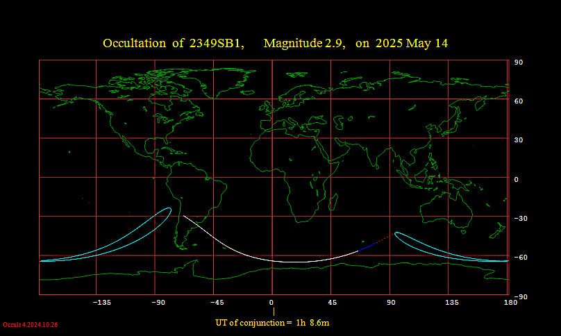 Occultation predictions of 2349SB1 Magnitude 2.9 Date 2025 May 13 Moon: % illumination = 98-, Solar elongation = 165 Disappearance U.T. Sun Moon CA PA WA a b Location h m s Alt Alt Az o o o m/o m/o 1 AQ Isla Rey Jorge 23 48 15 29 90 -63N 88 79 +0.3 -1.7 2 AQ Marambio Base 23 52 28 31 86 -63N 88 79 +0.3 -1.7 3 AR Bahia Blanca 23 17 43 18 109 -29N 55 46 +0.8 -0.3 4 AR Bolivar 23 19 17 19 109 -17N 42 33 +1.6 +0.8 5 AR Chosmadal 23 13 29 11 114 -41N 66 57 +0.2 -0.6 6 AR Colonel Suarez 23 17 45 18 109 -24N 50 41 +1.0 +0.0 7 AR Comodoro Rivadavia 23 21 49 18 109 -53N 78 69 +0.1 -1.2 8 AR Cutralco 23 14 44 13 113 -42N 68 59 +0.2 -0.8 9 AR El Bolson 23 17 15 13 113 -51N 76 67 +0.0 -1.0 10 AR El Maiten 23 17 19 13 113 -51N 76 67 +0.0 -1.0 11 AR Esquel 23 18 15 13 113 -52N 78 68 +0.0 -1.1 12 AR Fuerte Gral Roca 23 15 9 14 112 -40N 65 56 +0.3 -0.7 13 AR General Pico 23 16 7 16 111 -23N 48 39 +1.0 +0.2 14 AR Jose De San Martin 23 19 32 15 112 -53N 79 69 +0.0 -1.1 15 AR Junin 23 22 52 19 109 -5N 30 21 +4.2 +4.6 16 AR Laboulaye 23 17 39 16 111 -14N 40 31 +1.7 +1.2 17 AR Lago Argentino 23 27 47 17 110 -64N 89 80 -0.1 -1.4 18 AR Las Heras 23 22 35 17 110 -55N 81 71 +0.1 -1.3 19 AR Malargue 23 12 34 11 114 -35N 60 51 +0.3 -0.4 20 AR Mar Del Plata 23 23 52 23 106 -12N 38 29 +2.3 +1.5 21 AR Mendoza 23 12 38 10 114 -25N 50 41 +0.6 +0.2 22 AR Necochea 23 21 12 21 106 -20N 45 36 +1.4 +0.4 23 AR Neuquen 23 14 59 13 112 -41N 66 57 +0.2 -0.7 24 AR Olavarria 23 20 3 20 108 -17N 43 34 +1.6 +0.7 25 AR Pehuajo 23 18 19 18 109 -18N 43 34 +1.4 +0.7 26 AR Puerto Deseado 23 24 28 20 107 -54N 79 70 +0.2 -1.3 27 AR Puerto Madryn 23 19 0 18 109 -44N 69 60 +0.3 -0.9 28 AR Rio Cuarto 23 17 32 15 111 -12N 37 28 +1.9 +1.8 29 AR Rio Gallegos 23 29 34 19 107 -62N 87 78 +0.0 -1.5 30 AR Rio Grande 23 32 53 21 105 -63N 88 79 +0.1 -1.5 31 AR Rio Turbio 23 29 38 18 109 -65N 90 81 -0.1 -1.5 32 AR San Carlos De Bariloch 23 16 27 12 113 -49N 75 65 +0.0 -1.0 33 AR San Julian 23 26 20 19 107 -58N 83 74 +0.1 -1.4 34 AR San Luis 23 14 26 13 113 -20N 46 36 +1.0 +0.6 35 AR San Martin Des Andes 23 15 26 12 114 -47N 73 63 +0.0 -0.9 36 AR San Rafael 23 12 48 11 114 -30N 55 46 +0.5 -0.1 37 AR Santa Cruz 23 27 17 19 108 -60N 85 76 +0.0 -1.4 38 AR Santa Rosa 23 15 39 16 111 -27N 53 44 +0.8 -0.1 39 AR Tandil 23 21 27 21 107 -15N 41 32 +1.8 +1.0 40 AR Trelew 23 19 23 18 109 -45N 70 61 +0.3 -1.0 41 AR Tres Arroyos 23 19 20 20 108 -24N 49 40 +1.1 +0.1 42 AR Ushuaia 23 34 33 22 104 -65N 90 81 +0.0 -1.6 43 AR Viedma 23 18 17 18 108 -37N 62 53 +0.5 -0.7 44 AR Villa Dolores 23 18 14 14 112 -7N 33 24 +2.7 +3.1 45 AR Villa Gesell 23 27 57 24 105 -3N 28 19 +5.9 +6.4 46 AR Villa Reynolds 23 15 11 14 112 -19N 45 36 +1.1 +0.6 47 CL Alto Palena 23 19 4 13 113 -54N 80 70 +0.0 -1.1 48 CL Ancud 23 17 20 11 115 -54N 79 70 -0.1 -1.0 49 CL Balmaceda 23 21 47 15 112 -58N 83 74 +0.0 -1.2 50 CL Castro 23 17 57 11 114 -55N 80 71 -0.1 -1.1 51 CL Chaiten 23 18 21 12 114 -54N 79 70 -0.1 -1.1 52 CL Chile Chico 23 22 38 15 111 -59N 84 75 +0.0 -1.3 53 CL Chillan 23 12 45 9 115 -41N 67 57 +0.1 -0.6 54 CL Concepcion 23 12 50 9 116 -43N 68 59 +0.0 -0.7 55 CL Coyhaique 23 21 25 14 112 -58N 83 74 -0.1 -1.2 56 CL Curico 23 12 3 9 115 -36N 61 52 +0.2 -0.4 57 CL La Serena 23 12 25 7 116 -18N 44 35 +0.8 +0.9 58 CL Los Angeles 23 13 17 9 115 -44N 69 60 +0.1 -0.7 59 CL Osorno 23 15 58 11 115 -51N 76 67 +0.0 -1.0 60 CL Porvenir 23 32 3 20 107 -65N 90 81 +0.0 -1.5 61 CL Puerto Montt 23 16 47 11 114 -52N 77 68 -0.1 -1.0 62 CL Puerto Williams 23 34 43 22 104 -64N 89 80 +0.1 -1.6 63 CL Punta Arenas 23 31 40 19 107 -65N 90 81 +0.0 -1.5 64 CL Rancagua 23 11 48 9 115 -33N 58 49 +0.3 -0.3 65 CL Santiago 23 11 44 9 115 -30N 56 47 +0.4 -0.1 66 CL Santo Domingo 23 11 28 8 115 -33N 58 49 +0.3 -0.2 67 CL Temuco 23 14 17 10 115 -47N 72 63 +0.0 -0.8 68 CL Valdivia 23 15 5 10 115 -49N 74 65 +0.0 -0.9 69 CL Vallenar 23 14 59 7 115 -9N 34 25 +1.9 +2.7 70 FK Mount Pleasant 23 32 3 26 99 -50N 76 66 +0.4 -1.4 71 FK Stanley 23 32 10 27 98 -49N 75 65 +0.4 -1.3 72 NZ Weydon 0 47 13 -6 14 194 -90N 114 105 -0.3 +0.6 Reappearance U.T. Sun Moon CA PA WA a b Location h m s Alt Alt Az o o o m/o m/o 1 AQ Isla Rey Jorge 0 47 47 36 77 78N 306 297 +0.2 -2.1 2 AQ Marambio Base 0 52 37 37 72 79N 305 296 +0.2 -2.1 3 AR Bahia Blanca 23 50 57 24 104 39N 346 338 -1.0 -3.0 4 AR Bolivar 23 40 49 23 106 26N 360 351 -1.8 -4.1 5 AR Chosmadal 23 54 9 19 108 51N 334 325 -0.7 -2.4 6 AR Colonel Suarez 23 46 37 24 105 34N 352 343 -1.2 -3.3 7 AR Comodoro Rivadavia 0 11 53 26 101 64N 321 312 -0.3 -2.2 8 AR Cutralco 23 57 2 20 107 53N 332 323 -0.6 -2.4 9 AR El Bolson 0 5 5 21 106 63N 322 313 -0.5 -2.1 10 AR El Maiten 0 5 6 21 106 62N 322 314 -0.5 -2.2 11 AR Esquel 0 6 58 22 105 64N 321 312 -0.4 -2.1 12 AR Fuerte Gral Roca 23 56 6 21 106 50N 335 326 -0.7 -2.5 13 AR General Pico 23 43 9 21 107 32N 353 344 -1.4 -3.4 14 AR Jose De San Martin 0 9 7 23 104 65N 320 311 -0.4 -2.1 15 AR Junin 23 31 52 21 108 13N 12 3 -4.5 -7.8 16 AR Laboulaye 23 36 38 19 108 24N 2 353 -2.1 -4.4 17 AR Lago Argentino 0 22 34 25 100 77N 308 299 -0.2 -2.0 18 AR Las Heras 0 13 59 25 101 67N 318 309 -0.3 -2.2 19 AR Malargue 23 48 48 17 109 45N 340 331 -0.9 -2.6 20 AR Mar Del Plata 23 41 27 26 103 21N 4 355 -2.4 -5.0 21 AR Mendoza 23 40 35 16 111 35N 350 341 -1.3 -3.1 22 AR Necochea 23 46 7 26 103 29N 357 348 -1.5 -3.8 23 AR Neuquen 23 56 20 21 107 51N 334 325 -0.7 -2.4 24 AR Olavarria 23 42 10 24 105 26N 359 350 -1.8 -4.1 25 AR Pehuajo 23 40 49 22 107 27N 358 349 -1.7 -3.9 26 AR Puerto Deseado 0 15 48 28 98 65N 320 311 -0.2 -2.2 27 AR Puerto Madryn 0 3 51 26 102 54N 330 322 -0.5 -2.4 28 AR Rio Cuarto 23 33 51 18 109 21N 4 355 -2.4 -4.8 29 AR Rio Gallegos 0 24 45 28 97 75N 309 301 -0.1 -2.1 30 AR Rio Grande 0 29 9 30 94 76N 308 299 -0.1 -2.1 31 AR Rio Turbio 0 25 8 26 99 78N 306 297 -0.1 -2.0 32 AR San Carlos De Bariloch 0 3 11 21 106 61N 324 315 -0.5 -2.2 33 AR San Julian 0 19 39 28 98 70N 315 306 -0.2 -2.2 34 AR San Luis 23 38 36 17 110 30N 355 346 -1.5 -3.5 35 AR San Mart