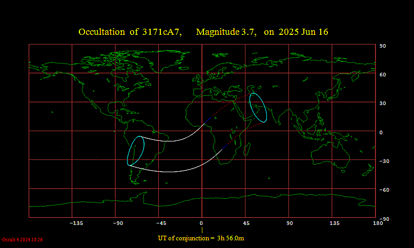 Occultation predictions of 3171cA7 Magnitude 3.7 Date 2025 Jun 16 Moon: % illumination = 77-, Solar elongation = 123 Disappearance U.T. Sun Moon CA PA WA a b Location h m s Alt Alt Az o o o m/o m/o 1 AO Benguela 3 42 40 81 243 -89N 72 90 +2.8 +1.1 2 AO Cabinda 3 50 6 76 218 -67N 50 67 +2.1 +1.9 3 AO Camaxilo 4 2 16 70 244 -88S 75 93 +2.7 +0.9 4 AO Cazombo 4 13 30 -8 65 256 -63S 100 117 +3.7 -0.3 5 AO Chitato 4 8 18 -10 66 245 -85S 78 95 +2.7 +0.8 6 AO Huambo 3 49 27 77 251 -84S 79 97 +3.0 +0.8 7 AO Kuito 3 53 21 75 252 -81S 81 99 +3.1 +0.7 8 AO Lobito 3 43 18 81 242 -89N 72 89 +2.8 +1.1 9 AO Luanda 3 47 2 78 229 -78N 61 79 +2.4 +1.5 10 AO Luena 4 3 8 70 254 -74S 89 106 +3.3 +0.3 11 AO Malanje 3 54 3 75 241 -88N 71 89 +2.7 +1.1 12 AO M'Banza-Congo 3 53 24 74 227 -74N 57 74 +2.2 +1.6 13 AO Menongue 3 55 1 75 260 -72S 91 109 +3.5 +0.2 14 AO Mocamedes 3 36 29 84 255 -86S 77 94 +3.0 +0.8 15 AO Negage 3 53 38 75 234 -81N 63 81 +2.4 +1.4 16 AO N'Giva 3 47 30 79 270 -70S 93 110 +3.6 +0.0 17 AO Porto Amboim 3 45 51 79 236 -85N 68 85 +2.7 +1.2 18 AO Saurimo 4 5 36 -11 68 249 -79S 84 101 +3.0 +0.6 19 AO Soyo 3 49 29 76 220 -69N 52 69 +2.1 +1.8 20 AO Toto 3 52 2 75 229 -76N 59 77 +2.3 +1.5 21 AO Uige 3 53 12 75 233 -80N 62 80 +2.4 +1.4 22 AO Xangongo 3 44 58 80 269 -73S 89 107 +3.5 +0.2 23 AR Bahia Blanca 2 10 16 10 103 -16S 146 164 -1.3 -6.6 24 AR Bolivar 1 59 17 8 105 -37S 125 143 -0.5 -2.8 25 AR Buenos Aires 1 54 19 9 104 -49S 114 132 -0.3 -2.1 28 AR Colonel Suarez 2 3 42 9 104 -28S 134 152 -0.7 -3.8 29 AR Concordia 1 48 42 7 105 -62S 100 118 -0.1 -1.4 33 AR Dolores 1 58 18 11 103 -41S 122 139 -0.3 -2.7 34 AR El Palomar 1 54 29 9 104 -48S 114 132 -0.3 -2.1 39 AR Gualeguaychu 1 51 22 8 105 -55S 108 125 -0.2 -1.7 40 AR Iguazu Falls 1 43 42 8 105 -86S 77 95 +0.1 -0.4 41 AR Jose C. Paz 1 54 26 8 104 -48S 114 132 -0.3 -2.1 43 AR Junin 1 55 6 7 105 -46S 117 135 -0.4 -2.2 45 AR La Plata 1 55 4 9 104 -47S 115 133 -0.3 -2.2 51 AR Mar Del Plata 2 3 7 12 102 -32S 131 148 -0.4 -3.6 55 AR Monte Caseros 1 47 24 7 105 -67S 96 114 -0.1 -1.2 56 AR Moron 1 54 38 9 104 -48S 115 132 -0.3 -2.1 57 AR Necochea 2 5 56 12 102 -26S 137 154 -0.6 -4.4 58 AR Obera 1 44 42 8 105 -79S 84 101 +0.1 -0.7 59 AR Olavarria 2 0 55 9 104 -34S 128 146 -0.5 -3.1 62 AR Paso De Los Libres 1 46 44 7 105 -69S 93 111 -0.1 -1.1 63 AR Pehuajo 1 58 43 7 105 -38S 125 142 -0.5 -2.7 64 AR Posadas 1 44 33 7 105 -79S 84 102 +0.0 -0.7 66 AR Punta Indio 1 55 46 10 103 -46S 116 134 -0.2 -2.3 72 AR San Fernando 1 54 9 9 104 -49S 114 131 -0.3 -2.1 73 AR San Justo 1 54 44 9 104 -48S 115 133 -0.3 -2.2 78 AR Santa Teresita 1 58 36 11 102 -41S 122 139 -0.3 -2.7 80 AR Tandil 2 1 34 10 103 -34S 129 146 -0.5 -3.2 83 AR Tres Arroyos 2 6 29 11 103 -24S 139 156 -0.8 -4.6 86 AR Villa Gesell 2 0 41 12 102 -37S 126 143 -0.3 -3.0 88 BJ Cotonou 4 22 50 66 198 6N 337 354 -4.0 +8.0 119 BR Alpinopolis 1 47 7 15 103 -69N 52 70 +0.6 +0.6 121 BR Aracaju 2 26 0 30 103 -3N 346 4 +9.9 +9.9 122 BR Aracatuba 1 44 44 10 104 -74N 57 75 +0.4 +0.4 123 BR Araracuara 1 45 33 13 103 -75N 58 75 +0.5 +0.4 124 BR Assis 1 44 19 11 104 -80N 62 80 +0.4 +0.2 125 BR Bage 1 48 37 10 103 -66S 97 115 +0.0 -1.3 126 BR Barbacena 1 48 26 17 102 -69N 52 70 +0.7 +0.6 127 BR Barra Do Garcas 1 48 9 8 105 -55N 38 56 +0.6 +1.3 128 BR Bauru 1 44 57 12 103 -78N 60 78 +0.4 +0.2 129 BR Belo Horizonte 1 49 22 17 102 -64N 47 65 +0.8 +0.9 130 BR Bom Jesus Da Lapa 2 2 0 19 103 -33N 15 33 +1.3 +3.3 131 BR Brasilia 1 51 17 13 104 -51N 33 51 +0.8 +1.6 132 BR Campinas 1 45 43 14 102 -78N 61 79 +0.5 +0.2 134 BR Campos 1 50 4 20 100 -69N 52 70 +0.8 +0.6 135 BR Caravelas 1 56 27 23 101 -52N 35 52 +1.0 +1.7 136 BR Cascavel 1 43 37 8 104 -89S 73 91 +0.2 -0.3 137 BR Castilho 1 44 25 9 104 -74N 57 74 +0.4 +0.4 138 BR Caxias Do Sul 1 46 30 12 102 -76S 86 104 +0.2 -0.9 139 BR Chapeco 1 44 43 10 104 -82S 80 98 +0.2 -0.6 141 BR Criciuma 1 46 31 13 102 -79S 83 101 +0.3 -0.7 143 BR Curitiba 1 44 51 12 103 -89N 71 89 +0.3 -0.2 144 BR Florianopolis 1 46 4 14 102 -84S 79 96 +0.3 -0.6 145 BR Foz Do Iguacu 1 43 40 8 105 -86S 76 94 +0.1 -0.4 146 BR Franca 1 46 33 13 103 -70N 52 70 +0.6 +0.6 147 BR Fronteira 1 45 46 12 104 -70N 53 70 +0.5 +0.6 148 BR Goiania 1 49 10 11 104 -55N 38 56 +0.7 +1.4 150 BR Guaratingueta 1 46 50 16 102 -76N 59 77 +0.6 +0.3 151 BR Ilheus 2 2 43 24 102 -38N 21 38 +1.2 +2.8 152 BR Ipatinga 1 50 54 19 102 -62N 44 62 +0.8 +1.0 153 BR Itumbiara 1 47 7 11 104 -63N 46 63 +0.6 +0.9 154 BR Joinville 1 45 17 13 102 -89S 74 92 +0.3 -0.3 155 BR Juiz De Fora 1 48 24 18 101 -71N 54 72 +0.7 +0.5 156 BR Lagoa Santa 1 49 35 17 102 -63N 46 64 +0.8 +0.9 157 BR Lajes 1 45 34 12 102 -82S 81 98 +0.2 -0.6 158 BR Lins 1 44 52 11 104 -76N 58 76 +0.4 +0.3 159 BR Londrina 1 44 0 10 104 -83N 65 83 +0.3 +0.0 160 BR Marilia 1 44 37 11 104 -78N 60 78 +0.4 +0.2 161 BR Maringa 1 43 46 9 104 -84N 67 84 +0.3 +0.0 162 BR Montes Claros 1 53 28 17 103 -51N 34 51 +0.9 +1.7 163 BR Navegantes 1 45 35 13 102 -87S 76 94 +0.3 -0.4 164 BR Passo Fundo 1 45 29 10 103 -79S 84 101 +0.2 -0.7 165 BR Pelotas 1 49 7 12 102 -66S 97 114 +0.1 -1.3 166 BR Piracununga 1 45 54 14 103 -75N 58 75 +0.5 +0.4 167 BR Pocos De Caldas 1 46 21 14 102 -74N 56 74 +0.6 +0.4 168 BR Ponta Grossa 1 44 31 11 103 -89N 71 89 +0.3 -0.2 170 BR Porto Alegre 1 47 18 12 102 -73S 89 107 +0.2 -1.0 171 BR Porto Nacional 2 5 29 15 105 -20N 3 21 +1.6 +5.4 173 BR President Prudente 1 44 2 10 104 -79N 62 79 +0.4 +0.2 174 BR Ribeirao Preto 1 46 2 13 103 -72N 55 72 +0.5 +0.5 176 BR Rio De Janeiro 1 48 5 18 101 -75N 58 75 +0.7 +0.4 177 BR Rio Grande 1 49 36 12 102 -65S 98 115 +0.1 -1.4 178 BR Salvador 2 10 12 26 102 -26N 8 26 +1.4 +4.3 179 BR Santarem 1 46 44 10 103 -72S 90 108 +0.1 -1.0 180 BR Santo Angelo 1 45 22 9 104 -77S 86 103 +0.1 -0.8 181 BR Santos 1 46 3 15 102 -81N 64 81 +0.5 +0.1 182 BR Sao Jose Do Rio Preto 1 45 21 11 104 -72N 55 73 +0.5 +0.5 183 BR Sao Jose Dos Campos 1 46 20 15 102 -78N 61 79 +0.5 +0.2 184 BR Sao Paulo 1 45 51 15 102 -80N 63 81 +0.5 +0.1 185 BR Sao Pedro Da Aldeia 1 48 53