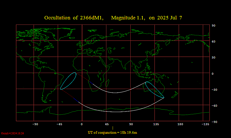 Occultation predictions of 2366dM1 Magnitude 1.1 Date 2025 Jul 7 Moon: % illumination = 90+, Solar elongation = 144 Disappearance U.T. Sun Moon CA PA WA a b Location h m s Alt Alt Az o o o m/o m/o 1 AU Adelaide 19 17 37 3 239 74S 109 100 -0.2 +0.6 2 AU Adelaide 19 17 42 3 239 74S 108 100 -0.2 +0.6 3 AU Argyle 19 19 14 2 240 81S 101 93 -0.3 +0.7 4 AU Avalon 19 15 26 1 236 58S 125 116 -0.1 +0.2 5 AU Edinburgh 19 17 41 3 239 75S 108 100 -0.2 +0.6 6 AU Hobart 19 15 6 2 235 39S 144 135 +0.2 -0.2 7 AU Kalgoorlie 19 25 3 12 246 72N 74 66 -0.2 +1.4 8 AU Karratha 19 48 27 7 244 25N 27 19 -1.5 +3.5 9 AU Launceston 19 14 55 1 235 43S 139 131 +0.1 -0.1 10 AU Learmonth 19 47 0 10 245 26N 28 20 -1.4 +3.5 11 AU Melbourne 19 15 27 0 236 58S 125 116 -0.1 +0.2 12 AU Perth 19 24 22 17 249 67N 70 61 -0.1 +1.6 13 AU Point Cook 19 15 25 1 236 58S 125 117 -0.1 +0.2 14 AU Port Hedland 19 46 54 6 244 29N 31 22 -1.3 +3.1 15 AU Woomera 19 20 27 2 240 86S 97 88 -0.3 +0.7 16 BW Jwaneng 16 53 17 51 103 32N 34 26 +8.6 +8.9 17 BX Mmabatho 16 51 45 51 101 39N 41 33 +5.5 +4.4 18 BX Thaba Nchu 16 48 54 52 97 55N 58 49 +3.1 +1.0 19 LS Maseru 16 51 3 53 96 54N 56 47 +3.3 +1.2 20 ZA Aggeneys 16 31 16 -7 42 101 76N 78 70 +1.6 -0.6 22 ZA Bethlehem 16 56 26 55 97 43N 46 37 +4.6 +3.1 23 ZA Bisho 16 48 54 53 92 68N 71 62 +2.3 -0.1 24 ZA Bloemfontein 16 47 33 51 97 56N 58 50 +3.0 +0.9 25 ZA Bothaville 16 51 29 52 99 45N 48 39 +4.2 +2.6 26 ZA Calvinia 16 34 10 -9 43 98 80N 83 74 +1.5 -0.8 27 ZA Cape Town 16 35 14 -9 43 96 89N 92 83 +1.2 -1.2 28 ZA Carletonville 17 0 28 55 99 31N 33 25 +9.9 +9.9 29 ZA De Aar 16 41 8 48 97 69N 71 62 +2.1 -0.2 30 ZA Dundee 17 8 36 59 95 30N 32 24 +9.9 +9.9 31 ZA Durban 17 3 7 59 93 44N 46 37 +4.5 +3.2 32 ZA East London 16 50 13 54 91 68N 70 61 +2.3 -0.1 33 ZA Ficksburg 16 53 18 54 96 49N 51 43 +3.8 +1.9 34 ZA George 16 40 22 47 94 82N 85 76 +1.5 -0.9 35 ZA Grahamstown 16 47 20 52 92 71N 74 65 +2.1 -0.3 36 ZA Greytown 17 4 35 59 94 39N 41 32 +5.6 +4.7 37 ZA Harmony 16 50 52 53 98 49N 51 42 +3.7 +1.9 38 ZA Harrismith 17 0 24 57 96 39N 42 33 +5.4 +4.4 39 ZA Heibron 16 58 38 55 98 37N 39 31 +6.1 +5.3 40 ZA Hendrik Verwoerddam 16 44 47 50 96 64N 67 58 +2.4 +0.2 41 ZA Kimberley 16 43 27 49 98 59N 62 53 +2.7 +0.6 43 ZA Klerksdorp 16 53 24 53 99 41N 44 35 +5.0 +3.7 44 ZA Kroonstad 16 53 36 54 98 44N 46 38 +4.4 +2.9 45 ZA Kuruman 16 40 39 47 100 58N 60 51 +2.7 +0.7 46 ZA Ladybrand 16 51 8 53 96 53N 55 46 +3.4 +1.4 47 ZA Ladysmith 17 2 26 58 95 39N 41 32 +5.6 +4.7 48 ZA Langebaanweg 16 33 33 -8 42 98 87N 90 81 +1.2 -1.1 49 ZA Lichtenburg 16 53 33 52 100 38N 41 32 +5.7 +4.7 50 ZA Mafikeng 16 52 19 51 101 38N 40 32 +5.7 +4.8 51 ZA Margate 16 58 43 58 92 51N 54 45 +3.5 +1.6 52 ZA Oudtshoorn 16 39 43 47 94 81N 84 75 +1.5 -0.9 53 ZA Overberg 16 37 55 -11 45 95 87N 90 81 +1.3 -1.1 54 ZA Parys 16 57 46 54 99 37N 39 30 +6.3 +5.6 55 ZA Pietermaritzburg 17 1 33 58 93 44N 46 38 +4.5 +3.1 56 ZA Plettenberg Bay 16 41 55 48 93 80N 83 74 +1.6 -0.8 57 ZA Pomfret 16 42 52 48 102 49N 52 43 +3.5 +1.8 58 ZA Port Elizabeth 16 45 54 51 92 76N 78 69 +1.9 -0.6 59 ZA Port Saint Johns 16 55 11 56 92 58N 60 51 +3.0 +0.8 60 ZA Potchefstroom 16 56 19 54 99 37N 39 31 +6.1 +5.3 61 ZA Queenstown 16 47 57 52 93 66N 68 60 +2.4 +0.0 62 ZA Robertson 16 36 38 -11 44 96 86N 89 80 +1.3 -1.1 63 ZA Saldanha 16 33 19 -8 42 98 88N 90 82 +1.2 -1.1 64 ZA Sishen 16 39 26 -12 47 100 60N 62 54 +2.6 +0.5 65 ZA Springbok 16 30 13 -6 41 101 79N 81 73 +1.4 -0.7 66 ZA Tommy'S Field 16 39 9 -12 47 100 62N 65 56 +2.4 +0.3 67 ZA Umtata 16 52 43 55 92 60N 62 54 +2.8 +0.6 68 ZA Upington 16 35 20 -9 44 101 67N 70 61 +2.0 -0.1 69 ZA Vanderbijlpark 17 1 13 55 99 32N 34 26 +8.7 +9.3 70 ZA Vereeniging 17 4 56 56 99 27N 29 20 +9.9 +9.9 71 ZA Vredendal 16 32 42 -8 42 99 83N 86 77 +1.3 -0.9 72 ZA Vryburg 16 45 8 49 100 51N 53 45 +3.4 +1.6 73 ZA Welkom 16 50 16 52 98 49N 51 43 +3.7 +1.9 74 ZA Wesselsbrunn 16 49 23 52 99 49N 52 43 +3.6 +1.8 75 ZA Ysterplaat 16 35 2 -9 43 96 89N 92 83 +1.2 -1.2 76 ZA Zeerust 16 56 3 53 101 33N 35 27 +8.0 +8.1 Reappearance U.T. Sun Moon CA PA WA a b Location h m s Alt Alt Az o o o m/o m/o 10 AU Learmonth 20 16 8 4 243 -34N 328 320 +1.1 -1.8 12 AU Perth 20 19 45 6 243 -73N 289 281 +0.0 +0.5 16 BW Jwaneng 17 7 46 54 102 12N 14 5 +9.9 +9.9 17 BX Mmabatho 17 16 13 57 100 4N 6 358 -2.9 -8.4 18 BX Thaba Nchu 17 36 7 63 92 -14N 348 340 -0.2 -4.9 19 LS Maseru 17 36 38 63 91 -12N 350 341 -0.3 -5.1 20 ZA Aggeneys 17 34 17 55 95 -34N 328 320 +0.5 -3.1 21 ZA Alexander Bay 17 31 8 52 97 -37N 325 317 +0.4 -2.9 22 ZA Bethlehem 17 28 47 62 94 -2N 0 352 -1.5 -7.1 23 ZA Bisho 17 51 15 66 82 -29N 333 325 +0.7 -3.7 24 ZA Bloemfontein 17 35 7 62 93 -14N 348 340 -0.2 -4.8 25 ZA Bothaville 17 25 21 60 96 -3N 359 351 -1.4 -6.5 26 ZA Calvinia 17 41 26 58 91 -39N 323 314 +0.7 -2.9 27 ZA Cape Town 17 47 5 58 87 -49N 313 305 +0.9 -2.5 28 ZA Carletonville 17 14 35 58 99 12N 14 5 +9.9 +9.9 29 ZA De Aar 17 41 5 61 90 -27N 335 326 +0.4 -3.6 30 ZA Dundee 17 22 26 63 94 11N 14 5 +9.9 +9.9 31 ZA Durban 17 37 23 66 88 -3N 359 351 -1.2 -7.1 32 ZA East London 17 52 8 67 81 -28N 334 326 +0.7 -3.7 33 ZA Ficksburg 17 32 57 63 93 -7N 355 346 -0.8 -5.9 34 ZA George 17 50 45 62 84 -42N 320 312 +0.9 -2.8 35 ZA Grahamstown 17 52 3 65 82 -32N 330 322 +0.8 -3.4 36 ZA Greytown 17 31 25 65 91 2N 4 356 -2.2 -8.7 37 ZA Harmony 17 29 27 61 95 -7N 355 347 -0.9 -5.9 38 ZA Harrismith 17 27 13 63 94 2N 5 356 -2.3 -8.4 39 ZA Heibron 17 21 53 60 97 5N 7 359 -3.1 -9.3 40 ZA Hendrik Verwoerddam 17 41 23 63 90 -23N 339 331 +0.3 -4.0 41 ZA Kimberley 17 33 57 60 94 -17N 345 336 -0.1 -4.4 42 ZA Kleinsee 17 34 37 54 95 -39N 323 315 +0.6 -2.8 43 ZA Klerksdorp 17 21 43 59 98 1N 4 355 -2.2 -7.6 44 ZA Kroonstad 17 26 16 61 96 -2N 0 352 -1.5 -6.9 45 ZA Kuruman 17 28 16 58 97 -15N 347 339 -0.3 -4.5 46 ZA Ladybrand 17 35 12 63 92 -11N 351 343 -0.4 -5.3 47 ZA Ladysmith 17 28 38 63 93 3N 5 357 -2.4 -8.7 48 ZA Langebaanweg 17 44 9 57 89 -47N 315 307 +0.9 -2.6 49 ZA Lichtenburg 17 17 34 58 99 5N 7 358 -3.0 -8.6 50 ZA Mafi