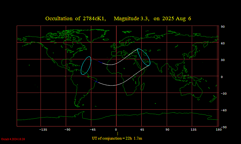 Occultation predictions of 2784cK1 Magnitude 3.3 Date 2025 Aug 6 Moon: % illumination = 93+, Solar elongation = 150 Disappearance U.T. Sun Moon CA PA WA a b Location h m s Alt Alt Az o o o m/o m/o 1 AE Abu Dhabi 23 4 45 6 236 60S 105 111 +1.0 -1.4 2 AE Al Ain 23 5 51 4 237 58S 107 113 +1.1 -1.5 3 AE Al Hamra 23 2 47 8 235 64S 101 107 +1.1 -1.2 4 AE Arzana 23 1 59 7 235 66S 99 104 +1.0 -1.2 5 AE Das Island 23 1 52 7 235 67S 98 104 +1.0 -1.2 6 AE Dubai 23 4 10 4 237 62S 103 109 +1.0 -1.4 7 AE Fujeirah 23 5 18 4 237 59S 105 111 +1.0 -1.5 8 AE Jebel Dhana 23 2 48 7 235 64S 101 107 +1.0 -1.2 9 AE Ras Al Khaimah 23 4 14 4 237 62S 103 109 +0.9 -1.4 10 AE Sharjah 23 4 13 4 237 62S 103 109 +0.9 -1.4 11 AE Zirku 23 2 25 7 235 65S 99 105 +1.0 -1.2 12 AM Yerevan 22 50 35 5 227 56N 40 46 +0.1 +0.1 13 AO Cabinda 21 49 28 67 198 54S 111 117 +4.0 -1.4 14 AO Luanda 22 1 21 68 210 35S 130 136 +5.1 -3.7 15 AO M'Banza-Congo 21 59 6 65 208 47S 118 124 +4.4 -2.0 16 AO Negage 22 7 59 65 215 36S 129 135 +5.2 -3.6 17 AO Porto Amboim 22 16 42 67 220 14S 151 157 +9.9 +9.9 18 AO Soyo 21 50 56 67 200 51S 114 120 +4.1 -1.6 19 AO Toto 22 0 59 66 210 42S 123 129 +4.6 -2.6 20 AO Uige 22 6 11 65 214 37S 128 133 +5.0 -3.3 21 AZ Baku 22 51 21 1 231 64N 49 55 +0.2 -0.2 22 BF Bobo-Dioulasso 21 7 16 47 155 60N 44 50 +3.1 +2.5 23 BF Ouagadougou 21 18 43 48 162 56N 41 47 +2.9 +2.6 24 BH Bahrain 22 58 53 9 234 74S 91 97 +0.9 -0.9 25 BJ Cotonou 21 18 46 55 165 77N 62 68 +3.1 +1.4 26 BJ Parakou 21 24 22 52 169 68N 53 58 +3.0 +1.8 31 BY Simferopol 23 0 14 6 221 11N 355 1 -2.7 +4.3 32 CF Bambari 22 13 18 50 212 77S 88 93 +2.9 +0.0 33 CF Bangassou 22 19 53 49 217 69S 96 101 +3.0 -0.4 34 CF Bangui 22 6 51 53 208 77S 88 94 +3.1 +0.0 35 CF Berberati 21 58 25 55 202 81S 83 89 +3.1 +0.3 36 CF Birao 22 19 26 44 213 86S 79 85 +2.5 +0.2 37 CF Bouar 21 58 39 54 201 87S 78 84 +3.0 +0.5 38 CF Bria 22 17 5 48 214 76S 88 94 +2.8 -0.1 39 CF N'Dele 22 13 38 48 211 85S 80 86 +2.7 +0.3 40 CG Brazzaville 22 0 2 63 208 53S 112 118 +4.1 -1.4 41 CG Impfondo 22 5 45 56 209 69S 96 102 +3.4 -0.3 42 CG Loudima 21 49 51 65 198 59S 106 112 +3.9 -1.0 43 CG Makabana 21 49 3 65 197 61S 103 109 +3.8 -0.8 44 CG Makoua 21 57 52 59 204 68S 96 102 +3.5 -0.4 45 CG Ouesso 21 59 3 58 204 73S 92 98 +3.3 -0.1 46 CG Owando 21 59 27 60 206 66S 99 105 +3.6 -0.5 47 CG Pointe-Noire 21 47 23 66 196 58S 107 113 +3.9 -1.1 48 CI Abidjan 20 57 23 51 149 79N 64 70 +3.1 +1.4 49 CI Bouake 20 57 41 49 150 71N 56 62 +3.1 +1.8 50 CI Daloa 20 51 50 48 146 75N 59 65 +3.1 +1.6 51 CI Korhogo 20 59 33 47 150 66N 50 56 +3.1 +2.1 52 CI Man 20 49 14 47 145 74N 58 64 +3.0 +1.7 53 CI San Pedro 20 48 18 49 144 82N 66 72 +3.0 +1.3 54 CI Yamoussoukro 20 55 24 49 148 74N 59 65 +3.1 +1.7 55 CM Bafoussam 21 42 30 57 187 87N 71 77 +3.1 +0.9 56 CM Bamenda 21 42 15 56 187 85N 70 75 +3.0 +0.9 57 CM Batouri 21 54 7 56 198 84S 80 86 +3.1 +0.4 58 CM Douala 21 39 16 58 185 89S 75 81 +3.2 +0.7 59 CM Foumban 21 43 48 56 188 87N 72 77 +3.1 +0.8 60 CM Garoua 21 54 49 52 195 80N 65 71 +2.7 +1.0 61 CM Maroua 21 58 18 50 197 79N 63 69 +2.6 +1.0 62 CM N'Gaoundere 21 53 33 54 196 86N 71 76 +2.9 +0.8 63 CM Tiko 21 38 11 58 184 90N 74 80 +3.2 +0.8 64 CM Yaounde 21 44 53 58 191 87S 78 84 +3.2 +0.6 65 CV Amilcar Cabral 20 27 9 -7 26 133 56N 41 47 +2.7 +2.9 66 CV Boa Vista 20 25 36 -7 26 133 59N 43 49 +2.6 +2.7 71 CY Akrotiri 22 45 42 16 219 49N 33 39 +0.3 +0.7 72 CY Larnaca 22 46 6 15 219 50N 34 40 +0.3 +0.7 73 CY Paphos 22 45 39 16 219 48N 32 38 +0.3 +0.8 74 DZ Djanet 22 16 37 37 194 27N 11 17 +0.5 +3.6 75 DZ Illizi 22 28 6 34 195 10N 354 360 -2.6 +8.1 76 DZ Tamanrasset 22 8 41 39 187 23N 7 13 +0.5 +4.7 77 EG Abu Simbel 22 39 7 27 220 79N 64 69 +1.3 +0.2 78 EG Alexandria 22 41 48 21 217 53N 37 43 +0.6 +0.8 79 EG Aswan 22 40 58 25 220 77N 62 68 +1.2 +0.2 80 EG Asyut 22 40 7 24 218 66N 50 56 +0.9 +0.5 81 EG Cairo 22 42 1 21 218 58N 43 49 +0.7 +0.6 82 EG El Arish 22 44 7 18 220 61N 45 51 +0.6 +0.4 83 EG El-Gora 22 44 20 18 220 61N 45 51 +0.6 +0.4 84 EG El-Tor 22 42 56 21 220 68N 52 58 +0.9 +0.3 85 EG Embaba 22 41 50 21 218 58N 42 48 +0.7 +0.6 86 EG Hurghada 22 42 45 21 221 71N 55 61 +0.9 +0.3 87 EG Luxor 22 41 11 23 220 73N 57 63 +1.1 +0.3 88 EG Mersa-Matruh 22 40 28 22 214 46N 31 37 +0.5 +1.1 89 EG Port Said 22 43 14 19 219 57N 41 47 +0.6 +0.6 90 EG St. Catherine 22 43 31 20 221 67N 52 57 +0.8 +0.3 91 ET Addis Ababa 23 3 0 27 233 37S 127 133 +3.5 -3.0 92 ET Bahar Dar 22 53 37 28 230 55S 109 115 +2.4 -1.4 93 ET Debre Zeit 23 4 31 27 233 35S 130 136 +3.7 -3.4 94 ET Dire Dawa 23 12 35 22 235 26S 139 145 +5.0 -5.7 95 ET Gambella 22 51 30 33 229 49S 116 121 +3.0 -1.8 96 ET Gondar 22 52 43 28 229 59S 106 112 +2.3 -1.2 97 ET Jimma 22 59 51 30 232 38S 127 133 +3.6 -2.9 98 ET Lalibella 22 57 2 26 231 52S 113 119 +2.4 -1.6 99 ET Makale 22 56 12 25 230 56S 108 114 +2.2 -1.4 100 GA Bitam 21 43 58 60 191 81S 83 89 +3.3 +0.3 101 GA Franceville 21 50 55 62 199 66S 98 104 +3.6 -0.5 102 GA Lambarene 21 39 17 63 187 74S 90 96 +3.5 +0.0 103 GA Lastourville 21 48 8 62 196 70S 94 100 +3.5 -0.2 104 GA Libreville 21 36 31 62 184 79S 86 91 +3.4 +0.2 105 GA Makokou 21 48 27 61 196 75S 90 96 +3.4 +0.0 106 GA Mitzic 21 43 52 61 191 77S 87 93 +3.4 +0.1 107 GA Moanda 21 50 14 62 198 67S 98 103 +3.6 -0.4 108 GA Okondja 21 51 19 61 199 69S 95 101 +3.5 -0.3 109 GA Omboue Hospial 21 35 52 64 184 73S 92 98 +3.5 -0.1 110 GA Oyem 21 44 6 60 191 80S 85 91 +3.3 +0.3 111 GA Port Gentil 21 33 58 63 182 76S 89 94 +3.5 +0.1 112 GA Tchibanga 21 42 17 65 190 66S 99 104 +3.7 -0.5 113 GE Sukhumi 22 51 24 5 225 41N 26 32 -0.2 +0.6 114 GE Tbilisi 22 50 49 4 228 52N 37 42 +0.0 +0.2 115 GH Accra 21 9 40 54 158 78N 63 69 +3.2 +1.4 116 GH Sunyani 21 5 33 51 155 73N 57 63 +3.1 +1.7 117 GH Takoradi 21 3 39 53 154 80N 65 71 +3.2 +1.3 118 GH Tamale 21 14 20 51 161 66N 50 56 +3.0 +2.1 119 GH Wa 21 10 23 49 158 64N 48 54 +3.1 +2.2 120 GM Banjul 20 35 28 34 137 60N 45 50 +2.9 +2.6 121 GN Faranah 20 45 1 42 142 66N 51 57 +3.0 +2.2 122 GN Fira 20 37 26 39 139 68N 52 58 +2.9 +2.1 123 GN