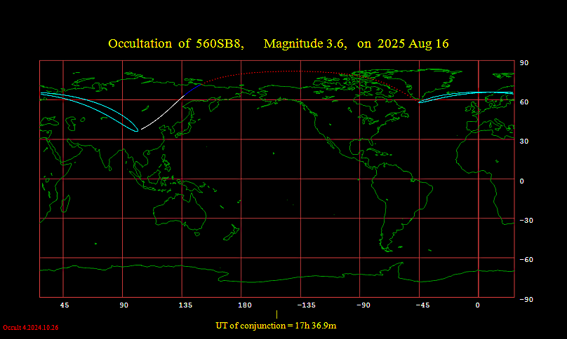 Occultation predictions of 560SB8 Magnitude 3.6 Date 2025 Aug 16 Moon: % illumination = 44-, Solar elongation = 84 Disappearance U.T. Sun Moon CA PA WA a b Location h m s Alt Alt Az o o o m/o m/o 1 CN Hailar 16 13 46 19 74 -21S 147 159 +1.9 -0.8 4 MN Ulan Bator 16 6 0 9 64 -44S 124 136 +0.0 +0.8 7 RU Bratsk 16 15 23 11 63 -58S 110 122 -0.2 +1.2 8 RU Chita 16 10 41 15 70 -42S 126 138 +0.3 +0.9 9 RU Irkutsk 16 10 12 10 63 -52S 116 128 -0.1 +1.1 14 RU Polyarny 16 29 28 -10 21 77 -55S 113 125 +0.1 +1.6 17 RU Ulan-Ude 16 9 39 11 65 -49S 119 131 +0.0 +1.0 18 RU Yakutsk 16 30 52 28 91 -31S 137 149 +1.0 +0.9 Reappearance U.T. Sun Moon CA PA WA a b Location h m s Alt Alt Az o o o m/o m/o 1 CN Hailar 16 24 50 20 76 3S 171 183 -2.2 +4.1 2 CN Urumqi 16 43 15 1 56 43S 211 223 -0.8 +1.6 3 KZ Semiplatinsk 16 57 42 2 54 55S 224 235 -0.6 +1.4 4 MN Ulan Bator 16 35 56 13 69 29S 197 209 -0.8 +2.1 5 RU Abakan 16 56 3 10 62 51S 219 231 -0.5 +1.6 6 RU Barnaul 16 59 52 6 57 56S 224 236 -0.6 +1.4 7 RU Bratsk 16 55 12 16 71 45S 213 225 -0.5 +1.8 8 RU Chita 16 40 7 19 75 26S 194 206 -0.7 +2.3 9 RU Irkutsk 16 46 17 15 70 38S 206 218 -0.6 +1.9 10 RU Kemorovo 17 1 12 9 60 56S 224 236 -0.5 +1.5 11 RU Kurgan 17 13 33 1 46 65S 233 245 -0.6 +1.1 12 RU Nizhnevartovsk 17 14 5 9 55 63S 231 243 -0.5 +1.3 13 RU Omsk 17 8 5 3 51 62S 230 242 -0.6 +1.2 14 RU Polyarny 17 10 1 -10 25 86 42S 211 222 -0.3 +1.9 15 RU Salekhard 17 25 43 -6 10 50 66S 234 246 -0.4 +1.2 16 RU Surgut 17 15 55 8 53 64S 232 244 -0.5 +1.3 17 RU Ulan-Ude 16 43 34 16 72 34S 202 214 -0.6 +2.0 18 RU Yakutsk 16 53 18 31 96 15S 184 195 -0.8 +2.8 Sites Location E. Long Latitude 1 CN Hailar 119 49.5 49 12.3 2 CN Urumqi 87 28.5 43 54.4 3 KZ Semiplatinsk 80 14.1 50 21.1 4 MN Ulan Bator 106 46.0 47 50.6 5 RU Abakan 91 23.1 53 44.4 6 RU Barnaul 83 32.5 53 21.8 7 RU Bratsk 101 41.9 56 22.2 8 RU Chita 113 18.3 52 1.6 9 RU Irkutsk 104 23.7 52 16.0 10 RU Kemorovo 86 6.4 55 16.2 11 RU Kurgan 65 24.9 55 28.5 12 RU Nizhnevartovsk 76 28.0 60 57.0 13 RU Omsk 73 18.6 54 58.0 14 RU Polyarny 112 3.0 66 25.0 15 RU Salekhard 66 36.6 66 35.4 16 RU Surgut 73 30.0 61 15.0 17 RU Ulan-Ude 107 26.3 51 48.4 18 RU Yakutsk 129 46.2 62 5.6