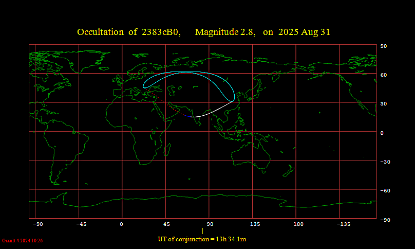 Occultation predictions of 2383cB0 Magnitude 2.8 Date 2025 Aug 31 Moon: % illumination = 53+, Solar elongation = 93 Disappearance U.T. Sun Moon CA PA WA a b Location h m s Alt Alt Az o o o m/o m/o 5 BD Chittagong 14 22 45 28 218 37S 151 143 +3.4 -4.1 6 BD Cox'S Bazar 14 26 45 28 219 32S 155 147 +3.7 -4.8 7 BD Dhaka 14 12 40 28 214 45S 143 135 +3.1 -3.0 8 BD Dhaka 14 12 48 28 214 45S 143 135 +3.1 -3.1 9 BD Ishurdi 14 7 38 29 212 48S 140 132 +3.0 -2.8 10 BD Jessore 14 10 52 30 213 44S 144 136 +3.1 -3.1 11 BD Rajshahi 14 5 31 30 211 49S 139 131 +3.0 -2.7 12 BD Saidpur 14 3 5 29 211 53S 135 127 +2.9 -2.4 13 BD Sylhet Osmani 14 13 43 27 215 47S 140 132 +2.9 -2.9 14 BT Paro 14 0 53 27 210 57S 131 123 +2.7 -2.1 15 CN Chengdu 14 29 49 13 226 48S 140 132 +2.4 -2.9 16 CN Chongqing 14 39 27 10 229 39S 149 141 +2.7 -3.8 17 CN Hohhot 14 19 46 3 228 64S 124 116 +1.5 -2.1 20 CN Kunming 14 51 9 14 229 21S 167 159 +6.0 -9.8 21 CN Lanzhou 14 15 7 11 222 65S 123 115 +1.9 -2.0 22 CN Shijiazhuang 14 30 4 1 232 53S 135 127 +1.6 -2.6 23 CN Taiyuan 14 28 3 3 230 55S 133 125 +1.7 -2.5 24 CN Urumqi 13 33 55 -9 15 200 86S 102 94 +1.9 -0.9 25 CN Xi'An 14 29 30 8 228 52S 136 128 +2.0 -2.7 26 CN Xichang 14 33 35 15 225 42S 146 138 +2.8 -3.5 27 CN Yichang 14 50 5 5 233 27S 161 153 +3.6 -6.0 28 CN Zhengzhou 14 39 36 3 233 42S 146 138 +2.1 -3.4 29 IN Agartala 14 15 6 28 215 44S 143 135 +3.1 -3.1 32 IN Aizwal 14 20 26 26 218 42S 146 138 +3.1 -3.5 33 IN Akola 13 41 20 -8 40 195 40S 148 140 +2.9 -3.0 34 IN Allahabad 13 43 16 -12 34 199 55S 133 125 +2.8 -2.0 35 IN Along 14 13 29 23 217 54S 134 126 +2.6 -2.4 37 IN Aurangabad 13 39 13 -7 41 193 36S 152 144 +2.7 -3.3 38 IN Baghdogra 13 59 23 29 209 56S 132 124 +2.8 -2.2 39 IN Bakshi Ka Talab 13 38 5 -10 33 197 58S 130 122 +2.8 -1.8 40 IN Balurghat 14 3 59 29 211 51S 137 128 +2.9 -2.5 41 IN Bareilly 13 31 46 -7 32 194 61S 127 119 +2.7 -1.5 43 IN Belgaum 13 56 19 -11 44 198 15S 172 164 +2.7 -8.2 47 IN Bhopal 13 35 19 -7 37 193 48S 140 132 +2.8 -2.3 48 IN Bhubaneswar 14 10 12 34 211 36S 152 144 +3.4 -4.0 50 IN Bidar 13 52 45 41 199 29S 159 151 +3.0 -4.6 52 IN Bilaspur 13 52 36 36 203 45S 143 135 +3.0 -2.8 53 IN Bokaro 14 0 16 32 208 48S 140 132 +3.0 -2.7 56 IN Calcutta 14 10 17 31 213 43S 145 137 +3.2 -3.2 58 IN Cooch-Behar 14 3 21 28 211 54S 134 126 +2.8 -2.3 64 IN Deparizo 14 12 25 23 216 54S 134 126 +2.6 -2.4 65 IN Dhanbad 14 0 36 32 208 49S 139 131 +3.0 -2.6 66 IN Dundigul 13 56 45 41 201 28S 160 152 +3.1 -5.0 67 IN Gauhati 14 9 51 26 214 51S 137 128 +2.8 -2.6 68 IN Gaya 13 54 1 32 205 52S 136 128 +2.9 -2.3 69 IN Goa 13 59 27 -11 44 198 10S 178 170 +9.9 +9.9 70 IN Gorakhpur 13 45 40 32 201 58S 130 122 +2.8 -1.9 72 IN Gwalior 13 31 53 -6 34 193 56S 132 124 +2.7 -1.8 73 IN Hirakud 13 59 41 35 207 43S 145 137 +3.1 -3.1 75 IN Hyderabad 13 57 52 41 202 27S 161 153 +3.2 -5.2 76 IN Imphal 14 20 23 25 218 44S 144 136 +3.0 -3.2 78 IN Jabalpur 13 43 17 -11 36 198 48S 139 131 +2.9 -2.4 83 IN Jamshedpur 14 2 43 33 209 46S 142 134 +3.1 -2.9 84 IN Jeypore 14 4 48 37 207 32S 156 148 +3.4 -4.4 85 IN Jhansi 13 34 14 -7 35 194 54S 134 126 +2.8 -1.9 86 IN Jharsuguda 13 58 46 35 206 44S 144 136 +3.1 -3.0 88 IN Jorhat 14 15 24 24 217 50S 137 129 +2.8 -2.7 89 IN Kailashahar 14 16 7 27 216 45S 143 135 +3.0 -3.1 90 IN Kamalpur 14 16 5 27 216 45S 143 135 +3.0 -3.1 92 IN Kanpur 13 37 46 -9 33 196 57S 131 123 +2.8 -1.8 94 IN Khajuraho 13 39 20 -10 35 197 53S 135 127 +2.8 -2.1 95 IN Kolhapur 13 50 15 -9 44 195 21S 167 159 +2.6 -6.0 99 IN Lilabari 14 13 47 24 216 52S 136 128 +2.7 -2.5 100 IN Lucknow 13 38 28 -10 33 197 58S 130 122 +2.8 -1.8 102 IN Mazuffarpur 13 52 5 31 205 56S 132 124 +2.8 -2.1 103 IN Mohanbari 14 15 47 23 218 52S 136 128 +2.7 -2.6 104 IN Nagarjunsagar 14 6 36 41 205 21S 167 159 +3.5 -7.1 105 IN Nagpur 13 45 59 -11 38 198 42S 146 138 +3.0 -3.0 106 IN Nainital 13 30 55 -6 32 193 63S 125 117 +2.7 -1.4 108 IN Nawapara 13 57 18 36 205 41S 147 139 +3.1 -3.3 109 IN Panagarh 14 4 38 31 210 47S 141 133 +3.0 -2.8 110 IN Pasighat 14 15 8 22 217 53S 135 127 +2.6 -2.5 113 IN Patina 13 52 33 32 205 54S 134 125 +2.9 -2.2 116 IN Purnea 13 58 49 30 208 54S 134 126 +2.9 -2.3 117 IN Raibarelli 13 40 42 -11 33 198 57S 131 123 +2.8 -1.9 118 IN Raipur 13 53 50 37 203 42S 146 138 +3.1 -3.1 119 IN Rajahmundry 14 11 36 38 209 23S 165 157 +3.8 -6.8 121 IN Ranchi 13 58 39 33 207 48S 140 132 +3.0 -2.7 122 IN Rourkela 14 0 8 34 207 45S 143 135 +3.1 -3.0 125 IN Sholapur 13 49 25 -10 42 197 27S 161 153 +2.8 -4.8 126 IN Silchar 14 17 13 26 217 46S 142 134 +3.0 -3.0 130 IN Utkela 14 2 3 36 207 37S 151 142 +3.3 -3.7 131 IN Varanasi 13 46 27 33 201 55S 133 125 +2.9 -2.1 132 IN Vijayawada 14 12 3 39 208 19S 169 161 +3.9 -8.0 133 IN Warangal 13 59 21 40 203 29S 159 151 +3.2 -4.8 134 IN Zero 14 12 17 24 216 54S 134 126 +2.7 -2.5 141 MM Bagan 14 41 13 24 224 21S 167 159 +5.6 -9.2 142 MM Banmaw 14 32 47 21 223 35S 152 144 +3.4 -4.3 143 MM Kalay 14 26 35 25 220 37S 151 143 +3.4 -4.1 144 MM Lanywa 14 43 6 24 224 19S 169 161 +9.9 +9.9 145 MM Lashio 14 41 18 21 225 26S 162 154 +4.5 -6.8 146 MM Mandalay 14 42 26 22 224 21S 166 158 +5.6 -8.9 147 MM Momeik 14 36 8 22 223 30S 158 150 +3.9 -5.4 148 MM Myitkyina 14 28 50 21 222 41S 147 139 +3.1 -3.6 149 MM Nampong 14 28 45 21 222 41S 147 139 +3.1 -3.6 150 MM Putao 14 22 39 20 221 48S 140 132 +2.7 -2.9 151 MM Sittwe 14 39 31 26 222 19S 168 161 +9.9 +9.9 152 MN Ulan Bator 14 0 7 3 221 81S 107 99 +1.3 -1.6 153 NP Bhairawa 13 44 8 31 201 60S 128 120 +2.8 -1.8 154 NP Biratnagar 13 56 50 30 207 56S 132 124 +2.8 -2.2 155 NP Chandragarhi 13 58 56 29 209 56S 132 124 +2.8 -2.2 156 NP Janakpur 13 52 39 30 205 57S 131 123 +2.8 -2.0 157 NP Kathmandu 13 49 5 30 204 60S 128 120 +2.8 -1.9 158 NP Nepalgunj 13 38 17 -10 32 197 61S 127 119 +2.7 -1.6 159 NP Pokhara 13 44 26 30 201 61S 127 119 +2.7 -1.7 160 NP Simara 13 49 8 31 203 58S 130 121 +2.8 -1.9 204 RU Abakan 13 31 39 -7 5 202 87N 95 87 +1.4 -0.9 205 RU Aldan 14 4 32 17 215 68S 120 112 +2.1 -1.8 206 RU Irkutsk 13 50 27 1 217 87S 101 93 +1.2 -1.4 2