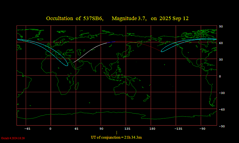 Occultation predictions of 537SB6 Magnitude 3.7 Date 2025 Sep 12 Moon: % illumination = 68-, Solar elongation = 111 Disappearance U.T. Sun Moon CA PA WA a b Location h m s Alt Alt Az o o o m/o m/o 2 AM Yerevan 19 48 10 20 75 -68S 98 110 +0.3 +1.1 7 AT Langenlebarn 20 4 19 7 61 -75N 60 73 -0.5 +1.4 10 AT Vienna 20 3 48 7 62 -75N 61 73 -0.5 +1.4 12 AT Wiener Neustadt Ost 20 3 35 7 61 -75N 61 73 -0.5 +1.4 14 AZ Baku 19 50 52 25 79 -60S 106 118 +0.6 +0.9 36 BG Bourgas 19 51 59 10 66 -90S 76 88 -0.3 +1.3 37 BG Gorna Orechovica 19 53 20 9 65 -88N 73 86 -0.3 +1.3 38 BG Plovdiv 19 52 13 8 64 -89N 74 87 -0.4 +1.3 39 BG Sofia 19 53 34 7 64 -87N 72 85 -0.4 +1.3 40 BG Stara Zagora 19 52 20 9 65 -89N 74 87 -0.3 +1.3 41 BG Varna 19 52 46 10 67 -90N 75 88 -0.3 +1.3 42 BY Homel 20 5 29 18 73 -82N 68 80 -0.2 +1.6 43 BY Minsk 20 8 20 16 71 -79N 64 77 -0.3 +1.6 44 BY Simferopol 19 53 53 15 71 -87S 79 91 -0.1 +1.4 45 BY Vitebsk 20 9 52 19 74 -80N 65 78 -0.2 +1.6 67 CY Akrotiri 19 41 52 9 67 -72S 94 106 -0.1 +0.9 68 CY Larnaca 19 42 4 9 67 -71S 94 106 -0.1 +0.9 69 CY Paphos 19 42 3 8 66 -72S 93 105 -0.1 +0.9 70 CZ Caslav 20 6 56 8 62 -73N 59 71 -0.5 +1.4 71 CZ Ceske Budejovice 20 6 0 7 61 -73N 59 71 -0.5 +1.4 72 CZ Chotebor 20 6 26 8 62 -73N 59 71 -0.5 +1.4 73 CZ Hradec Kralove 20 7 9 8 62 -73N 59 71 -0.5 +1.4 74 CZ Karlovy Vary 20 8 31 7 60 -71N 57 69 -0.5 +1.4 75 CZ Kunovice 20 4 41 8 62 -75N 61 73 -0.5 +1.4 76 CZ Line 20 7 36 7 60 -72N 57 70 -0.5 +1.4 77 CZ Mnichovo Hradiste 20 7 58 8 62 -72N 58 70 -0.5 +1.4 78 CZ Namest 20 5 30 8 62 -74N 60 72 -0.5 +1.4 79 CZ Ostrava 20 5 20 9 63 -75N 61 73 -0.4 +1.4 80 CZ Pardubice 20 6 52 8 62 -73N 59 71 -0.5 +1.4 81 CZ Prague 20 7 42 7 61 -72N 58 70 -0.5 +1.4 82 CZ Praha 20 7 35 8 61 -72N 58 70 -0.5 +1.4 83 CZ Prerov 20 5 16 9 63 -75N 60 73 -0.5 +1.4 84 CZ Pribram 20 7 15 7 61 -72N 58 70 -0.5 +1.4 85 CZ Sobeslav 20 6 17 7 61 -73N 59 71 -0.5 +1.4 86 CZ Turany 20 5 12 8 62 -75N 60 73 -0.5 +1.4 87 CZ Vodochody 20 7 48 8 61 -72N 58 70 -0.5 +1.4 91 DE Altenburg 20 9 49 7 60 -70N 56 68 -0.5 +1.4 92 DE Anklam 20 13 20 10 62 -69N 54 67 -0.5 +1.5 97 DE Barth 20 14 31 10 62 -68N 54 66 -0.5 +1.4 99 DE Bautzen 20 9 8 8 61 -71N 57 69 -0.5 +1.4 101 DE Berlin 20 11 18 9 61 -70N 55 68 -0.5 +1.4 103 DE Borkum 20 16 30 6 57 -65N 51 63 -0.5 +1.4 104 DE Braunschweig 20 12 42 7 59 -68N 54 66 -0.5 +1.4 105 DE Bremen 20 14 38 7 58 -66N 52 64 -0.5 +1.4 106 DE Bremerhaven 20 15 23 7 58 -66N 52 64 -0.5 +1.4 107 DE Brueckeburg 20 13 25 6 58 -67N 53 65 -0.5 +1.4 111 DE Celle 20 13 21 7 59 -67N 53 65 -0.5 +1.4 113 DE Cochstedt 20 11 36 7 60 -69N 54 67 -0.5 +1.4 116 DE Cottbus 20 10 7 9 62 -71N 56 69 -0.5 +1.4 118 DE Dessau 20 11 11 8 60 -69N 55 67 -0.5 +1.4 119 DE Diepholz 20 14 14 6 58 -67N 52 65 -0.5 +1.4 122 DE Dresden 20 9 24 8 61 -71N 56 69 -0.5 +1.4 125 DE Eggebeck 20 16 35 8 59 -66N 51 64 -0.5 +1.4 128 DE Eisenhuettenstadt 20 10 33 9 62 -71N 56 69 -0.5 +1.4 129 DE Emden 20 15 57 6 58 -65N 51 63 -0.5 +1.4 131 DE Erfurt 20 10 37 6 59 -69N 55 67 -0.5 +1.4 133 DE Fassberg 20 13 44 7 59 -67N 53 65 -0.5 +1.4 134 DE Flensburg 20 16 46 8 59 -66N 51 64 -0.5 +1.4 145 DE Halle 20 10 52 7 60 -69N 55 67 -0.5 +1.4 146 DE Hamburg 20 14 50 8 59 -67N 52 65 -0.5 +1.4 147 DE Hamburg 20 14 46 8 59 -67N 52 65 -0.5 +1.4 149 DE Hannover 20 13 21 7 59 -67N 53 65 -0.5 +1.4 152 DE Heringsdorf 20 13 11 10 62 -69N 55 67 -0.5 +1.5 153 DE Hildesheim 20 12 49 7 59 -68N 53 66 -0.5 +1.4 154 DE Hof 20 9 11 6 59 -70N 56 68 -0.5 +1.4 156 DE Hohn 20 16 1 8 59 -66N 52 64 -0.5 +1.4 157 DE Holzdorf 20 10 36 8 61 -70N 56 68 -0.5 +1.4 160 DE Itzehoe 20 15 33 8 59 -66N 52 64 -0.5 +1.4 161 DE Jena 20 10 8 7 60 -70N 55 68 -0.5 +1.4 162 DE Jever 20 15 47 7 58 -66N 51 64 -0.5 +1.4 163 DE Kamenz 20 9 27 8 61 -71N 57 69 -0.5 +1.4 167 DE Kiel 20 15 49 8 60 -66N 52 64 -0.5 +1.4 170 DE Koethen 20 11 8 7 60 -69N 55 67 -0.5 +1.4 171 DE Kyritz 20 12 36 8 61 -69N 54 67 -0.5 +1.4 172 DE Laage 20 14 7 9 61 -68N 54 66 -0.5 +1.4 177 DE Leer 20 15 40 6 58 -66N 51 64 -0.5 +1.4 178 DE Leipzig 20 10 35 7 60 -70N 55 68 -0.5 +1.4 179 DE Lemwerder 20 14 51 7 58 -66N 52 64 -0.5 +1.4 181 DE Luebeck 20 14 43 8 60 -67N 53 65 -0.5 +1.4 182 DE Magdeburg 20 11 48 7 60 -69N 54 67 -0.5 +1.4 190 DE Muehlhausen 20 10 39 7 60 -70N 55 68 -0.5 +1.4 193 DE Neubrandenburg 20 10 14 7 60 -70N 56 68 -0.5 +1.4 197 DE Norderney 20 16 23 7 58 -65N 51 63 -0.5 +1.4 198 DE Nordholz 20 15 43 7 59 -66N 52 64 -0.5 +1.4 202 DE Parchim 20 13 39 8 61 -68N 54 66 -0.5 +1.4 203 DE Preschen 20 9 45 9 62 -71N 57 69 -0.5 +1.4 205 DE Rechlin-Laerz 20 13 0 9 61 -69N 54 67 -0.5 +1.4 206 DE Rendsburg 20 15 51 8 59 -66N 52 64 -0.5 +1.4 208 DE Riesa 20 9 50 8 61 -71N 56 68 -0.5 +1.4 211 DE Rothenburg/ol 20 9 10 9 62 -71N 57 69 -0.5 +1.4 213 DE Schleswig 20 16 15 8 59 -66N 52 64 -0.5 +1.4 214 DE Schoenhagen 20 11 14 8 61 -70N 55 68 -0.5 +1.4 217 DE Soest 20 10 6 8 61 -71N 56 68 -0.5 +1.4 221 DE Stendal 20 12 29 8 60 -69N 54 67 -0.5 +1.4 223 DE Strausberg 20 11 24 9 62 -70N 55 68 -0.5 +1.4 225 DE Suhl 20 9 46 8 61 -71N 56 69 -0.5 +1.4 229 DE Westerland 20 17 29 8 59 -65N 51 63 -0.5 +1.4 231 DE Wilhelmshaven 20 15 40 7 58 -66N 51 64 -0.5 +1.4 232 DE Wittmundhafen 20 15 56 7 58 -65N 51 63 -0.5 +1.4 234 DE Wunstorf 20 13 29 7 59 -67N 53 65 -0.5 +1.4 236 DK Aalborg 20 19 51 10 61 -65N 50 63 -0.5 +1.4 237 DK Aarhus 20 18 21 10 61 -66N 51 64 -0.5 +1.4 238 DK Billund 20 18 15 9 60 -65N 51 63 -0.5 +1.4 239 DK Copenhagen 20 16 36 10 62 -67N 52 65 -0.5 +1.5 240 DK Esbjerg 20 18 14 8 59 -65N 50 63 -0.5 +1.4 241 DK Gronholt 20 17 0 10 62 -67N 52 65 -0.5 +1.5 242 DK Karup 20 19 3 9 60 -65N 50 63 -0.5 +1.4 243 DK Kolding 20 17 44 9 60 -65N 51 63 -0.5 +1.4 244 DK Krusa-Padborg 20 16 57 8 59 -66N 51 64 -0.5 +1.4 245 DK Laeso 20 19 36 11 62 -65N 51 63 -0.5 +1.5 246 DK Lindtorp 20 19 32 9 60 -64N 50 62 -0.5 +1.4 247 DK Maribo 20 15 39 9 61 -67N 53 65 -0.5 +1.4 248 DK Odense 20 17 18 9 60 -66N 51 64 -0.5 +1.4 249 DK Ronne 20 14 39 11 63 -69N 54 67 -0.4 +1.5 250 DK Sindal 20 20 16 11 61 -65N 50 63 -0.5 +1.5 251 DK Skiv