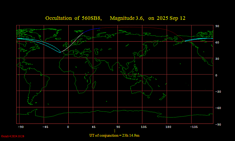 Occultation predictions of 560SB8 Magnitude 3.6 Date 2025 Sep 12 Moon: % illumination = 67-, Solar elongation = 110 Disappearance U.T. Sun Moon CA PA WA a b Location h m s Alt Alt Az o o o m/o m/o 1 FO Vagar 22 3 50 16 68 -44S 122 134 +0.0 +1.4 2 FR Brest 21 51 39 10 65 -22S 144 156 +0.8 -0.1 3 FR Cherbourg 21 54 8 13 68 -17S 149 161 +1.4 -0.7 4 FR Dinard 21 54 20 12 67 -14S 152 164 +2.1 -1.7 5 FR Granville 21 55 24 13 68 -13S 153 165 +2.5 -2.0 6 FR Guiscriff-Scaer 21 52 17 11 66 -18S 148 160 +1.2 -0.7 7 FR Landivisiau 21 51 51 10 65 -21S 145 157 +0.8 -0.1 8 FR Lannion 21 52 21 11 66 -20S 146 158 +0.9 -0.3 9 FR Lanvedoc 21 51 40 10 65 -21S 145 157 +0.8 -0.2 10 FR Lorient 21 53 17 11 66 -15S 151 163 +1.7 -1.3 11 FR Morlaix 21 52 7 11 66 -21S 145 157 +0.9 -0.2 12 FR Ouessant 21 51 5 10 65 -23S 143 155 +0.6 +0.1 13 FR Pontivy 21 53 38 11 66 -15S 151 163 +1.8 -1.4 14 FR Quimper 21 51 51 10 65 -19S 147 159 +1.0 -0.5 15 FR St.-Brieuc Armor 21 52 59 11 67 -17S 149 161 +1.3 -0.8 16 GB Aberdeen 21 58 30 16 70 -35S 131 143 +0.3 +1.1 17 GB Barkston Heath 21 55 21 15 70 -25S 141 153 +0.7 +0.5 18 GB Barrow Island 21 55 8 14 68 -32S 134 146 +0.3 +0.9 19 GB Benbecula 21 57 58 13 66 -41S 125 137 +0.1 +1.2 20 GB Benson 21 54 24 14 69 -23S 143 155 +0.8 +0.2 21 GB Biggin Hill 21 55 29 15 70 -19S 147 159 +1.2 -0.2 22 GB Birmingham 21 54 21 14 68 -27S 139 151 +0.6 +0.5 23 GB Blackbushe 21 54 42 14 69 -22S 144 156 +0.9 +0.1 24 GB Blackpool 21 54 54 14 68 -31S 135 147 +0.3 +0.8 25 GB Boscombe Down 21 53 48 13 68 -23S 143 155 +0.8 +0.2 26 GB Bournemouth 21 53 41 13 68 -23S 144 155 +0.8 +0.1 27 GB Bracknell 21 54 47 14 69 -22S 144 156 +0.9 +0.1 28 GB Bristol 21 53 17 13 67 -26S 140 152 +0.6 +0.4 29 GB Brize Norton 21 54 7 14 68 -25S 141 153 +0.7 +0.4 30 GB Brough 21 55 49 15 70 -27S 139 151 +0.6 +0.6 31 GB Cambridge 21 55 50 15 70 -21S 145 157 +1.0 +0.1 32 GB Carlisle 21 55 59 14 68 -33S 133 145 +0.3 +0.9 33 GB Chalsgrove 21 54 26 14 69 -23S 143 155 +0.8 +0.3 34 GB Chivenor 21 52 34 12 66 -28S 138 150 +0.4 +0.5 35 GB Church Fenton 21 55 41 15 69 -28S 138 150 +0.5 +0.7 36 GB Coltishall 21 56 59 16 71 -20S 146 158 +1.2 +0.0 37 GB Coningsby 21 55 42 15 70 -25S 141 153 +0.7 +0.5 38 GB Cosford 21 54 19 14 68 -28S 138 150 +0.5 +0.6 39 GB Cottesmore 21 55 11 15 69 -25S 141 153 +0.7 +0.5 40 GB Coventry 21 54 30 14 69 -26S 140 152 +0.6 +0.5 41 GB Cranfield 21 54 54 14 69 -23S 143 155 +0.8 +0.3 42 GB Cranwell 21 55 27 15 70 -25S 141 153 +0.7 +0.5 43 GB Culdrose 21 51 36 10 65 -28S 138 150 +0.4 +0.5 44 GB Dishforth 21 55 48 15 69 -29S 137 149 +0.5 +0.8 45 GB Dundee 21 57 29 15 69 -35S 131 143 +0.3 +1.0 46 GB Dunsfold 21 54 55 14 69 -20S 146 158 +1.1 -0.1 47 GB East Midlands 21 54 49 14 69 -27S 139 151 +0.6 +0.6 48 GB Edinburgh 21 56 52 15 68 -35S 131 143 +0.2 +1.0 49 GB Enniskillen 21 54 37 11 64 -39S 127 140 +0.1 +1.0 50 GB Exeter 21 52 38 12 66 -26S 140 152 +0.5 +0.4 51 GB Fairford 21 53 57 13 68 -25S 141 153 +0.7 +0.4 52 GB Farnborough 21 54 47 14 69 -21S 145 157 +1.0 +0.1 53 GB Fowlmere 21 55 16 14 69 -28S 138 150 +0.5 +0.7 54 GB Glasgow 21 56 34 14 68 -36S 130 142 +0.2 +1.0 55 GB Golouchestershire 21 53 51 13 68 -26S 140 152 +0.6 +0.5 56 GB Halfpenny Green 21 54 13 14 68 -28S 138 150 +0.5 +0.6 57 GB Hatfield 21 55 43 15 70 -20S 146 158 +1.1 -0.1 58 GB Haverfordwest 21 52 48 12 66 -31S 135 147 +0.3 +0.7 59 GB Hawarden 21 54 25 13 68 -30S 136 148 +0.4 +0.7 60 GB Honington 21 56 23 16 71 -20S 146 158 +1.1 +0.0 61 GB Humberside 21 55 52 15 70 -26S 140 152 +0.6 +0.6 62 GB Inverness 21 58 29 15 69 -38S 128 140 +0.2 +1.1 63 GB Islay 21 56 4 13 66 -38S 128 140 +0.1 +1.1 64 GB Isle Of Man 21 54 44 13 67 -34S 132 144 +0.2 +0.9 65 GB Jersey 21 53 26 12 67 -18S 148 160 +1.3 -0.6 66 GB Lakenheath 21 56 16 15 70 -21S 145 157 +1.0 +0.1 67 GB Lasham 21 54 31 14 69 -22S 144 156 +0.9 +0.1 68 GB Leeds 21 55 27 15 69 -29S 137 149 +0.5 +0.7 69 GB Leeming 21 55 51 15 69 -30S 136 148 +0.4 +0.8 70 GB Leicester 21 54 52 14 69 -26S 140 152 +0.6 +0.5 71 GB Leuchars 21 57 25 15 69 -35S 131 143 +0.3 +1.0 72 GB Linton-On-Ouse 21 55 49 15 69 -29S 137 149 +0.5 +0.7 73 GB Liverpool 21 54 35 14 68 -30S 136 148 +0.4 +0.8 74 GB Llanbedr 21 53 47 13 67 -32S 134 146 +0.3 +0.8 75 GB London 21 55 9 14 69 -21S 145 157 +1.0 +0.0 76 GB Lossiemouth 21 58 49 15 69 -37S 129 141 +0.2 +1.1 77 GB Lydd 21 57 53 15 71 -13S 153 165 +2.7 -1.9 78 GB Lyneham 21 53 45 13 68 -25S 141 153 +0.6 +0.4 79 GB Manchester 21 54 48 14 68 -30S 137 149 +0.4 +0.7 80 GB Manston 21 58 16 16 71 -13S 153 165 +2.6 -1.7 81 GB Marham 21 56 16 15 70 -22S 144 156 +1.0 +0.2 82 GB Mildenhall 21 56 11 15 70 -21S 145 157 +1.0 +0.1 83 GB Mona 21 54 4 13 67 -33S 133 145 +0.3 +0.8 84 GB Newcastle 21 56 29 15 69 -31S 135 147 +0.4 +0.9 85 GB Newquai 21 51 53 11 65 -28S 138 150 +0.4 +0.5 86 GB North Weald 21 55 38 15 70 -20S 146 158 +1.1 -0.1 87 GB Northolt 21 55 11 14 69 -21S 145 157 +1.0 +0.1 88 GB Norwich 21 56 53 16 71 -20S 146 158 +1.2 +0.0 89 GB Nottingham 21 55 2 14 69 -26S 140 152 +0.6 +0.5 90 GB Odiham 21 54 36 14 69 -22S 144 156 +0.9 +0.1 91 GB Oxford 21 54 21 14 69 -24S 142 154 +0.7 +0.4 92 GB Pailton 21 53 47 13 68 -26S 141 153 +0.6 +0.4 93 GB Peterborough 21 55 22 15 70 -23S 143 155 +0.8 +0.3 94 GB Plymouth 21 52 7 11 66 -27S 139 151 +0.5 +0.4 95 GB Prestwick 21 56 10 14 67 -36S 130 142 +0.2 +1.0 96 GB Sandtoft 21 55 34 15 70 -27S 139 151 +0.6 +0.6 97 GB Scampton 21 55 35 15 70 -26S 140 152 +0.6 +0.6 98 GB Scatsta 22 2 36 18 72 -37S 129 141 +0.3 +1.3 99 GB Shawbury 21 54 16 13 68 -29S 137 149 +0.4 +0.7 100 GB Shoreham By Sea 21 55 10 14 69 -18S 148 160 +1.3 -0.4 101 GB Southampton 21 54 14 13 68 -22S 144 156 +0.9 +0.1 102 GB Southend 21 56 17 15 70 -17S 149 161 +1.5 -0.4 103 GB St. Athan 21 53 0 12 67 -28S 138 150 +0.5 +0.5 104 GB Stornoway 21 58 56 14 67 -41S 125 137 +0.1 +1.2 105 GB Sumburgh 22 1 54 18 72 -37S 129 141 +0.3 +1.2 106 GB Swansea 21 52 55 12 66 -29S 137 149 +0.4 +0.6 107 GB Teesside 21 56 6 15 69 -30S 136 148 +0.4 +0.8 108 GB Ternhill 21 54 22 14 68 -29S 137 149 +0.4 +0.7 109 
