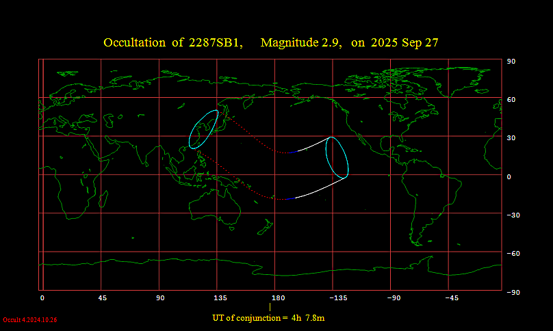 Occultation predictions of 2287SB1 Magnitude 2.9 Date 2025 Sep 27 Moon: % illumination = 24+, Solar elongation = 59 Disappearance U.T. Sun Moon CA PA WA a b Location h m s Alt Alt Az o o o m/o m/o 1 KI Kiritimati 4 52 19 -8 41 232 76N 91 80 +2.3 -0.1 2 PF Nuku Hiva 5 45 2 20 245 31S 163 152 +3.6 -6.2 3 US Hilo Hi 5 18 20 23 229 7N 22 11 -0.7 +5.7 4 US Kamuela Hi 5 21 12 23 229 2N 17 6 -2.0 +9.3 5 US Kona Hi 5 19 23 23 228 4N 19 7 -1.4 +8.0 Reappearance U.T. Sun Moon CA PA WA a b Location h m s Alt Alt Az o o o m/o m/o 1 KI Kiritimati 6 19 15 22 241 -83S 278 267 +1.2 -0.4 2 PF Nuku Hiva 6 7 5 15 245 -5S 199 188 -2.4 +6.4 3 US Hilo Hi 5 43 33 18 232 -27N 347 336 +4.1 -7.3 4 US Kamuela Hi 5 38 13 19 231 -21N 354 342 +9.9 +9.9 5 US Kona Hi 5 39 2 20 231 -23N 352 341 +5.0 -9.6 6 WS Pago Pago 5 45 47 -7 49 246 -40S 234 223 +1.7 +2.9 Sites Location E. Long Latitude 1 KI Kiritimati -157 21.0 1 59.2 2 PF Nuku Hiva -140 13.7 - 8 47.7 3 US Hilo Hi -155 2.9 19 43.2 4 US Kamuela Hi -155 40.1 20 0.1 5 US Kona Hi -156 2.7 19 44.3 6 WS Pago Pago -170 42.6 -14 19.8