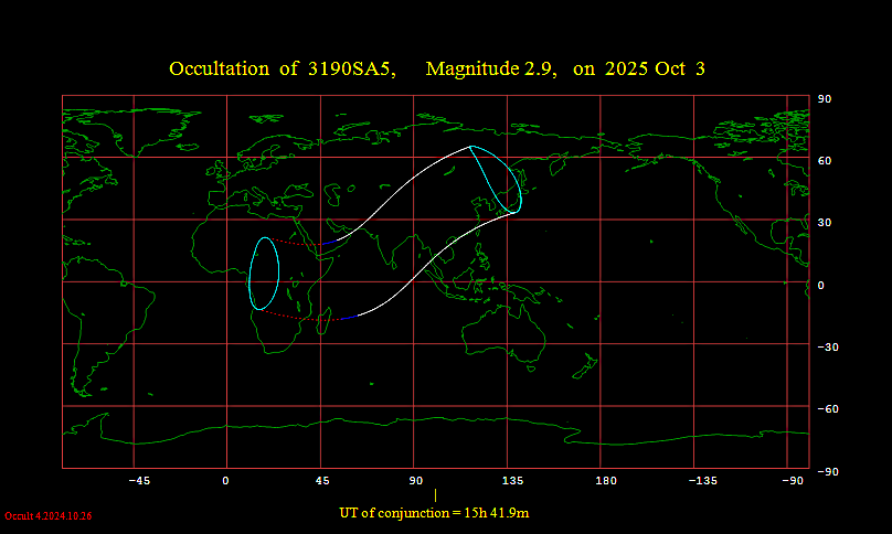 Occultation predictions of 3190SA5 Magnitude 2.9 Date 2025 Oct 3 Moon: % illumination = 84+, Solar elongation = 133 Disappearance U.T. Sun Moon CA PA WA a b Location h m s Alt Alt Az o o o m/o m/o 1 BD Chittagong 15 35 56 50 197 81N 59 77 +2.1 +0.9 2 BD Cox'S Bazar 15 35 32 51 197 83N 62 80 +2.1 +0.9 3 BD Dhaka 15 34 49 49 194 74N 52 70 +1.9 +1.1 4 BD Dhaka 15 34 42 49 194 74N 52 70 +1.9 +1.1 5 BD Ishurdi 15 32 44 49 191 71N 49 67 +1.8 +1.3 6 BD Jessore 15 31 44 50 191 73N 51 69 +1.9 +1.2 7 BD Rajshahi 15 32 20 49 191 69N 47 65 +1.7 +1.3 8 BD Saidpur 15 34 30 48 191 67N 45 63 +1.6 +1.3 9 BD Sylhet Osmani 15 38 41 48 197 75N 53 71 +1.8 +1.0 10 BT Paro 15 37 38 46 193 64N 42 60 +1.5 +1.3 11 CN Beijing 16 16 53 19 228 85N 63 81 +0.9 -0.3 12 CN Changcha 16 19 57 29 229 64S 95 113 +2.0 -1.2 13 CN Chengdu 16 2 32 35 216 88N 66 84 +1.6 +0.2 14 CN Chongqing 16 6 54 34 220 84S 74 92 +1.7 -0.2 15 CN Dalian 16 21 51 16 233 84S 74 92 +0.9 -0.7 16 CN Fuzhou 16 43 37 21 239 24S 134 152 +9.9 +9.9 17 CN Guangzhou 16 30 47 30 234 37S 121 139 +4.1 -4.2 18 CN Guilin 16 16 30 34 227 60S 98 116 +2.4 -1.3 19 CN Hailar 16 17 27 12 228 64N 42 60 +0.4 +0.0 20 CN Hangzhou 16 30 26 21 236 54S 105 123 +1.8 -1.9 21 CN Harbin 16 21 19 10 235 83N 61 79 +0.5 -0.5 22 CN Hefei 16 23 3 23 232 68S 91 109 +1.5 -1.1 23 CN Hohhot 16 12 47 22 222 75N 53 71 +0.8 +0.0 24 CN Hotan 15 49 3 37 183 17N 354 12 -0.4 +3.0 25 CN Jiamusi 16 22 34 6 238 84N 62 80 +0.4 -0.6 26 CN Jinghonggasa 15 56 4 45 215 76S 83 101 +2.5 -0.2 27 CN Kunming 16 0 15 41 217 80S 79 97 +2.1 -0.1 28 CN Lanzhou 16 3 57 30 214 72N 50 68 +1.1 +0.4 29 CN Mudanjiang 16 23 40 8 238 90S 68 86 +0.5 -0.7 30 CN Nanchang 16 24 40 26 232 58S 100 118 +2.0 -1.6 31 CN Nanjing 16 25 31 22 233 64S 94 112 +1.6 -1.3 32 CN Ningbo 16 33 12 20 237 49S 110 128 +2.0 -2.4 33 CN Qingdao 16 22 42 19 233 77S 81 99 +1.1 -0.8 34 CN Shanghai 16 30 9 20 236 56S 102 120 +1.7 -1.8 35 CN Shenzhen 16 36 31 29 235 27S 131 149 +7.0 -9.0 36 CN Shijiazhuang 16 15 37 22 226 87N 65 83 +1.0 -0.3 37 CN Taiyuan 16 13 40 24 224 85N 63 81 +1.0 -0.2 38 CN Tianjin 16 17 55 19 229 89N 67 85 +0.9 -0.4 39 CN Urumqi 16 3 53 29 195 18N 356 14 -0.5 +2.4 40 CN Wuhan 16 19 4 27 229 71S 87 105 +1.6 -0.9 41 CN Xi'An 16 9 31 29 221 87N 65 83 +1.3 +0.0 42 CN Xichang 15 59 12 39 215 89S 69 87 +1.8 +0.2 43 CN Yanji 16 24 48 9 238 85S 73 91 +0.6 -0.8 44 CN Yantai 16 22 51 17 233 79S 79 97 +1.0 -0.8 45 CN Yichang 16 14 41 29 226 76S 82 100 +1.6 -0.6 46 CN Zhengzhou 16 15 59 25 227 84S 75 92 +1.3 -0.5 47 IN Agartala 15 36 24 49 196 76N 54 72 +1.9 +1.0 48 IN Agatti Island 14 36 46 55 139 67N 45 63 +2.1 +2.0 49 IN Agra 15 22 42 47 172 39N 17 35 +0.9 +2.4 50 IN Ahmedabad 15 6 55 48 158 37N 15 33 +1.0 +2.8 51 IN Aizwal 15 39 16 48 199 80N 58 76 +1.9 +0.9 52 IN Akola 15 6 47 52 163 52N 30 48 +1.5 +2.2 53 IN Allahabad 15 23 19 49 177 52N 30 48 +1.3 +2.0 54 IN Along 15 46 44 43 203 74N 52 70 +1.6 +0.9 55 IN Amritsar 15 33 45 42 172 18N 356 14 -0.2 +3.3 56 IN Aurangabad 15 2 23 52 159 51N 29 47 +1.5 +2.3 57 IN Baghdogra 15 34 55 47 191 63N 41 59 +1.5 +1.4 58 IN Bakshi Ka Talab 15 25 24 47 177 46N 24 42 +1.1 +2.1 59 IN Balurghat 15 33 41 48 191 68N 46 64 +1.7 +1.3 60 IN Bangalore 14 52 34 58 154 72N 50 68 +2.2 +1.8 61 IN Bareilly 15 27 1 46 175 40N 17 35 +0.9 +2.3 62 IN Baroda 15 5 31 49 158 40N 18 36 +1.2 +2.7 63 IN Belgaum 14 52 9 54 152 59N 37 55 +1.8 +2.2 64 IN Bhatinda 15 29 11 43 170 22N 0 18 +0.2 +3.1 65 IN Bhaunagar 15 2 44 49 155 40N 18 36 +1.2 +2.7 66 IN Bhiwani 15 25 35 45 171 30N 8 26 +0.6 +2.7 67 IN Bhopal 15 13 0 50 167 47N 25 43 +1.3 +2.3 68 IN Bhubaneswar 15 21 26 54 183 72N 50 68 +2.0 +1.4 69 IN Bhuj 15 4 48 47 153 30N 8 26 +0.8 +3.2 70 IN Bidar 15 1 39 54 161 60N 38 56 +1.8 +2.0 71 IN Bikaner 15 21 58 45 165 25N 2 21 +0.4 +3.1 72 IN Bilaspur 15 17 31 52 175 60N 38 56 +1.7 +1.8 73 IN Bokaro 15 26 58 50 185 65N 43 61 +1.7 +1.5 74 IN Bombay 14 56 42 51 153 48N 26 44 +1.5 +2.5 75 IN Bombay 14 56 41 51 153 48N 26 44 +1.5 +2.5 76 IN Calcutta 15 29 44 51 190 73N 51 69 +1.9 +1.3 77 IN Calicut 14 45 35 58 148 73N 51 69 +2.2 +1.8 78 IN Carnicobar 15 35 0 62 205 57S 101 119 +4.4 -0.9 79 IN Chandigarh 15 30 53 43 173 27N 5 23 +0.4 +2.8 80 IN Coimbatore 14 47 54 59 150 75N 53 71 +2.3 +1.7 81 IN Cooch-Behar 15 36 8 47 193 67N 45 63 +1.6 +1.3 82 IN Cuddapah 14 57 41 58 159 70N 48 66 +2.1 +1.8 83 IN Daman 15 0 6 50 154 44N 22 40 +1.3 +2.6 84 IN Deesa 15 9 51 47 159 33N 11 29 +0.9 +2.9 85 IN Dehra Dun 15 30 19 44 175 32N 10 28 +0.6 +2.5 86 IN Delhi 15 25 28 45 172 34N 11 29 +0.7 +2.6 87 IN Delhi 15 25 35 45 172 34N 12 30 +0.7 +2.6 88 IN Deparizo 15 45 38 43 202 73N 51 69 +1.6 +0.9 89 IN Dhanbad 15 27 43 50 186 65N 43 61 +1.7 +1.5 90 IN Dundigul 15 2 45 55 162 62N 40 58 +1.9 +2.0 91 IN Gauhati 15 39 23 46 197 72N 50 68 +1.7 +1.1 92 IN Gaya 15 26 48 49 183 60N 38 56 +1.5 +1.6 93 IN Goa 14 49 39 54 149 59N 37 55 +1.8 +2.2 94 IN Gorakhpur 15 28 3 47 181 52N 30 48 +1.3 +1.8 95 IN Guna 15 16 10 49 168 44N 22 40 +1.2 +2.3 96 IN Gwalior 15 20 56 47 171 42N 20 38 +1.1 +2.3 97 IN Hirakud 15 20 2 53 179 65N 43 61 +1.8 +1.6 98 IN Hissar 15 26 19 44 170 28N 6 24 +0.5 +2.8 99 IN Hyderabad 15 2 32 55 162 63N 41 59 +1.9 +1.9 100 IN Imphal 15 42 16 47 201 80N 58 76 +1.9 +0.8 101 IN Indore 15 9 42 50 163 45N 23 41 +1.3 +2.4 102 IN Jabalpur 15 16 30 51 172 53N 31 49 +1.5 +2.0 103 IN Jaipur 15 20 2 46 168 35N 13 31 +0.8 +2.6 104 IN Jaisalmer 15 17 22 45 160 22N 360 18 +0.3 +3.5 105 IN Jammu 15 37 8 41 173 15N 352 10 -0.5 +3.6 106 IN Jamnagar 15 2 29 47 153 33N 11 29 +0.9 +3.1 107 IN Jamshedpur 15 25 44 51 185 67N 45 63 +1.8 +1.5 108 IN Jeypore 15 12 54 55 174 68N 46 64 +2.0 +1.7 109 IN Jhansi 15 19 30 48 171 44N 22 40 +1.2 +2.3 110 IN Jharsuguda 15 20 41 52 180 65N 43 61 +1.8 +1.6 111 IN Jodhpur 15 16 21 46 163 30N 7 25 +0.7 +3.0 112 IN Jorhat 15 44 24 45 202 76N 54 72 +1.7 +0.9 113 IN Kailashahar 15 38 17 48 198 77N 55 73 +1.9 +1.0 114 IN Kamalpur 15 37 45 48 197 77N 55 73 +1.9 +1.0 115 IN Kandla 15 4 35 47 154 31N 9 27 +0.9 +3.1 116 IN Kanpur 15 23 3