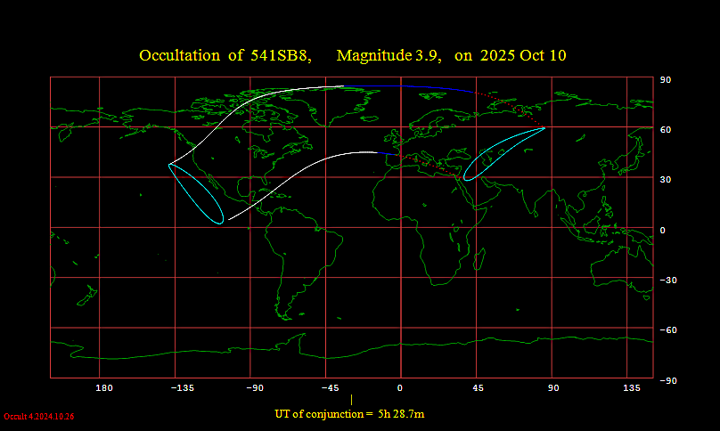 Occultation predictions of 541SB8 Magnitude 3.9 Date 2025 Oct 10 Moon: % illumination = 87-, Solar elongation = 137 Disappearance U.T. Sun Moon CA PA WA a b Location h m s Alt Alt Az o o o m/o m/o 1 AR Retalhuleu 3 29 32 17 68 -41S 121 133 +1.2 -0.8 2 BS Alice Town 3 42 55 35 77 -51S 111 123 +1.5 +0.1 3 BS Andros Town 3 45 35 37 77 -43S 119 131 +2.0 -0.5 4 BS Arthur'S Town 3 50 43 40 78 -35S 127 140 +2.8 -1.3 5 BS Bullocks Harbour 3 45 6 37 78 -48S 115 127 +1.8 -0.1 6 BS Chub Cay 3 45 6 37 77 -46S 116 128 +1.8 -0.2 7 BS Clarence Bain 3 46 2 37 77 -41S 121 134 +2.1 -0.7 8 BS Cockburn Town 3 55 48 42 78 -25S 137 150 +4.6 -3.6 9 BS Congo Town 3 46 20 37 77 -40S 122 135 +2.2 -0.8 10 BS Dead Man'S Cay 3 56 35 41 77 -20S 142 155 +6.6 -6.3 11 BS Freeport 3 43 53 36 78 -53S 110 122 +1.5 +0.2 12 BS Governor'S Harbor 3 48 20 39 78 -41S 121 134 +2.2 -0.7 13 BS Great Exuma 3 51 55 39 77 -29S 133 145 +3.5 -2.4 14 BS Marsh Harbor 3 46 23 38 78 -48S 114 126 +1.8 -0.1 15 BS Nassau 3 46 5 37 77 -44S 119 131 +2.0 -0.4 16 BS New Bight 3 51 52 40 78 -32S 130 142 +3.1 -1.8 17 BS Norman'S Cay 3 47 43 38 77 -39S 123 135 +2.3 -0.8 18 BS North Eleuthera 3 47 29 38 78 -43S 119 132 +2.1 -0.5 19 BS Rock Sound 3 49 1 39 78 -38S 124 136 +2.4 -0.9 20 BS San Andros 3 44 53 36 77 -45S 117 129 +1.8 -0.3 21 BS Sandy Point 3 45 52 37 78 -47S 115 127 +1.8 -0.2 22 BS Staniel Cay 3 49 13 38 77 -36S 127 139 +2.7 -1.3 23 BS Stella Maris 3 54 9 40 77 -26S 137 149 +4.3 -3.3 24 BS Treasure Cay 3 45 52 37 78 -50S 112 125 +1.7 +0.0 25 BS West End 3 43 27 35 78 -54S 108 121 +1.4 +0.2 26 BZ Belize City 3 31 47 22 70 -45S 117 130 +1.3 -0.5 27 CA Armstrong 4 11 33 35 93 -61N 44 56 +0.0 +2.0 28 CA Atikokan 4 8 26 33 89 -60N 42 55 +0.0 +2.0 29 CA Bagotville 4 14 59 47 107 -88N 71 83 +0.8 +1.6 30 CA Baie Comeau 4 18 31 49 112 -90S 73 85 +0.9 +1.5 31 CA Baker Lake 4 44 41 34 104 -27N 10 23 -0.4 +2.6 32 CA Brandon 4 12 16 28 85 -46N 29 42 -0.3 +2.2 33 CA Broughton Island 4 52 51 44 143 -56N 39 51 +0.4 +1.9 34 CA Buffalo Narrows 4 30 53 26 85 -21N 4 16 -0.9 +2.7 35 CA Calgary 4 23 57 21 77 -20N 3 15 -1.1 +2.7 36 CA Cape Dorset 4 42 41 41 123 -52N 34 47 +0.2 +2.1 37 CA Castlegar 4 23 17 18 74 -16N 359 11 -1.4 +2.9 38 CA Chapleau 4 7 36 38 95 -72N 55 67 +0.3 +1.9 39 CA Charlo 4 18 37 51 113 -85S 78 90 +1.0 +1.4 40 CA Charlottetown 4 20 7 54 115 -76S 86 99 +1.3 +1.1 41 CA Chatham 4 18 14 52 112 -81S 81 93 +1.1 +1.3 42 CA Churchill 4 30 28 34 98 -40N 23 35 -0.2 +2.3 43 CA Clyde River 4 57 28 40 141 -46N 29 41 +0.2 +2.1 44 CA Cold Lake 4 28 50 25 82 -20N 3 16 -1.0 +2.7 45 CA Coral Harbour 4 23 58 20 75 -17N 0 12 -1.3 +2.8 46 CA Coronation 4 23 53 23 79 -23N 6 18 -0.9 +2.6 47 CA Cranbrook 4 21 51 19 75 -19N 2 15 -1.1 +2.7 48 CA Dauphin 4 14 54 29 86 -44N 27 39 -0.3 +2.2 49 CA Deer Lake 4 30 31 57 129 -76S 87 99 +1.3 +0.9 50 CA Dryden 4 10 40 32 90 -57N 39 52 -0.1 +2.1 51 CA Earlton 4 8 35 41 98 -77N 60 72 +0.4 +1.8 52 CA Edmonton 4 30 20 23 80 -14N 357 9 -1.4 +3.0 53 CA Eskimo Point 4 36 3 34 101 -36N 19 31 -0.3 +2.4 54 CA Estevan 4 11 53 26 82 -43N 26 38 -0.4 +2.2 55 CA Flin Flon 4 23 39 29 88 -36N 19 31 -0.5 +2.3 56 CA Forestville 4 17 9 49 110 -90N 72 85 +0.8 +1.5 57 CA Fort McMurray 4 36 36 26 84 -11N 354 7 -1.6 +3.3 58 CA Fredericton 4 15 36 51 109 -80S 82 95 +1.1 +1.3 59 CA Gander 4 34 16 59 134 -71S 91 104 +1.5 +0.7 60 CA Gaspe 4 21 35 52 116 -84S 78 91 +1.0 +1.3 61 CA Gatineau 4 7 10 44 99 -87N 70 82 +0.7 +1.6 62 CA Geraldton 4 10 41 36 94 -64N 47 59 +0.1 +2.0 63 CA Gillam 4 25 8 33 95 -43N 26 38 -0.2 +2.3 64 CA Gjoa Haven 4 56 15 34 109 -18N 1 13 -0.7 +2.9 65 CA Goose Bay 4 31 45 53 130 -89S 73 85 +1.0 +1.3 66 CA Gore Bay 4 4 16 38 93 -77N 59 72 +0.4 +1.8 67 CA Greenwood 4 16 26 53 110 -76S 87 99 +1.2 +1.1 68 CA Halifax 4 18 6 54 112 -73S 89 101 +1.3 +1.0 69 CA Hall Beach 4 52 33 38 124 -38N 21 33 +0.0 +2.4 70 CA Hamilton 4 0 45 40 92 -86N 68 80 +0.5 +1.6 71 CA Hudson Bay 4 19 38 28 86 -38N 21 33 -0.5 +2.3 72 CA Iles De La Madeleine 4 23 3 55 118 -77S 85 98 +1.3 +1.1 73 CA Iqaluit 4 43 57 44 132 -60N 43 55 +0.4 +1.9 74 CA Kapuskasing 4 10 52 39 97 -71N 53 66 +0.3 +1.9 75 CA Kelowna 4 28 41 18 74 -6N 349 2 -2.6 +4.3 76 CA Kenora 4 10 45 31 88 -54N 37 49 -0.1 +2.1 77 CA Kindersley 4 20 40 24 80 -29N 12 24 -0.7 +2.4 78 CA Kingston 4 4 25 43 96 -88N 71 83 +0.7 +1.6 79 CA Kuujjuararapik 4 23 50 43 110 -67N 49 62 +0.3 +2.0 80 CA La Grande Riviere 4 20 36 43 107 -70N 52 65 +0.4 +1.9 81 CA La Ronge 4 26 46 27 86 -29N 12 24 -0.6 +2.4 82 CA Lethbridge 4 18 58 21 76 -26N 9 21 -0.9 +2.5 83 CA Lloydminster 4 25 49 24 81 -23N 6 18 -0.9 +2.6 84 CA London 3 59 54 39 91 -84N 67 79 +0.5 +1.7 85 CA Lynn Lake 4 28 33 30 91 -33N 16 28 -0.5 +2.4 86 CA Maniwaki 4 8 8 43 99 -85N 68 80 +0.6 +1.7 87 CA Matagami 4 13 15 42 102 -76N 59 71 +0.5 +1.8 88 CA Meadow Lake 4 26 32 25 83 -25N 8 20 -0.8 +2.5 89 CA Medicine Hat 4 18 13 22 78 -29N 12 24 -0.8 +2.4 90 CA Moncton 4 18 0 53 112 -78S 84 97 +1.2 +1.2 91 CA Mont Joli 4 17 44 50 111 -89S 74 86 +0.9 +1.5 92 CA Montreal 4 8 29 45 101 -89N 72 84 +0.7 +1.6 93 CA Moose Jaw 4 15 35 25 81 -37N 20 32 -0.5 +2.3 94 CA Moosonee 4 15 3 41 101 -70N 53 65 +0.3 +1.9 95 CA Muskoka 4 4 4 41 95 -83N 66 78 +0.5 +1.7 96 CA Nakina 4 11 32 36 95 -64N 47 59 +0.1 +2.0 97 CA Nanisivik 5 3 33 35 126 -25N 8 20 -0.3 +2.7 98 CA Natashquan 4 26 17 54 123 -84S 79 91 +1.1 +1.3 99 CA North Battleford 4 22 59 25 82 -28N 11 23 -0.7 +2.4 100 CA North Bay 4 6 22 41 96 -80N 63 75 +0.5 +1.7 101 CA Ottawa 4 6 47 44 98 -88N 70 82 +0.7 +1.6 102 CA Pangnirtung 4 49 36 44 139 -58N 41 53 +0.4 +1.9 103 CA Pelly Bay 4 53 16 35 115 -28N 11 23 -0.3 +2.6 104 CA Penticton 4 27 12 18 73 -8N 351 3 -2.2 +3.9 105 CA Petawawa 4 6 48 42 98 -84N 67 79 +0.6 +1.7 106 CA Peterborough 4 3 21 41 95 -86N 68 81 +0.6 +1.6 107 CA Pickle Lake 4 13 55 35 93 -57N 40 52 +0.0 +2.1 108 CA Pond Inlet 5 1 47 37 132 -33N 16 28 -0.1 +2.4 109 CA Port Menier 4 23 12 52 118 -86S 76 89 +1.0 +1.4 110 CA Portage-La-Prairie 4 11 46 29 86 -49N 32 44 -0.3 +2.1 111 CA Prince Albert 4 22 19 26 84 -32N 15 