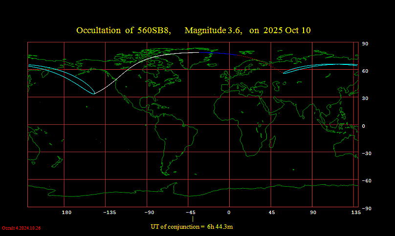 Occultation predictions of 560SB8 Magnitude 3.6 Date 2025 Oct 10 Moon: % illumination = 86-, Solar elongation = 136 Disappearance U.T. Sun Moon CA PA WA a b Location h m s Alt Alt Az o o o m/o m/o 1 CA Alert 6 21 58 32 174 -34S 130 142 +0.3 -0.8 2 CA Burwash 5 29 35 19 73 -57S 107 119 +0.0 +1.4 3 CA Cambridge Bay 5 55 12 35 115 -28S 135 147 +0.9 +0.6 4 CA Campbell River 5 22 10 22 79 -22S 141 153 +1.4 -0.1 5 CA Comox 5 22 50 23 79 -20S 143 155 +1.6 -0.4 6 CA Coppermine 5 46 21 31 102 -39S 124 136 +0.6 +1.3 7 CA Dawson 5 33 34 20 75 -58S 105 118 +0.0 +1.5 8 CA Dawson Creek 5 30 10 27 87 -26S 137 149 +1.2 +0.5 9 CA Dease Lake 5 26 47 22 79 -46S 117 129 +0.3 +1.3 10 CA Eureka 6 13 37 33 146 -35S 128 140 +0.4 +0.3 11 CA Faro 5 31 21 22 79 -52S 111 123 +0.2 +1.5 12 CA Fort McPherson 5 39 8 23 81 -56S 107 120 +0.1 +1.6 13 CA Fort Nelson 5 30 52 26 86 -37S 126 138 +0.6 +1.1 14 CA Fort Resolution 5 40 56 32 98 -25S 138 150 +1.3 +0.5 15 CA Fort Saint John 5 29 54 27 86 -29S 135 147 +1.0 +0.7 16 CA Fort Simpson 5 35 5 28 90 -39S 124 136 +0.6 +1.2 17 CA Fort Smith 5 43 37 33 99 -16S 148 159 +2.3 -0.8 18 CA Grande Prairie 5 31 39 28 88 -21S 142 154 +1.6 +0.0 19 CA Hay River 5 38 26 31 95 -29S 135 147 +1.0 +0.7 20 CA High Level 5 35 20 30 92 -26S 137 149 +1.2 +0.6 21 CA Holman Island 5 49 1 29 101 -44S 119 131 +0.4 +1.4 22 CA Inuvik 5 40 44 23 83 -55S 108 120 +0.1 +1.6 23 CA Mayo 5 33 6 21 78 -55S 108 120 +0.1 +1.5 24 CA Nanaimo 5 26 40 24 80 -10S 153 165 +4.9 -4.3 25 CA Norman Wells 5 37 25 25 87 -48S 115 127 +0.3 +1.5 26 CA Old Crow 5 39 4 21 77 -59S 104 116 +0.0 +1.6 27 CA Peace River 5 34 3 29 90 -20S 143 155 +1.8 -0.1 28 CA Port Hardy 5 20 24 21 77 -30S 134 146 +0.8 +0.5 29 CA Prince George 5 26 25 25 83 -27S 136 148 +1.1 +0.5 30 CA Prince Pupert 5 21 49 20 76 -41S 122 134 +0.4 +1.1 31 CA Quesnel 5 26 8 25 83 -24S 139 151 +1.3 +0.3 32 CA Resolute 6 6 36 35 132 -30S 134 146 +0.7 +0.4 33 CA Sachs Harbour 5 48 22 27 95 -51S 113 125 +0.3 +1.6 34 CA Sandspit 5 20 14 19 75 -42S 121 133 +0.3 +1.0 35 CA Smithers 5 23 53 22 79 -38S 126 138 +0.5 +1.0 36 CA Terrace 5 22 47 21 78 -39S 124 136 +0.5 +1.0 37 CA Teslin 5 28 30 21 78 -50S 113 125 +0.2 +1.4 38 CA Tofino 5 21 33 22 78 -20S 143 155 +1.5 -0.3 39 CA Tuktoyaktuk 5 42 38 24 85 -55S 108 120 +0.1 +1.6 40 CA Watson Lake 5 29 25 23 81 -46S 117 129 +0.3 +1.3 41 CA Whitehorse 5 28 58 20 76 -53S 110 122 +0.1 +1.4 42 CA Williams Lake 5 26 35 25 83 -20S 143 155 +1.7 -0.2 43 CA Wrigley 5 35 48 27 89 -43S 120 132 +0.5 +1.3 44 CA Yellowknife 5 41 4 31 98 -30S 134 146 +1.0 +0.8 45 GL Thule 6 29 38 37 169 -6S 157 169 +1.6 -7.5 49 US Anchorage Ak 5 30 16 14 65 -64S 99 112 -0.2 +1.4 50 US Barter Island Ak 5 43 10 20 76 -61S 102 114 +0.0 +1.6 51 US Chugiak Ak 5 30 18 14 65 -64S 99 112 -0.2 +1.4 52 US Clear Mews Ak 5 34 35 16 67 -64S 99 111 -0.1 +1.5 53 US Deadhorse Ak 5 43 31 19 71 -64S 100 112 -0.1 +1.6 54 US Delta Junction Ak 5 33 43 17 70 -62S 101 113 -0.1 +1.5 55 US Fairbanks Ak 5 35 9 16 68 -63S 100 112 -0.1 +1.5 56 US Fort Richardson Ak 5 30 19 14 65 -64S 100 112 -0.2 +1.4 57 US Fort Yukon Ak 5 37 35 18 72 -62S 101 113 -0.1 +1.5 58 US Juneau Ak 5 25 45 19 75 -51S 113 125 +0.2 +1.3 59 US Kodiak Ak 5 26 16 10 61 -64S 99 111 -0.2 +1.3 60 US Sitka Ak 5 23 54 18 74 -50S 113 125 +0.1 +1.3 61 US Skagway Ak 5 27 12 19 75 -52S 111 123 +0.1 +1.4 Reappearance U.T. Sun Moon CA PA WA a b Location h m s Alt Alt Az o o o m/o m/o 1 CA Alert 6 54 49 32 183 37S 201 213 +0.2 +1.5 2 CA Burwash 6 12 17 24 82 53S 216 228 -0.3 +1.9 3 CA Cambridge Bay 6 21 27 37 122 25S 189 201 -0.3 +2.8 4 CA Campbell River 5 38 56 25 82 14S 177 189 -1.5 +3.4 5 CA Comox 5 37 25 25 82 12S 175 187 -1.7 +3.7 6 CA Coppermine 6 20 30 34 110 35S 199 211 -0.2 +2.3 7 CA Dawson 6 17 14 24 85 55S 218 230 -0.2 +1.8 8 CA Dawson Creek 5 51 33 30 91 19S 182 194 -1.0 +3.1 9 CA Dease Lake 6 3 41 27 87 40S 204 216 -0.4 +2.1 10 CA Eureka 6 47 19 33 155 37S 201 213 +0.1 +1.9 11 CA Faro 6 12 25 26 88 48S 212 223 -0.3 +2.0 12 CA Fort McPherson 6 22 43 27 91 53S 217 228 -0.2 +1.9 13 CA Fort Nelson 6 1 28 30 93 31S 194 206 -0.5 +2.5 14 CA Fort Resolution 6 2 30 35 103 19S 182 194 -0.8 +3.1 15 CA Fort Saint John 5 53 29 30 91 22S 185 197 -0.8 +2.9 16 CA Fort Simpson 6 7 54 32 97 33S 197 209 -0.4 +2.4 17 CA Fort Smith 5 55 54 35 102 9S 172 184 -1.8 +4.5 18 CA Grande Prairie 5 47 57 31 91 13S 176 188 -1.4 +3.6 19 CA Hay River 6 2 54 34 101 23S 186 198 -0.7 +2.9 20 CA High Level 5 57 28 33 97 20S 183 195 -0.9 +3.0 21 CA Holman Island 6 27 23 33 111 42S 206 217 -0.1 +2.1 22 CA Inuvik 6 24 13 27 93 53S 216 228 -0.1 +1.9 23 CA Mayo 6 15 46 26 87 52S 215 227 -0.2 +1.9 24 CA Nanaimo 5 31 55 25 81 1S 165 177 -5.0 +7.6 25 CA Norman Wells 6 17 11 30 96 45S 208 220 -0.2 +2.1 26 CA Old Crow 6 23 49 25 87 57S 220 232 -0.2 +1.8 27 CA Peace River 5 49 41 32 93 12S 176 187 -1.5 +3.7 28 CA Port Hardy 5 43 43 25 81 22S 185 197 -1.0 +2.8 29 CA Prince George 5 48 25 28 87 20S 183 195 -1.0 +3.0 30 CA Prince Pupert 5 54 42 25 83 35S 198 210 -0.5 +2.2 31 CA Quesnel 5 45 26 28 86 17S 180 192 -1.2 +3.2 32 CA Resolute 6 34 59 36 140 29S 192 204 -0.1 +2.6 33 CA Sachs Harbour 6 30 27 30 105 49S 213 224 -0.1 +1.9 34 CA Sandspit 5 53 9 24 81 35S 199 211 -0.6 +2.2 35 CA Smithers 5 54 12 27 85 31S 194 206 -0.6 +2.4 36 CA Terrace 5 54 10 26 84 32S 196 208 -0.6 +2.3 37 CA Teslin 6 8 12 26 86 46S 209 221 -0.3 +2.0 38 CA Tofino 5 36 40 24 80 12S 175 187 -1.7 +3.6 39 CA Tuktoyaktuk 6 26 17 28 95 53S 216 228 -0.1 +1.9 40 CA Watson Lake 6 6 51 28 89 41S 205 216 -0.3 +2.1 41 CA Whitehorse 6 9 56 25 85 49S 212 224 -0.3 +2.0 42 CA Williams Lake 5 41 55 28 86 12S 175 187 -1.6 +3.7 43 CA Wrigley 6 11 58 31 97 38S 202 214 -0.3 +2.2 44 CA Yellowknife 6 6 43 34 104 24S 187 199 -0.6 +2.8 45 GL Thule 6 36 46 38 171 8S 171 183 -0.7 +8.9 46 RU Anadyr 6 32 9 -10 9 51 78S 241 253 -0.4 +1.2 47 RU Pevek 6 38 14 -8 9 47 79S 243 254 -0.4 +1.1 48 RU Provideniya Bay 6 33 46 -8 7 47 79S 243 254 -0.5 +1.1 49 US Anchorage Ak 6 15 4 19 74 61S 225 237 -0.3 +1.7 50 US Barter Island Ak 6 29 0