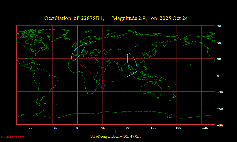 Occultation predictions of 2287SB1 Magnitude 2.9 Date 2025 Oct 24 Moon: % illumination = 8+, Solar elongation = 32 Disappearance U.T. Sun Moon CA PA WA a b Location h m s Alt Alt Az o o o m/o m/o 1 BD Chittagong 11 49 51 -7 13 235 53N 73 62 +0.8 -0.3 2 BD Cox'S Bazar 11 50 15 -8 13 235 55N 76 65 +0.9 -0.3 3 BD Dhaka 11 48 27 -6 13 233 46N 67 56 +0.8 -0.1 4 BD Dhaka 11 48 28 -6 13 233 47N 67 56 +0.8 -0.1 5 BD Sylhet Osmani 11 49 23 -8 11 234 45N 66 54 +0.7 -0.1 6 CN Jinghonggasa 11 56 9 5 239 66N 86 75 +0.6 -0.7 7 CN Kunming 11 55 13 2 240 60N 81 69 +0.4 -0.6 8 CN Xichang 11 53 23 1 239 51N 72 60 +0.3 -0.5 9 ID Banda Aceh 12 9 46 14 241 69S 131 120 +1.6 -2.0 10 ID Gunung Sitoli 12 27 57 10 243 37S 163 152 +3.5 -6.3 11 ID Lhok Sukon 12 13 39 12 242 63S 137 126 +1.6 -2.3 12 ID Medan 12 20 16 10 243 51S 149 137 +2.0 -3.3 13 ID Padang Sidempuan 12 33 45 7 243 28S 172 161 +9.9 +9.9 14 ID Sabang 12 8 59 15 241 70S 130 119 +1.5 -1.9 15 ID Sibolga 12 29 38 9 243 34S 166 154 +3.8 -7.2 16 ID Whok Seumawe 12 12 49 13 242 64S 136 125 +1.6 -2.2 17 IN Agartala 11 49 6 -7 12 234 47N 68 57 +0.7 -0.1 18 IN Aizwal 11 50 18 -9 11 235 50N 71 59 +0.7 -0.2 20 IN Along 11 50 39 -11 7 235 40N 60 49 +0.4 -0.1 27 IN Carnicobar 12 0 20 -9 17 239 87S 114 102 +1.4 -1.2 30 IN Deparizo 11 50 25 -11 8 235 39N 60 49 +0.4 +0.0 33 IN Gauhati 11 49 8 -8 11 234 41N 62 51 +0.6 +0.0 38 IN Imphal 11 50 48 -10 10 235 48N 69 58 +0.6 -0.2 43 IN Jorhat 11 50 33 -10 8 235 43N 64 52 +0.5 -0.1 44 IN Kailashahar 11 49 35 -8 11 234 47N 68 57 +0.7 -0.2 45 IN Kamalpur 11 49 29 -8 12 234 47N 68 57 +0.7 -0.2 48 IN Lilabari 11 50 26 -10 8 235 41N 62 51 +0.5 -0.1 53 IN Mohanbari 11 50 52 -11 7 236 42N 63 51 +0.4 -0.1 58 IN Pasighat 11 50 53 -12 7 236 41N 62 50 +0.4 -0.1 60 IN Port Blair 11 57 23 -8 16 238 85N 106 94 +1.3 -1.0 68 IN Silchar 11 50 7 -9 10 235 47N 67 56 +0.6 -0.2 78 IN Zero 11 50 21 -10 8 235 40N 61 49 +0.5 +0.0 79 KH Battambang 12 6 56 5 242 83S 117 106 +0.9 -1.4 80 KH Kompong Chnang 12 9 25 3 242 78S 122 111 +0.9 -1.6 81 KH Phnom-Penh 12 10 46 3 242 75S 126 114 +1.0 -1.7 82 KH Siem-Reap 12 7 1 4 242 83S 117 106 +0.9 -1.4 83 KH Stung Treng 12 8 43 2 243 80S 120 109 +0.8 -1.5 84 LA Bane Houei Say 11 57 11 6 239 70N 91 79 +0.6 -0.8 85 LA Luang Prabang 11 58 33 4 240 74N 94 83 +0.6 -0.9 86 LA Pakse 12 6 12 2 242 86S 115 103 +0.7 -1.4 87 LA Phong Savanh 11 59 38 3 241 77N 97 86 +0.6 -0.9 88 LA Savannakhet 12 3 40 2 242 88N 108 97 +0.7 -1.2 89 LA Vientiane 12 0 34 4 241 80N 101 89 +0.7 -1.0 97 MM Bagan 11 52 45 -11 10 237 60N 81 69 +0.8 -0.5 98 MM Banmaw 11 52 52 7 237 54N 75 64 +0.6 -0.4 99 MM Coco Island 11 55 52 -9 15 238 78N 99 87 +1.1 -0.8 100 MM Dawei 12 0 56 10 240 85N 106 95 +1.0 -1.1 101 MM Heho 11 54 25 9 238 64N 84 73 +0.7 -0.6 102 MM Hpa-An 11 57 49 9 239 76N 97 85 +0.9 -0.9 103 MM Kalay 11 51 16 -10 10 236 53N 74 62 +0.7 -0.3 104 MM Kawthoung 12 6 29 10 241 81S 120 108 +1.2 -1.5 105 MM Kengtung 11 55 59 6 239 66N 87 75 +0.6 -0.7 106 MM Kyaukpyu 11 52 28 -9 12 236 63N 84 72 +0.9 -0.5 107 MM Lanywa 11 52 47 -11 11 237 61N 81 70 +0.8 -0.5 108 MM Lashio 11 53 49 7 238 59N 79 68 +0.6 -0.5 109 MM Loikaw 11 55 24 9 238 67N 88 77 +0.8 -0.7 110 MM Mandalay 11 53 16 -12 9 237 60N 81 69 +0.7 -0.5 111 MM Mawlamyine 11 58 11 10 239 77N 98 87 +0.9 -0.9 112 MM Momeik 11 53 2 8 237 57N 78 66 +0.6 -0.5 113 MM Mong Hsat 11 56 15 7 239 68N 88 77 +0.7 -0.7 114 MM Myeik 12 3 19 10 240 89S 112 100 +1.0 -1.2 115 MM Myitkyina 11 52 30 6 237 51N 72 61 +0.5 -0.4 116 MM Nampong 11 52 29 6 237 51N 72 61 +0.5 -0.4 117 MM Namsang 11 55 0 8 238 65N 85 74 +0.7 -0.6 118 MM Pathein 11 55 13 -11 12 237 72N 93 82 +1.0 -0.7 119 MM Putao 11 51 55 5 237 46N 67 55 +0.4 -0.3 120 MM Pyay 11 54 20 -11 11 237 67N 88 76 +0.9 -0.6 121 MM Shante 11 53 37 -12 10 237 62N 83 71 +0.7 -0.5 122 MM Sittwe 11 51 33 -8 13 236 60N 81 70 +0.9 -0.4 123 MM Tachilek 11 56 41 6 239 69N 89 78 +0.6 -0.7 124 MM Taungoo 11 55 8 10 238 68N 89 77 +0.8 -0.7 125 MM Thandwe 11 53 43 -10 12 237 67N 88 76 +0.9 -0.6 126 MM Yangon 11 56 25 11 238 74N 94 83 +0.9 -0.8 127 MY Alor Setar 12 15 59 8 242 61S 139 128 +1.5 -2.4 128 MY Butterworth 12 17 43 8 242 58S 143 131 +1.6 -2.7 129 MY Ipoh 12 21 43 7 243 50S 150 138 +1.9 -3.3 130 MY Kerteh 12 26 48 4 243 42S 158 147 +2.4 -4.6 131 MY Kota Bahru 12 18 57 6 243 56S 144 133 +1.6 -2.8 132 MY Kuala Lumpur 12 31 58 5 243 32S 168 157 +4.4 -8.5 133 MY Kuala Terengganu 12 22 50 5 243 49S 151 139 +1.9 -3.4 134 MY Kuantan 12 30 5 4 243 36S 164 153 +3.3 -6.4 135 MY Penang 12 18 1 8 242 57S 143 132 +1.7 -2.7 136 MY Pulau 12 14 39 9 242 63S 137 126 +1.5 -2.3 137 MY Simpang 12 29 18 6 243 37S 163 152 +3.2 -6.2 145 RU Aldan 11 51 58 2 236 22N 42 31 -0.1 +0.5 146 RU Penza 11 51 53 4 237 43N 64 52 +0.3 -0.2 147 RU Tobolsk 11 57 50 -11 2 234 -1N 20 9 -1.7 +3.5 148 TH Bangkok 12 3 27 7 241 90N 110 99 +0.9 -1.2 149 TH Chiang Rai 11 57 40 6 240 72N 93 81 +0.7 -0.8 150 TH Krbi 12 10 9 10 241 72S 128 117 +1.3 -1.8 151 TH Lampang 11 58 8 7 239 75N 95 84 +0.7 -0.8 152 TH Loei 12 0 31 5 240 80N 101 90 +0.7 -1.0 153 TH Lop Buri 12 2 23 7 241 87N 107 96 +0.9 -1.1 154 TH Nakhon Pathom 12 2 37 8 240 88N 108 97 +0.9 -1.1 155 TH Nakhon Ratchasima 12 3 32 6 241 89N 109 98 +0.8 -1.2 156 TH Nakhon Sawan 12 1 2 7 240 83N 104 93 +0.8 -1.0 157 TH Nakhon Si Thammarat 12 10 40 9 242 72S 128 117 +1.3 -1.8 158 TH Narathiwat 12 17 9 7 243 60S 141 129 +1.5 -2.5 159 TH Pattani 12 15 42 8 242 62S 138 127 +1.5 -2.3 160 TH Phetchabun 12 0 47 6 240 82N 102 91 +0.8 -1.0 161 TH Phitsanulok 12 0 4 7 240 80N 101 89 +0.8 -1.0 162 TH Phrae 11 58 44 7 240 76N 97 85 +0.7 -0.9 163 TH Phuket 12 9 13 11 241 74S 127 115 +1.3 -1.7 164 TH Prachin Buri 12 5 10 6 241 87S 113 102 +0.9 -1.3 165 TH Prachuap Khiri Khan 12 4 24 8 241 87S 113 102 +1.0 -1.3 166 TH Ranong 12 6 56 10 241 79S 121 110 +1.2 -1.5 167 TH Rayong 12 5 25 7 241 86S 115 103 +1.0 -1.3 168 TH Sakon Nakhon 12 2 27 3 241 85N 105 94 +0.7 -1.1 169 TH Songkhla 12 14 3 8 242 65S 135 124 +1.4 -2.2 170 TH Songkhla 12 14 18 8 242 65S 136 124 +1.4 -2.2 171 T