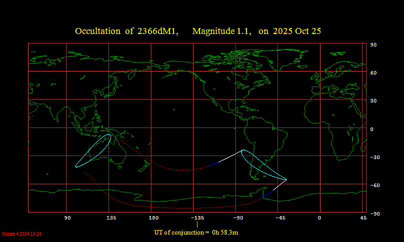 Occultation predictions of 2366dM1 Magnitude 1.1 Date 2025 Oct 25 Moon: % illumination = 11+, Solar elongation = 38 Disappearance U.T. Sun Moon CA PA WA a b Location h m s Alt Alt Az o o o m/o m/o 1 AQ Isla Rey Jorge 1 31 32 -12 15 240 45S 149 140 +0.3 +0.6 2 AQ Marambio Base 1 31 11 -10 15 239 37S 157 148 +0.4 +0.4 3 AR Bahia Blanca 1 49 13 1 237 82N 96 88 -0.4 +0.9 4 AR Chosmadal 1 53 55 5 241 69N 84 75 -0.4 +1.2 5 AR Colonel Suarez 1 50 14 0 236 79N 94 85 -0.5 +0.9 6 AR Comodoro Rivadavia 1 44 16 9 241 89S 105 97 -0.2 +1.0 7 AR Cutralco 1 51 49 6 241 74N 88 80 -0.4 +1.1 8 AR El Bolson 1 49 8 9 243 78N 92 84 -0.3 +1.1 9 AR El Maiten 1 48 57 9 242 78N 93 84 -0.3 +1.1 10 AR Esquel 1 47 58 10 243 80N 95 86 -0.2 +1.1 11 AR Fuerte Gral Roca 1 51 7 5 240 76N 90 82 -0.4 +1.0 12 AR General Pico 1 52 45 0 237 73N 88 79 -0.5 +1.0 13 AR Jose De San Martin 1 46 35 10 243 84N 98 90 -0.2 +1.1 14 AR Lago Argentino 1 40 1 15 246 85S 109 101 +0.0 +1.1 15 AR Las Heras 1 43 45 11 243 89S 105 97 -0.1 +1.0 16 AR Malargue 1 55 58 4 240 65N 80 71 -0.5 +1.2 17 AR Mendoza 1 58 43 1 239 59N 74 65 -0.6 +1.2 18 AR Neuquen 1 51 23 5 240 75N 90 81 -0.4 +1.1 19 AR Puerto Deseado 1 42 13 10 241 83S 111 102 -0.1 +0.9 20 AR Puerto Madryn 1 46 35 6 239 87N 102 93 -0.3 +0.9 21 AR Rio Gallegos 1 38 47 14 245 79S 115 107 +0.0 +1.0 22 AR Rio Grande 1 36 45 14 244 73S 121 113 +0.1 +0.9 23 AR Rio Turbio 1 38 43 15 247 82S 112 103 +0.0 +1.0 24 AR San Carlos De Bariloch 1 49 57 9 242 76N 91 82 -0.3 +1.1 25 AR San Julian 1 40 57 12 243 82S 112 104 -0.1 +0.9 26 AR San Luis 1 56 46 0 238 64N 79 70 -0.6 +1.1 27 AR San Martin Des Andes 1 51 11 8 242 74N 89 80 -0.3 +1.2 28 AR San Rafael 1 56 24 2 239 64N 79 70 -0.5 +1.2 29 AR Santa Cruz 1 40 19 12 244 82S 113 104 +0.0 +1.0 30 AR Santa Rosa 1 52 9 1 237 74N 89 80 -0.5 +1.0 31 AR Trelew 1 46 12 6 239 88N 103 94 -0.3 +0.9 32 AR Tres Arroyos 1 48 43 0 236 83N 98 89 -0.4 +0.8 33 AR Ushuaia 1 35 43 15 245 72S 123 114 +0.1 +0.9 34 AR Viedma 1 47 38 3 238 85N 100 91 -0.3 +0.9 35 CL Alto Palena 1 47 18 11 243 81N 96 87 -0.2 +1.1 36 CL Ancud 1 49 44 11 244 75N 90 81 -0.2 +1.2 37 CL Balmaceda 1 44 43 12 244 86N 101 92 -0.1 +1.1 38 CL Castro 1 49 0 11 244 76N 91 82 -0.2 +1.2 39 CL Chaiten 1 48 14 11 244 78N 93 84 -0.2 +1.2 40 CL Chile Chico 1 44 0 12 244 88N 102 93 -0.1 +1.1 41 CL Chillan 1 55 43 6 241 64N 79 70 -0.4 +1.3 42 CL Concepcion 1 55 55 7 242 64N 78 70 -0.4 +1.3 43 CL Coyhaique 1 45 8 12 244 85N 100 91 -0.1 +1.1 44 CL Curico 1 57 22 4 241 61N 76 68 -0.5 +1.3 45 CL La Serena 2 4 12 1 239 48N 63 54 -0.7 +1.5 46 CL Los Angeles 1 54 50 7 242 66N 81 72 -0.4 +1.3 47 CL Osorno 1 51 6 9 243 73N 87 79 -0.3 +1.2 48 CL Porvenir 1 37 9 15 246 77S 118 109 +0.1 +1.0 49 CL Puerto Montt 1 50 7 10 243 75N 89 81 -0.3 +1.2 50 CL Puerto Williams 1 35 42 15 245 71S 124 115 +0.1 +0.9 51 CL Punta Arenas 1 37 21 15 246 78S 116 108 +0.1 +1.0 52 CL Rancagua 1 58 10 3 240 60N 75 66 -0.5 +1.3 53 CL Santiago 1 58 57 3 240 59N 73 65 -0.6 +1.3 54 CL Santo Domingo 1 59 17 4 240 58N 72 64 -0.6 +1.3 55 CL Temuco 1 53 13 8 242 69N 84 75 -0.4 +1.2 56 CL Valdivia 1 52 17 9 243 70N 85 76 -0.3 +1.2 57 FK Mount Pleasant 1 38 16 8 237 66S 128 119 -0.1 +0.7 58 FK Stanley 1 38 18 8 236 66S 129 120 -0.1 +0.6 Reappearance U.T. Sun Moon CA PA WA a b Location h m s Alt Alt Az o o o m/o m/o 1 AQ Isla Rey Jorge 2 3 15 11 234 -25S 219 210 -0.9 +2.1 2 AQ Marambio Base 1 56 43 -12 12 234 -17S 211 203 -1.0 +2.2 6 AR Comodoro Rivadavia 2 36 38 2 232 -63S 257 249 -0.7 +1.2 8 AR El Bolson 2 43 32 1 234 -75S 269 260 -0.5 +1.0 9 AR El Maiten 2 43 15 1 234 -74S 268 260 -0.6 +1.0 10 AR Esquel 2 42 17 1 234 -72S 266 258 -0.6 +1.1 13 AR Jose De San Martin 2 40 35 2 234 -69S 263 255 -0.6 +1.2 14 AR Lago Argentino 2 33 20 7 237 -60S 254 245 -0.6 +1.5 15 AR Las Heras 2 36 39 3 234 -63S 257 249 -0.6 +1.3 19 AR Puerto Deseado 2 33 2 2 232 -58S 252 243 -0.7 +1.3 21 AR Rio Gallegos 2 29 43 7 235 -54S 248 240 -0.6 +1.5 22 AR Rio Grande 2 25 15 8 235 -49S 243 235 -0.7 +1.6 23 AR Rio Turbio 2 31 24 8 237 -57S 251 243 -0.6 +1.5 25 AR San Julian 2 32 9 4 234 -57S 251 243 -0.7 +1.4 29 AR Santa Cruz 2 31 38 5 234 -56S 250 242 -0.6 +1.5 33 AR Ushuaia 2 23 49 9 236 -48S 242 233 -0.6 +1.7 35 CL Alto Palena 2 41 51 2 235 -72S 266 257 -0.5 +1.1 36 CL Ancud 2 44 39 2 235 -77S 271 263 -0.5 +1.0 37 CL Balmaceda 2 39 6 4 235 -67S 261 253 -0.6 +1.2 38 CL Castro 2 44 5 2 235 -76S 270 262 -0.5 +1.0 39 CL Chaiten 2 43 6 2 235 -74S 268 260 -0.5 +1.1 40 CL Chile Chico 2 38 14 4 235 -66S 260 252 -0.6 +1.3 43 CL Coyhaique 2 39 42 4 235 -68S 262 254 -0.5 +1.2 47 CL Osorno 2 45 33 0 235 -79S 273 265 -0.5 +0.9 48 CL Porvenir 2 27 42 9 237 -53S 247 238 -0.6 +1.6 49 CL Puerto Montt 2 44 46 1 235 -77S 272 263 -0.5 +1.0 50 CL Puerto Williams 2 23 15 9 236 -47S 241 233 -0.7 +1.7 51 CL Punta Arenas 2 28 27 9 237 -54S 248 239 -0.6 +1.6 57 FK Mount Pleasant 2 21 24 3 229 -42S 236 228 -0.8 +1.5 58 FK Stanley 2 21 3 2 228 -42S 236 227 -0.9 +1.5 Sites Location E. Long Latitude 1 AQ Isla Rey Jorge - 58 59.2 -62 11.4 2 AQ Marambio Base - 56 37.8 -64 14.3 3 AR Bahia Blanca - 62 10.2 -38 43.5 4 AR Chosmadal - 70 13.3 -37 26.7 5 AR Colonel Suarez - 61 53.4 -37 26.8 6 AR Comodoro Rivadavia - 67 27.9 -45 47.1 7 AR Cutralco - 69 15.9 -38 56.4 8 AR El Bolson - 71 31.9 -41 56.6 9 AR El Maiten - 71 10.2 -42 1.8 10 AR Esquel - 71 8.4 -42 54.5 11 AR Fuerte Gral Roca - 67 37.2 -39 0.0 12 AR General Pico - 63 45.5 -35 41.8 13 AR Jose De San Martin - 70 27.6 -44 2.9 14 AR Lago Argentino - 72 14.9 -50 20.1 15 AR Las Heras - 68 57.9 -46 32.3 16 AR Malargue - 69 35.0 -35 29.0 17 AR Mendoza - 68 47.6 -32 49.9 18 AR Neuquen - 68 9.3 -38 56.9 19 AR Puerto Deseado - 65 54.2 -47 44.1 20 AR Puerto Madryn - 65 6.2 -42 45.5 21 AR Rio Gallegos - 69 18.8 -51 36.5 22 AR Rio Grande - 67 45.0 -53 46.7 23 AR Rio Turbio - 72 13.0 -51 36.4 24 AR San Carlos De Bariloch - 71 9.5 -41 9.1 25 AR San Julian - 67 48.2 -49 18.4 26 AR San Luis - 66 21.4 -33 16.4 27 AR San Martin Des Andes - 71 8.2 -40 4.5 28 AR San Rafael - 68 24.2 -