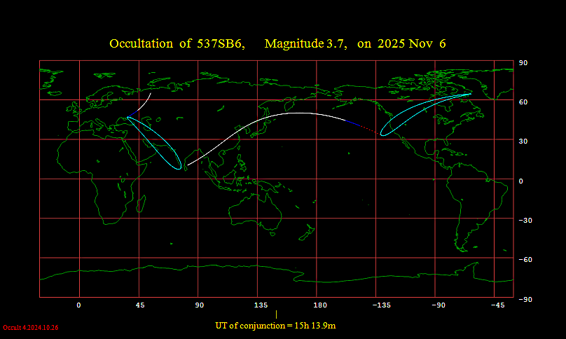 Occultation predictions of 537SB6 Magnitude 3.7 Date 2025 Nov 6 Moon: % illumination = 98-, Solar elongation = 164 Disappearance U.T. Sun Moon CA PA WA a b Location h m s Alt Alt Az o o o m/o m/o 10 AF Taluqan 13 33 39 8 66 -78N 51 63 -0.5 +1.5 12 BD Chittagong 13 18 6 18 71 -39S 112 125 +0.8 +0.0 13 BD Cox'S Bazar 13 18 15 18 70 -36S 115 128 +0.9 -0.1 14 BD Dhaka 13 17 38 17 71 -47S 104 117 +0.5 +0.4 15 BD Dhaka 13 17 36 17 71 -47S 104 117 +0.5 +0.4 16 BD Ishurdi 13 17 10 16 70 -51S 101 114 +0.4 +0.5 17 BD Jessore 13 16 48 16 70 -48S 104 116 +0.5 +0.4 18 BD Rajshahi 13 17 9 16 70 -52S 100 112 +0.4 +0.5 19 BD Saidpur 13 18 3 17 71 -55S 97 109 +0.3 +0.6 20 BD Sylhet Osmani 13 18 51 19 72 -48S 104 116 +0.6 +0.4 21 BT Paro 13 19 14 18 71 -59S 93 106 +0.3 +0.8 22 CA Alert 15 17 35 -9 17 338 -30N 3 15 +0.1 -1.6 23 CA Burwash 15 34 53 -10 24 277 -74S 78 91 +0.2 -1.3 24 CA Dawson 15 31 21 -11 24 275 -80S 72 85 +0.2 -1.3 25 CA Eureka 15 19 5 -8 17 316 -43N 16 28 +0.1 -1.1 26 CA Faro 15 34 30 -8 21 282 -80S 72 85 +0.1 -1.2 27 CA Fort McPherson 15 28 1 -11 23 277 -90S 63 75 +0.2 -1.2 28 CA Holman Island 15 26 20 -7 18 291 -74N 46 59 +0.1 -1.0 29 CA Inuvik 15 27 13 -10 23 277 -88N 60 72 +0.2 -1.1 30 CA Mayo 15 32 27 -9 23 279 -81S 71 84 +0.1 -1.2 31 CA Norman Wells 15 31 29 -7 20 286 -90N 62 74 +0.1 -1.1 32 CA Old Crow 15 26 54 25 272 -87S 65 78 +0.2 -1.2 33 CA Sachs Harbour 15 24 18 -9 21 283 -76N 48 61 +0.1 -1.1 34 CA Teslin 15 37 8 -6 20 283 -76S 76 89 +0.1 -1.3 35 CA Tuktoyaktuk 15 26 0 -11 23 277 -85N 58 70 +0.2 -1.1 36 CA Whitehorse 15 36 15 -8 22 281 -75S 77 89 +0.1 -1.3 37 CN Beijing 13 54 25 49 98 -39S 112 125 +1.8 +0.3 38 CN Chengdu 13 31 51 34 80 -39S 113 125 +1.3 +0.2 39 CN Chongqing 13 36 28 37 81 -28S 124 136 +2.0 -0.5 40 CN Dalian 14 6 32 55 104 -20S 132 144 +3.2 -1.8 41 CN Hailar 14 5 26 50 114 -59S 93 106 +1.2 +1.0 42 CN Harbin 14 13 5 57 120 -37S 114 127 +2.0 -0.1 43 CN Hohhot 13 47 54 44 95 -51S 100 113 +1.2 +0.8 44 CN Hotan 13 30 23 16 71 -89N 62 74 -0.2 +1.4 45 CN Jiamusi 14 21 21 60 130 -33S 118 131 +2.1 -0.5 46 CN Kashi 13 35 13 14 70 -81N 53 66 -0.3 +1.6 47 CN Kunming 13 32 22 32 76 -18S 133 146 +2.7 -1.8 48 CN Lanzhou 13 35 23 35 84 -56S 96 108 +0.9 +1.0 49 CN Mudanjiang 14 21 28 61 125 -25S 127 139 +2.6 -1.3 50 CN Shijiazhuang 13 50 38 47 94 -37S 114 126 +1.8 +0.2 51 CN Taiyuan 13 47 2 45 92 -41S 111 123 +1.6 +0.4 52 CN Tianjin 13 55 47 50 98 -34S 118 130 +2.0 -0.1 53 CN Urumqi 13 40 5 25 79 -87N 60 72 +0.0 +1.6 54 CN Xi'An 13 39 49 40 86 -39S 112 124 +1.5 +0.3 55 CN Xichang 13 29 9 31 77 -34S 117 130 +1.4 -0.1 56 CN Yanji 14 24 20 62 124 -15S 137 149 +3.6 -3.2 57 CN Yantai 14 10 42 56 102 -7S 144 156 +6.0 -6.1 58 CN Yichang 13 49 25 44 85 -10S 142 154 +5.2 -4.5 59 CN Zhengzhou 13 49 55 46 90 -25S 127 139 +2.6 -0.9 61 IN Agartala 13 18 6 18 71 -46S 106 118 +0.6 +0.3 63 IN Agra 13 18 44 8 67 -74S 78 91 -0.2 +1.0 65 IN Aizwal 13 19 3 20 71 -42S 109 122 +0.7 +0.2 67 IN Allahabad 13 16 47 10 68 -65S 87 99 +0.0 +0.8 68 IN Along 13 22 15 23 74 -51S 100 113 +0.6 +0.6 69 IN Amritsar 13 24 39 9 67 -87S 65 78 -0.3 +1.2 71 IN Baghdogra 13 18 30 17 71 -58S 93 106 +0.3 +0.7 72 IN Bakshi Ka Talab 13 18 10 11 68 -70S 82 95 -0.1 +0.9 73 IN Balurghat 13 17 41 16 71 -54S 98 110 +0.3 +0.6 75 IN Bareilly 13 19 45 10 68 -75S 77 90 -0.2 +1.0 82 IN Bhubaneswar 13 14 37 11 68 -45S 107 119 +0.4 +0.2 86 IN Bilaspur 13 14 31 9 67 -56S 96 108 +0.1 +0.5 87 IN Bokaro 13 16 0 13 69 -54S 98 110 +0.2 +0.5 90 IN Calcutta 13 16 18 15 70 -47S 104 117 +0.4 +0.3 92 IN Chandigarh 13 22 48 10 67 -82S 70 82 -0.3 +1.2 94 IN Cooch-Behar 13 18 37 18 71 -56S 96 108 +0.3 +0.7 98 IN Dehra Dun 13 21 53 10 68 -80S 72 85 -0.2 +1.1 99 IN Delhi 13 20 21 8 67 -78S 74 87 -0.2 +1.1 100 IN Delhi 13 20 21 9 67 -78S 74 87 -0.2 +1.1 101 IN Deparizo 13 21 47 23 74 -52S 100 112 +0.6 +0.6 102 IN Dhanbad 13 16 9 14 69 -54S 97 110 +0.2 +0.5 104 IN Gauhati 13 19 18 19 72 -51S 100 113 +0.5 +0.6 105 IN Gaya 13 16 28 13 69 -59S 93 105 +0.1 +0.7 107 IN Gorakhpur 13 17 52 12 69 -66S 86 99 +0.0 +0.9 110 IN Hirakud 13 14 34 10 68 -52S 100 112 +0.2 +0.4 113 IN Imphal 13 20 0 21 72 -43S 108 121 +0.7 +0.3 118 IN Jammu 13 25 51 9 67 -89S 64 76 -0.3 +1.3 120 IN Jamshedpur 13 15 35 13 69 -52S 100 112 +0.3 +0.5 123 IN Jharsuguda 13 14 44 11 68 -53S 99 111 +0.2 +0.4 125 IN Jorhat 13 21 2 22 73 -48S 103 116 +0.6 +0.5 126 IN Kailashahar 13 18 40 19 71 -46S 106 119 +0.6 +0.3 127 IN Kamalpur 13 18 29 19 71 -45S 106 119 +0.6 +0.3 129 IN Kanpur 13 17 40 10 68 -69S 83 95 -0.1 +0.9 131 IN Khajuraho 13 16 23 9 67 -66S 86 98 -0.1 +0.8 134 IN Kulu 13 24 8 11 68 -84S 68 80 -0.3 +1.2 135 IN Leh 13 26 52 12 69 -88S 64 76 -0.3 +1.3 136 IN Lilabari 13 21 17 22 73 -50S 102 114 +0.6 +0.6 137 IN Lucknow 13 17 57 10 68 -69S 83 95 -0.1 +0.9 138 IN Ludhiaha 13 23 15 9 67 -84S 68 81 -0.3 +1.2 142 IN Mazuffarpur 13 17 30 14 70 -62S 90 103 +0.1 +0.8 143 IN Mohanbari 13 21 59 23 74 -49S 103 115 +0.7 +0.5 146 IN Nainital 13 20 23 11 68 -76S 76 89 -0.2 +1.1 148 IN Nawapara 13 14 2 9 67 -52S 99 112 +0.1 +0.4 149 IN Panagarh 13 16 17 14 70 -51S 100 113 +0.3 +0.5 150 IN Pasighat 13 22 31 24 74 -50S 102 114 +0.7 +0.6 151 IN Pathankot 13 25 2 10 67 -87S 65 78 -0.3 +1.3 152 IN Patiala 13 22 29 9 67 -82S 70 82 -0.3 +1.2 153 IN Patina 13 17 4 13 69 -61S 91 104 +0.1 +0.7 156 IN Purnea 13 17 38 15 70 -58S 94 107 +0.2 +0.7 157 IN Raibarelli 13 17 29 11 68 -67S 84 97 -0.1 +0.9 158 IN Raipur 13 14 4 8 67 -54S 97 110 +0.1 +0.5 161 IN Ranchi 13 15 37 12 69 -55S 97 110 +0.2 +0.5 162 IN Rourkela 13 15 2 11 68 -52S 99 112 +0.2 +0.5 163 IN Saharanpur 13 21 51 10 68 -80S 72 84 -0.2 +1.1 165 IN Shimla 13 23 11 10 68 -83S 69 82 -0.3 +1.2 167 IN Silchar 13 19 29 20 72 -45S 106 119 +0.7 +0.3 168 IN Srinagar 13 27 33 10 68 -89N 61 74 -0.3 +1.3 175 IN Utkela 13 13 52 9 67 -49S 103 115 +0.2 +0.3 176 IN Varanasi 13 16 45 11 68 -64S 88 101 +0.0 +0.8 179 IN Zero 13 21 16 22 73 -51S 100 113 +0.6 +0.6 212 KG Bishkek 13 41 28 16 71 -73N 46 58 -0.4 +1.7 213 KG Osh 13 38 6 13 69 -75N 48 60 -0.4 +1.6 214 KZ Aktyub