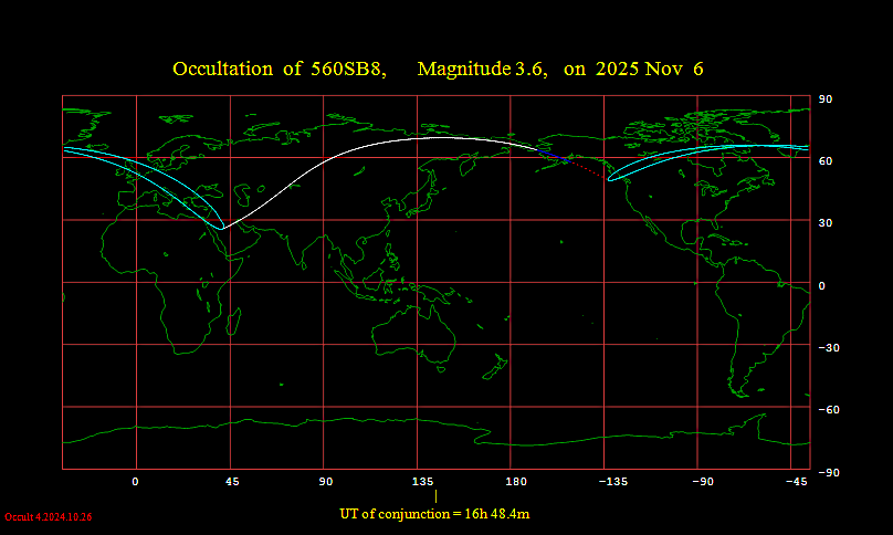 Occultation predictions of 560SB8 Magnitude 3.6 Date 2025 Nov 6 Moon: % illumination = 98-, Solar elongation = 163 Disappearance U.T. Sun Moon CA PA WA a b Location h m s Alt Alt Az o o o m/o m/o 1 AM Yerevan 15 7 29 8 65 -48S 106 118 -0.1 +0.8 8 AZ Baku 15 7 50 12 68 -41S 112 125 +0.1 +0.7 15 BY Homel 15 24 29 -10 8 60 -73S 81 93 -0.4 +1.2 18 BY Vitebsk 15 28 10 -11 9 61 -76S 78 90 -0.4 +1.3 19 CA Alert 16 23 33 -9 17 352 -75S 79 91 -0.2 -0.3 20 CA Eureka 16 30 9 -6 15 332 -72S 82 94 -0.2 -0.8 118 EE Armari Air Force Base 15 35 41 -10 9 58 -81S 73 86 -0.4 +1.3 119 EE Kardla 15 35 51 -9 9 57 -81S 73 85 -0.4 +1.3 120 EE Kuressaare 15 35 1 -9 8 57 -81S 73 85 -0.4 +1.3 121 EE Parnu 15 34 30 -10 9 58 -80S 74 86 -0.4 +1.3 122 EE Tallinn-Ulemiste Internationa 15 35 39 -10 10 59 -80S 74 86 -0.4 +1.3 123 EE Tartu-Ulenurme 15 33 30 -11 10 60 -79S 75 87 -0.4 +1.3 126 FI Enontekio 15 48 13 15 62 -82S 72 85 -0.3 +1.4 127 FI Eura 15 38 51 -10 10 57 -82S 72 84 -0.4 +1.3 128 FI Halli 15 38 53 -11 11 60 -81S 73 85 -0.3 +1.3 129 FI Hameenkyro 15 39 16 -10 11 58 -82S 72 84 -0.4 +1.3 130 FI Hanko 15 36 51 -10 9 58 -81S 73 85 -0.4 +1.3 131 FI Helsinki 15 36 41 -11 10 59 -81S 73 86 -0.4 +1.3 132 FI Hyvinkaa 15 37 16 -11 11 59 -81S 73 85 -0.4 +1.3 133 FI Immola 15 36 44 13 63 -79S 75 87 -0.3 +1.4 134 FI Ivalo 15 47 36 16 65 -80S 74 86 -0.2 +1.5 135 FI Joensuu 15 38 29 14 64 -79S 75 87 -0.3 +1.4 136 FI Jyvaskyla 15 39 20 -12 12 61 -81S 73 85 -0.3 +1.4 137 FI Kajaani 15 41 20 14 63 -80S 74 86 -0.3 +1.4 138 FI Kauhajoki 15 40 32 -10 11 58 -82S 72 84 -0.4 +1.3 139 FI Kauhava 15 41 11 -11 12 59 -82S 72 84 -0.3 +1.3 140 FI Kemi 15 44 18 14 61 -81S 73 85 -0.3 +1.4 141 FI Kemijarvi 15 44 56 15 64 -80S 74 86 -0.3 +1.4 142 FI Kikala 15 37 26 -10 10 58 -81S 73 85 -0.4 +1.3 143 FI Kitee 15 37 40 14 64 -79S 75 88 -0.3 +1.4 144 FI Kittila 15 46 55 15 63 -81S 73 85 -0.3 +1.4 145 FI Kruunupyy 15 41 57 -11 12 59 -82S 72 84 -0.3 +1.3 146 FI Kuopio 15 39 30 13 63 -80S 74 86 -0.3 +1.4 147 FI Kuusamo 15 43 21 15 65 -80S 75 87 -0.2 +1.4 148 FI Lappeenranta 15 36 41 12 62 -79S 75 87 -0.3 +1.4 149 FI Mariehamn 15 38 30 -8 8 55 -83S 71 83 -0.4 +1.2 150 FI Menkijarvi 15 40 47 -11 12 59 -82S 72 84 -0.3 +1.3 151 FI Mikkeli 15 37 51 12 61 -80S 74 86 -0.3 +1.4 152 FI Nummela 15 37 2 -10 10 59 -81S 73 85 -0.4 +1.3 153 FI Oulu 15 42 53 13 62 -81S 73 85 -0.3 +1.4 154 FI Pattijoki 15 42 45 13 61 -81S 73 85 -0.3 +1.4 155 FI Piikajarvi 15 39 1 -10 10 57 -82S 72 84 -0.4 +1.3 156 FI Pori 15 39 27 -10 10 57 -82S 72 84 -0.4 +1.3 157 FI Pudasjarvi 15 43 7 14 63 -80S 74 86 -0.3 +1.4 158 FI Pyhasalmi 15 41 4 13 61 -81S 73 85 -0.3 +1.4 159 FI Rantasalmi 15 38 1 13 63 -79S 75 87 -0.3 +1.4 160 FI Rayskala 15 37 38 -10 10 59 -81S 73 85 -0.4 +1.3 161 FI Rovaniemi 15 45 3 15 63 -81S 73 85 -0.3 +1.4 162 FI Savonlinna 15 37 41 13 63 -79S 75 87 -0.3 +1.4 163 FI Selanpaa 15 37 8 -12 12 61 -80S 74 86 -0.3 +1.3 164 FI Sodankyla 15 46 2 15 64 -81S 74 86 -0.3 +1.4 165 FI Tampere 15 38 42 -11 11 59 -82S 73 85 -0.4 +1.3 166 FI Teisko 15 39 2 -11 11 59 -81S 73 85 -0.4 +1.3 167 FI Turku 15 38 2 -10 10 57 -82S 72 84 -0.4 +1.3 168 FI Utti 15 36 52 -12 12 61 -80S 74 86 -0.3 +1.3 169 FI Vaasa 15 41 32 -10 11 58 -83S 72 84 -0.4 +1.3 170 FI Varkaus 15 38 19 13 62 -80S 74 86 -0.3 +1.4 171 FI Vesivehmaa 15 37 38 -11 11 60 -81S 74 86 -0.3 +1.3 172 FI Ylivieska-Raudaskyla 15 41 53 -12 13 61 -81S 73 85 -0.3 +1.4 174 GE Tbilisi 15 8 45 9 66 -50S 104 116 -0.1 +0.9 219 IR Aghajari 15 7 45 8 67 -8S 145 157 +1.6 -2.3 221 IR Arak 15 5 14 9 67 -25S 129 141 +0.5 -0.1 222 IR Ardabil 15 6 5 10 67 -39S 115 127 +0.1 +0.6 225 IR Bojnord 15 10 2 17 72 -19S 134 146 +1.0 -0.3 226 IR Daran 15 6 45 10 68 -16S 138 150 +1.0 -0.9 227 IR Dasht-E-Naz 15 7 7 13 69 -26S 127 139 +0.6 +0.1 229 IR Emam Shahr 15 8 16 14 70 -21S 132 144 +0.8 -0.2 230 IR Esfahan 15 7 10 10 68 -14S 140 152 +1.2 -1.1 231 IR Esfahan 15 7 8 10 68 -13S 140 152 +1.2 -1.2 232 IR Ghazvin 15 5 30 10 67 -31S 122 134 +0.3 +0.3 233 IR Gorgan 15 7 53 14 70 -24S 129 141 +0.7 +0.0 234 IR Hamadan 15 4 44 8 66 -30S 124 136 +0.3 +0.2 236 IR Kalaleh 15 8 37 15 71 -24S 130 142 +0.7 +0.0 237 IR Mahmood Abad 15 6 3 10 68 -22S 132 144 +0.6 -0.3 239 IR Masjed Soleiman 15 5 37 8 66 -17S 136 148 +0.8 -0.7 240 IR Noshahr 15 6 14 11 68 -30S 124 136 +0.4 +0.2 241 IR Omidyeh 15 7 18 8 67 -9S 144 156 +1.4 -2.0 242 IR Parsabad 15 7 2 10 67 -42S 111 124 +0.1 +0.7 243 IR Ramsar 15 6 1 11 68 -32S 122 134 +0.3 +0.3 244 IR Rasht 15 5 54 10 67 -35S 119 131 +0.2 +0.4 246 IR Semnan 15 7 12 13 69 -22S 132 144 +0.7 -0.2 247 IR Sepah 15 7 6 10 68 -13S 140 152 +1.2 -1.2 248 IR Shahr Abad 15 9 3 16 71 -23S 131 143 +0.8 -0.1 249 IR Tabriz 15 5 52 8 66 -41S 112 124 +0.0 +0.6 250 IR Teheran 15 6 0 11 68 -27S 127 139 +0.5 +0.1 251 IR Zanjan 15 5 18 9 67 -35S 118 130 +0.2 +0.4 257 KZ Aktyubinsk 15 18 49 22 78 -49S 105 117 +0.3 +1.2 258 KZ Dzhezkazgan 15 22 28 29 85 -27S 126 138 +1.0 +0.5 259 KZ Kustanay 15 24 36 27 85 -45S 109 121 +0.5 +1.2 260 KZ Tselinograd 15 28 18 32 90 -28S 126 138 +1.1 +0.6 261 KZ Uralsk 15 19 5 18 74 -56S 98 110 +0.1 +1.3 268 NO Alta 15 50 31 16 63 -81S 73 85 -0.2 +1.4 269 NO Andoya 15 51 35 -11 13 56 -84S 70 82 -0.3 +1.3 270 NO Banak 15 50 17 16 64 -81S 73 86 -0.2 +1.4 271 NO Bardufoss 15 50 33 -12 14 58 -83S 71 83 -0.3 +1.3 272 NO Batsfjord 15 50 5 18 68 -79S 75 87 -0.2 +1.5 274 NO Bodoe 15 49 36 -10 12 54 -85S 69 81 -0.4 +1.2 276 NO Bronnoysund 15 48 12 -8 10 52 -86S 68 80 -0.4 +1.2 278 NO Evenes 15 50 23 -11 13 56 -84S 70 82 -0.3 +1.3 283 NO Hasvik 15 51 32 16 62 -82S 73 85 -0.2 +1.4 285 NO Kirkenes 15 48 44 18 68 -79S 75 87 -0.2 +1.5 290 NO Mosjoen 15 48 12 -8 10 52 -86S 69 81 -0.4 +1.2 296 NO Sandnessjoen 15 48 41 -8 10 52 -86S 68 81 -0.4 +1.2 299 NO Sorkjosen 15 50 52 15 61 -82S 72 84 -0.3 +1.4 302 NO Svalbard 16 3 48 19 61 -79S 75 87 -0.2 +1.4 303 NO Svartnes 15 49 28 18 69 -78S 76 88 -0.2 +1.5 305 NO Tromso 15 51 18 -12 14 59 -83S 71 83 -0.3 +1.3 306 NO Trondheim 15 46 23 -6 8 50 -86S 68 80 -0.4 +1.2 338 RU Astrakhan 15 13 14 14 69 -53S 100 11