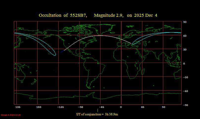 Occultation predictions of 552SB7 Magnitude 2.9 Date 2025 Dec 4 Moon: % illumination = 99+, Solar elongation = 167 Disappearance U.T. Sun Moon CA PA WA a b Location h m s Alt Alt Az o o o m/o m/o 1 AT Graz 4 31 6 11 293 40S 147 159 -1.1 -3.2 2 AT Innsbruck 4 35 38 13 291 30S 157 169 -1.7 -5.0 3 AT Klagenfurt 4 33 47 12 293 35S 152 164 -1.3 -3.9 4 AT Klagenfurt 4 33 48 12 293 35S 152 164 -1.3 -3.9 5 AT Langenlebarn 4 26 34 12 293 47S 139 152 -0.8 -2.7 6 AT Linz 4 28 32 13 292 43S 144 156 -0.9 -3.0 7 AT Salzburg 4 31 10 13 291 38S 149 161 -1.1 -3.5 8 AT Vienna 4 26 46 12 293 47S 139 152 -0.8 -2.7 9 AT Wels 4 28 50 13 292 43S 144 156 -0.9 -3.1 10 AT Wiener Neustadt Ost 4 27 45 12 293 46S 141 153 -0.9 -2.8 11 AT Zeltweg 4 31 10 12 293 39S 148 160 -1.1 -3.3 12 BA Banja Luka 4 36 4 9 296 32S 155 167 -1.6 -4.1 13 BA Sarajevo 4 39 29 7 297 27S 160 172 -2.3 -5.4 14 BE Antwerp 4 27 7 20 284 38S 149 161 -0.9 -3.9 15 BE Beauvechain 4 28 33 20 284 36S 151 163 -1.0 -4.2 16 BE Bertrix 4 32 1 19 286 31S 156 168 -1.4 -5.1 17 BE Brasschaat 4 26 25 20 284 39S 148 160 -0.8 -3.8 18 BE Brussels 4 28 13 20 284 37S 150 163 -1.0 -4.1 19 BE Charleroi 4 30 12 20 285 33S 154 166 -1.2 -4.7 20 BE Chievres 4 30 20 20 284 32S 155 167 -1.3 -4.9 21 BE Florennes 4 30 52 19 285 32S 155 167 -1.3 -4.9 22 BE Kleine Brogel 4 26 18 20 284 40S 146 159 -0.8 -3.6 23 BE Koksijde 4 29 19 21 283 33S 154 166 -1.2 -4.8 24 BE Kortrijk-Vevelgem 4 29 56 20 284 33S 154 167 -1.2 -4.9 25 BE Liege 4 28 23 19 285 37S 150 162 -1.0 -4.0 26 BE Ostend 4 28 40 21 283 35S 152 165 -1.1 -4.6 27 BE Sint-Truiden 4 28 3 20 285 38S 149 162 -0.9 -4.0 28 BE Ursel 4 28 10 21 283 36S 151 163 -1.0 -4.3 29 BE Weelde 4 25 50 20 284 41S 146 158 -0.8 -3.6 30 BE Zoersel 4 26 28 20 284 39S 147 160 -0.8 -3.8 31 BE Zutendaal 4 26 57 19 285 39S 148 160 -0.9 -3.7 32 BG Bourgas 4 30 14 -10 2 302 45S 141 154 -1.1 -2.4 33 BG Gorna Orechovica 4 30 48 -11 3 300 44S 143 155 -1.1 -2.5 34 BG Plovdiv 4 35 4 -10 3 301 37S 150 163 -1.4 -3.2 35 BG Sofia 4 35 7 -12 4 300 36S 151 163 -1.4 -3.3 36 BG Stara Zagora 4 33 1 -10 3 301 40S 146 159 -1.3 -2.8 37 BG Varna 4 28 24 -10 2 301 49S 138 150 -1.0 -2.2 38 BY Homel 4 10 6 8 300 79S 107 120 -0.5 -1.5 39 BY Minsk 4 9 32 10 297 78S 108 120 -0.4 -1.6 40 BY Vitebsk 4 6 39 10 298 83S 103 115 -0.4 -1.5 41 CA Abbotsford 2 9 11 28 85 80N 85 98 +0.3 +1.4 42 CA Alert 3 14 7 32 182 63N 69 81 +0.2 +0.3 43 CA Armstrong 2 51 20 55 127 42S 145 157 +3.8 -4.2 44 CA Atikokan 2 46 50 54 120 41S 146 158 +4.3 -4.6 45 CA Baker Lake 2 44 40 43 129 84N 89 102 +0.7 +1.2 46 CA Brandon 2 27 39 46 107 70S 116 129 +1.4 +0.4 47 CA Broughton Island 3 12 37 47 180 83S 103 116 +0.9 -0.4 48 CA Buffalo Narrows 2 25 28 39 104 86N 91 104 +0.6 +1.3 49 CA Burwash 2 28 26 23 81 52N 58 70 -0.1 +1.7 50 CA Calgary 2 15 39 35 93 87N 92 105 +0.6 +1.3 51 CA Cambridge Bay 2 46 28 37 122 70N 75 88 +0.4 +1.5 52 CA Campbell River 2 9 48 26 83 75N 81 93 +0.2 +1.5 53 CA Cape Dorset 3 1 26 49 159 81S 105 118 +1.0 +0.1 54 CA Castlegar 2 11 20 32 89 85N 91 103 +0.5 +1.3 55 CA Chilliwack 2 9 29 28 85 80N 86 98 +0.3 +1.4 56 CA Churchill 2 40 45 46 125 84S 103 115 +1.0 +0.8 57 CA Clyde River 3 8 48 44 173 88N 93 106 +0.7 +0.1 58 CA Cold Lake 2 22 20 37 100 86N 92 104 +0.6 +1.4 59 CA Comox 2 9 31 27 83 76N 82 94 +0.2 +1.5 60 CA Coppermine 2 41 13 34 110 65N 70 82 +0.3 +1.7 61 CA Coral Harbour 2 13 35 33 91 85N 91 104 +0.5 +1.3 62 CA Coronation 2 18 31 37 97 88N 94 106 +0.6 +1.3 63 CA Cranbrook 2 12 41 33 90 87N 93 105 +0.5 +1.3 64 CA Dauphin 2 28 11 45 108 73S 113 125 +1.3 +0.6 65 CA Dawson 2 33 2 24 83 51N 56 68 -0.1 +1.7 66 CA Dawson Creek 2 19 55 31 92 73N 79 91 +0.3 +1.6 67 CA Dease Lake 2 22 55 26 86 62N 67 79 +0.0 +1.7 68 CA Dryden 2 41 3 52 118 53S 133 146 +2.4 -1.3 69 CA Edmonton 2 19 17 35 96 83N 89 101 +0.5 +1.4 70 CA Edson 2 17 54 33 94 80N 86 98 +0.4 +1.5 71 CA Eskimo Point 2 42 53 45 128 89S 97 110 +0.9 +0.9 72 CA Estevan 2 23 14 43 103 74S 113 125 +1.3 +0.6 73 CA Eureka 3 6 48 33 154 64N 69 81 +0.3 +1.0 74 CA Faro 2 29 25 26 87 56N 61 74 +0.0 +1.7 75 CA Flin Flon 2 29 26 43 110 84S 102 114 +1.0 +1.0 76 CA Fort Chipewyan 2 28 8 37 104 78N 84 97 +0.5 +1.5 77 CA Fort McMurray 2 24 54 37 102 81N 87 99 +0.5 +1.4 78 CA Fort McPherson 2 38 31 26 90 52N 57 70 +0.0 +1.7 79 CA Fort Nelson 2 24 23 30 93 68N 73 85 +0.2 +1.7 80 CA Fort Resolution 2 30 46 35 104 73N 79 91 +0.4 +1.6 81 CA Fort Saint John 2 20 33 31 92 72N 78 90 +0.3 +1.6 82 CA Fort Simpson 2 29 35 31 97 66N 71 84 +0.2 +1.7 83 CA Fort Smith 2 29 36 36 105 76N 82 94 +0.4 +1.5 84 CA Gillam 2 38 11 47 122 79S 107 120 +1.2 +0.7 85 CA Gjoa Haven 2 50 0 40 133 77N 82 95 +0.5 +1.2 86 CA Grande Prairie 2 19 24 32 93 75N 81 93 +0.3 +1.6 87 CA Hall Beach 2 59 14 44 154 85N 91 103 +0.7 +0.6 88 CA Hay River 2 29 28 34 102 72N 77 89 +0.3 +1.6 89 CA High Level 2 25 27 33 98 73N 78 91 +0.3 +1.6 90 CA Holman Island 2 45 38 32 110 60N 66 78 +0.2 +1.7 91 CA Hudson Bay 2 26 57 43 108 81S 105 117 +1.0 +0.9 92 CA Inuvik 2 40 2 27 92 53N 58 70 +0.0 +1.7 93 CA Iqaluit 3 9 58 50 173 74S 113 125 +1.1 -0.6 94 CA Kamloops 2 12 11 30 88 80N 85 98 +0.3 +1.4 95 CA Kelowna 2 11 30 31 88 82N 88 100 +0.4 +1.4 96 CA Kenora 2 37 30 50 115 57S 129 141 +2.1 -0.7 97 CA Kindersley 2 19 25 38 99 88S 98 110 +0.8 +1.2 98 CA Kuujjuararapik 3 7 4 57 154 46S 141 153 +2.5 -3.4 99 CA La Ronge 2 26 53 41 107 90S 96 109 +0.8 +1.2 100 CA Lethbridge 2 14 31 35 93 89S 97 109 +0.7 +1.2 101 CA Lloydminster 2 21 1 38 99 88N 94 106 +0.7 +1.3 102 CA Lynn Lake 2 32 21 43 114 88S 98 111 +0.9 +1.1 103 CA Mayo 2 31 58 25 86 53N 59 71 -0.1 +1.7 104 CA Meadow Lake 2 23 10 39 102 88N 94 107 +0.7 +1.3 105 CA Medicine Hat 2 16 28 37 95 87S 99 111 +0.8 +1.2 106 CA Moose Jaw 2 21 14 41 101 80S 106 118 +1.0 +0.9 107 CA Nanaimo 2 8 49 27 84 78N 84 96 +0.2 +1.4 108 CA Nanisivik 3 0 29 40 152 75N 81 93 +0.5 +0.9 109 CA Norman Wells 2 34 55 29 95 59N 64 76 +0.1 +1.7 110 CA North Battleford 2 21 40 39 101 89S 97 109 +0.8 +1.2 111 CA Old Crow 2 39 10 24 86 49N 54 66 -0.1 +1.7 112 CA Pangnirtung 3 11 39 