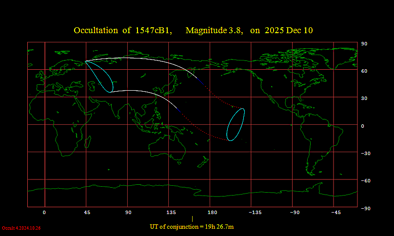 Occultation predictions of 1547cB1 Magnitude 3.8 Date 2025 Dec 10 Moon: % illumination = 60-, Solar elongation = 102 Disappearance U.T. Sun Moon CA PA WA a b Location h m s Alt Alt Az o o o m/o m/o 3 CN Beijing 18 7 53 36 110 -39S 163 143 +0.7 -2.0 4 CN Dalian 18 13 56 41 115 -39S 163 143 +0.8 -2.1 5 CN Hailar 18 3 22 33 118 -76S 126 106 +0.9 +0.1 6 CN Harbin 18 10 29 40 124 -68S 133 113 +1.1 -0.5 7 CN Hohhot 18 2 56 31 106 -39S 162 142 +0.7 -1.9 9 CN Jiamusi 18 14 49 42 131 -76S 125 105 +1.2 -0.3 11 CN Mudanjiang 18 14 46 43 128 -68S 134 114 +1.1 -0.6 12 CN Qingdao 18 20 38 42 114 -23S 178 158 +0.5 -3.7 13 CN Shijiazhuang 18 10 57 36 108 -28S 174 154 +0.6 -3.0 14 CN Taiyuan 18 11 33 34 106 -22S 179 159 +0.5 -3.7 15 CN Tianjin 18 10 29 37 111 -35S 167 146 +0.7 -2.3 16 CN Urumqi 17 46 9 10 87 -52S 150 130 +0.3 -0.7 17 CN Yanji 18 15 51 44 127 -62S 139 119 +1.1 -0.9 18 CN Yantai 18 17 35 42 115 -31S 171 150 +0.7 -2.8 19 JP Akita 18 32 56 55 144 -66S 136 116 +1.4 -1.2 20 JP Aomori 18 32 22 54 145 -70S 132 112 +1.4 -1.0 21 JP Asahikawa 18 32 34 52 150 -81S 121 101 +1.6 -0.6 22 JP Ashiya 18 34 4 53 125 -29S 172 152 +0.6 -3.2 23 JP Atsugi 18 38 21 58 141 -51S 150 130 +1.2 -1.9 24 JP Chitose 18 32 1 53 148 -77S 125 104 +1.5 -0.7 25 JP Fukue 18 37 49 53 123 -19S 183 162 +0.2 -4.3 26 JP Fukui 18 33 19 55 135 -48S 153 133 +1.1 -2.0 27 JP Fukuoka 18 34 52 54 125 -28S 174 154 +0.5 -3.3 28 JP Gifu 18 35 33 57 136 -47S 155 135 +1.1 -2.1 29 JP Hachijojima 18 43 46 61 141 -44S 157 137 +1.1 -2.4 30 JP Hachinoe 18 33 41 55 146 -70S 131 111 +1.5 -1.0 31 JP Hakodate 18 31 34 53 146 -73S 129 109 +1.5 -0.9 32 JP Hamamatsu 18 37 50 58 137 -46S 156 136 +1.1 -2.2 33 JP Hanamaki 18 34 28 55 145 -66S 135 115 +1.4 -1.2 34 JP Hiroshima 18 34 6 55 129 -36S 166 145 +0.8 -2.7 35 JP Hofu 18 34 8 54 126 -32S 170 150 +0.7 -3.0 36 JP Hyakuri 18 38 16 58 143 -55S 146 126 +1.3 -1.8 37 JP Iki 18 33 56 53 124 -27S 175 154 +0.5 -3.4 38 JP Iruma 18 37 35 58 141 -53S 149 129 +1.2 -1.9 39 JP Iwakuni 18 34 23 54 127 -34S 168 148 +0.7 -2.9 40 JP Iwojima 19 12 0 72 148 -17S 185 165 -0.3 -4.5 41 JP Izumo 18 31 35 53 129 -40S 162 142 +0.9 -2.4 42 JP Kagoshima 18 41 47 56 125 -19S 183 162 +0.1 -4.3 43 JP Kanazawa 18 33 1 55 135 -49S 152 132 +1.1 -1.9 44 JP Kanoya 18 43 41 57 125 -17S 185 165 +0.0 -4.6 45 JP Kisarazu 18 39 2 59 142 -52S 150 129 +1.2 -1.9 46 JP Kitakyushu 18 34 22 54 126 -30S 172 152 +0.6 -3.2 47 JP Kochi 18 37 9 56 130 -34S 168 148 +0.7 -2.9 48 JP Kohnan 18 34 32 55 130 -39S 163 143 +0.9 -2.5 49 JP Kumamoto 18 37 37 55 125 -25S 177 157 +0.4 -3.6 50 JP Matsumoto 18 35 10 56 138 -51S 151 130 +1.2 -1.9 51 JP Matsushima 18 35 52 56 145 -63S 138 118 +1.4 -1.4 52 JP Matsuyama 18 35 35 55 128 -33S 168 148 +0.7 -2.9 53 JP Memanbetsu 18 35 15 53 153 -84S 118 98 +1.6 -0.6 54 JP Miho 18 31 42 54 129 -41S 161 141 +0.9 -2.4 55 JP Minami Tori Shima 19 21 48 74 201 -50S 151 131 +1.2 -2.5 56 JP Misawa 18 33 24 54 146 -71S 131 111 +1.5 -1.0 57 JP Miyake Jima 18 41 20 60 141 -47S 155 134 +1.1 -2.2 58 JP Miyazaki 18 41 35 56 126 -21S 180 160 +0.2 -4.0 59 JP Monbetsu 18 33 47 52 152 -84S 118 98 +1.6 -0.5 60 JP Nagasaki 18 36 57 54 124 -23S 179 158 +0.4 -3.8 61 JP Nagoya 18 35 56 57 136 -46S 155 135 +1.1 -2.1 62 JP Nakashibetsu 18 36 41 53 155 -84S 117 97 +1.6 -0.6 63 JP Nanki-Shirahama 18 38 11 57 132 -38S 164 144 +0.9 -2.6 64 JP Nyutabaru 18 40 44 56 126 -22S 179 159 +0.3 -3.9 65 JP Obihiro 18 34 26 53 151 -79S 122 102 +1.6 -0.7 66 JP Oita 18 35 59 55 127 -30S 172 152 +0.6 -3.2 67 JP Okayama 18 34 3 55 130 -39S 163 142 +0.9 -2.5 68 JP Oki Island 18 30 15 53 130 -44S 158 138 +1.0 -2.2 69 JP Osaka 18 36 3 56 133 -42S 160 140 +1.0 -2.4 70 JP Oshima 18 39 36 59 140 -49S 153 132 +1.2 -2.1 71 JP Ozuki 18 33 47 53 126 -31S 171 151 +0.7 -3.1 72 JP Rishiri Island 18 29 54 50 148 -84S 118 98 +1.5 -0.4 73 JP Sapporo 18 32 5 53 148 -77S 125 104 +1.5 -0.7 74 JP Sendai 18 35 48 57 144 -62S 139 119 +1.4 -1.4 75 JP Shimofusa 18 38 25 58 142 -53S 148 128 +1.2 -1.8 76 JP Shonai 18 33 20 55 142 -62S 139 119 +1.4 -1.4 77 JP Takamatsu 18 35 35 56 130 -37S 164 144 +0.8 -2.6 78 JP Tanegashima 18 47 46 58 126 -12S 190 169 -0.4 -5.3 79 JP Tateyama 18 39 43 59 141 -51S 151 131 +1.2 -2.0 80 JP Tokachi 18 34 13 53 151 -79S 122 102 +1.6 -0.7 81 JP Tokushima 18 36 18 56 131 -38S 164 143 +0.9 -2.6 82 JP Tokyo 18 38 59 59 143 -54S 148 127 +1.3 -1.8 83 JP Tottori 18 32 30 54 131 -43S 159 139 +1.0 -2.3 84 JP Toyama 18 33 26 56 137 -51S 150 130 +1.2 -1.8 85 JP Tsuiki 18 34 55 54 126 -29S 172 152 +0.6 -3.2 86 JP Tsushima 18 31 57 52 123 -29S 173 153 +0.6 -3.2 87 JP Wakkanai 18 30 45 50 149 -85S 117 97 +1.6 -0.4 88 JP Yaizu 18 38 20 58 138 -47S 154 134 +1.1 -2.1 89 JP Yakushima 18 48 53 58 126 -10S 192 171 -0.6 -5.7 90 JP Yamagata 18 34 41 56 143 -62S 139 119 +1.4 -1.4 91 JP Yamaguchi 18 34 19 54 126 -31S 171 151 +0.7 -3.1 92 JP Yokota 18 37 41 58 140 -52S 149 129 +1.2 -1.9 93 JP Zama 18 38 10 58 141 -51S 150 130 +1.2 -1.9 96 KR Busan 18 29 8 51 123 -32S 169 149 +0.7 -2.9 97 KR Cheju 18 33 51 51 120 -18S 183 163 +0.2 -4.4 98 KR Chinhae 18 28 55 50 123 -31S 170 150 +0.7 -2.9 99 KR Chongju 18 23 52 48 122 -37S 165 145 +0.8 -2.5 100 KR Chunchon 18 21 22 47 122 -42S 160 140 +0.9 -2.1 101 KR Jhunju 18 25 43 48 121 -32S 169 149 +0.7 -2.8 102 KR Kangnung 18 22 47 48 124 -43S 159 139 +0.9 -2.1 103 KR Kimhae 18 28 58 51 123 -32S 170 149 +0.7 -2.9 104 KR Kunsan 18 25 18 48 120 -31S 170 150 +0.7 -2.9 105 KR Kwangju 18 27 48 49 120 -28S 174 153 +0.6 -3.2 106 KR Kyungju 18 27 25 50 124 -36S 166 146 +0.8 -2.6 107 KR Mokpo 18 28 47 49 120 -25S 176 156 +0.5 -3.5 108 KR Osan 18 22 34 47 121 -37S 164 144 +0.8 -2.4 109 KR Pohang 18 27 14 50 124 -36S 165 145 +0.8 -2.6 110 KR Pyongtaek 18 22 53 47 121 -37S 165 145 +0.8 -2.4 111 KR Pyongyang 18 17 21 44 120 -44S 158 138 +0.9 -1.9 112 KR Sachon 18 28 41 50 122 -30S 172 151 +0.6 -3.1 113 KR Seoul 18 21 18 47 121 -39S 162 142 +0.8 -2.3 114 KR Seoul East 18 21 49 47 121 -39S 163 142 +0.8 -2.3 115 KR Sokch'O 18 21 39 47 123 -44S 158 137 +0.9 -2.0 116 K