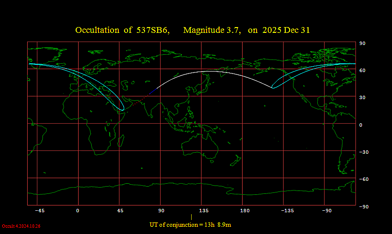Occultation predictions of 537SB6 Magnitude 3.7 Date 2025 Dec 31 Moon: % illumination = 88+, Solar elongation = 140 Disappearance U.T. Sun Moon CA PA WA a b Location h m s Alt Alt Az o o o m/o m/o 1 CA Alert 12 52 13 17 355 49N 41 53 -0.2 -0.6 2 CA Baker Lake 13 12 8 2 329 60N 52 64 -0.4 -0.6 3 CA Burwash 13 27 53 14 296 86S 86 98 -0.2 -1.3 4 CA Cambridge Bay 13 11 31 8 320 62N 54 67 -0.3 -0.8 5 CA Clyde River 12 59 25 -11 5 351 42N 34 46 -0.3 -0.3 6 CA Coppermine 13 15 10 10 312 69N 61 74 -0.2 -1.0 7 CA Dawson 13 24 16 15 294 90N 82 94 -0.2 -1.3 8 CA Dawson Creek 13 28 9 2 312 87N 79 92 -0.4 -0.9 9 CA Dease Lake 13 29 11 8 304 89S 83 96 -0.3 -1.1 10 CA Eureka 12 57 57 15 334 52N 44 56 -0.2 -0.9 11 CA Faro 13 25 33 12 300 88N 80 93 -0.2 -1.2 12 CA Fort Chipewyan 13 21 44 1 318 76N 68 80 -0.4 -0.8 13 CA Fort McPherson 13 19 16 15 296 82N 74 86 -0.1 -1.3 14 CA Fort Nelson 13 26 10 5 309 85N 77 89 -0.4 -1.0 15 CA Fort Resolution 13 20 48 4 316 75N 67 80 -0.4 -0.8 16 CA Fort Saint John 13 27 56 3 311 87N 79 92 -0.4 -0.9 17 CA Fort Simpson 13 22 47 7 310 80N 72 84 -0.3 -1.0 18 CA Fort Smith 13 21 6 3 317 75N 67 80 -0.4 -0.8 19 CA Gjoa Haven 13 9 17 6 328 57N 49 61 -0.3 -0.7 20 CA Grande Prairie 13 28 5 1 313 87N 79 92 -0.5 -0.9 21 CA Hall Beach 13 4 30 4 340 49N 40 53 -0.3 -0.5 22 CA Hay River 13 21 50 5 314 77N 69 82 -0.4 -0.9 23 CA High Level 13 24 19 3 314 81N 73 85 -0.4 -0.9 24 CA Holman Island 13 12 40 13 309 68N 60 73 -0.2 -1.1 25 CA Inuvik 13 17 57 15 297 80N 72 84 -0.1 -1.3 26 CA Mayo 13 24 16 14 297 88N 80 92 -0.2 -1.3 27 CA Nanisivik 13 3 12 9 337 50N 42 54 -0.3 -0.6 28 CA Norman Wells 13 20 29 11 304 79N 71 84 -0.2 -1.1 29 CA Old Crow 13 19 36 17 292 85N 77 89 -0.1 -1.4 30 CA Peace River 13 26 32 2 314 84N 76 89 -0.4 -0.9 31 CA Pelly Bay 13 7 27 5 333 53N 45 58 -0.3 -0.6 32 CA Pond Inlet 13 1 30 8 343 47N 39 51 -0.3 -0.5 33 CA Port Hardy 13 36 43 1 308 78S 94 107 -0.5 -1.1 34 CA Prince George 13 31 4 2 311 88S 84 97 -0.5 -1.0 35 CA Prince Pupert 13 34 6 5 305 81S 91 103 -0.4 -1.2 36 CA Quesnel 13 31 49 1 311 86S 86 98 -0.5 -1.0 37 CA Repulse Bay 13 7 18 3 337 52N 44 56 -0.4 -0.5 38 CA Resolute 13 4 20 11 327 55N 46 59 -0.2 -0.9 39 CA Sachs Harbour 13 12 23 15 302 71N 63 75 -0.1 -1.2 40 CA Sandspit 13 35 56 5 304 78S 94 107 -0.4 -1.2 41 CA Smithers 13 32 6 4 307 85S 87 99 -0.4 -1.1 42 CA Spence Bay 13 7 59 7 330 55N 47 60 -0.3 -0.7 43 CA Terrace 13 33 4 5 306 83S 89 101 -0.4 -1.1 44 CA Teslin 13 27 56 10 301 89S 83 95 -0.3 -1.2 45 CA Tuktoyaktuk 13 16 28 16 297 78N 70 83 -0.1 -1.3 46 CA Watson Lake 13 26 49 9 304 88N 80 92 -0.3 -1.1 47 CA Whitehorse 13 27 52 11 299 88S 84 96 -0.2 -1.3 48 CA Williams Lake 13 32 24 0 311 85S 87 99 -0.5 -0.9 49 CA Wrigley 13 21 58 9 307 80N 72 84 -0.3 -1.0 50 CA Yellowknife 13 19 58 5 315 74N 66 79 -0.3 -0.9 53 CN Urumqi 11 48 40 -12 44 97 49S 123 136 +1.8 +0.0 55 GL Jakobshavn 12 53 2 -6 3 5 34N 26 39 -0.4 +0.0 56 GL Thule 12 56 54 11 350 45N 37 49 -0.3 -0.5 62 KZ Semiplatinsk 11 45 53 -9 37 97 78S 94 107 +0.7 +1.3 66 NO Batsfjord 12 19 20 -6 19 71 46N 37 50 -0.3 +1.5 70 NO Svalbard 12 33 29 19 63 45N 37 49 -0.2 +1.2 71 NO Svartnes 12 18 32 -6 19 72 46N 38 51 -0.3 +1.5 72 RU Abakan 11 59 49 45 113 69S 103 115 +1.1 +0.9 73 RU Anadyr 13 20 29 34 255 65S 107 119 +0.3 -2.0 74 RU Barnaul 11 52 12 40 103 79S 93 106 +0.8 +1.3 75 RU Bratsk 12 14 7 51 132 62S 110 123 +1.3 +0.3 77 RU Irkutsk 12 19 45 55 133 42S 130 143 +2.2 -1.2 78 RU Kemorovo 11 56 38 41 108 79S 93 106 +0.8 +1.3 80 RU Magadan 13 17 54 47 229 36S 136 148 +0.9 -3.6 83 RU Nizhnevartovsk 11 59 51 35 104 83N 75 87 +0.4 +1.7 84 RU Omsk 11 48 56 -8 33 95 87N 79 92 +0.4 +1.6 86 RU Pevek 13 12 49 36 244 71S 101 114 +0.4 -1.7 87 RU Polyarny 12 29 45 47 157 78S 94 106 +0.8 +0.5 88 RU Provideniya Bay 13 19 33 36 250 62S 110 122 +0.4 -2.0 89 RU Salekhard 12 7 35 31 100 69N 61 74 +0.1 +1.8 90 RU Surgut 11 59 27 34 101 80N 72 84 +0.3 +1.7 93 RU Ulan-Ude 12 28 21 58 140 31S 142 154 +3.2 -3.7 94 RU Yakutsk 12 49 27 52 189 54S 119 131 +1.2 -1.4 95 US Anchorage Ak 13 30 0 18 287 77S 95 107 -0.1 -1.6 96 US Barter Island Ak 13 16 14 20 287 83N 75 88 +0.0 -1.4 97 US Chugiak Ak 13 29 55 18 287 78S 94 107 -0.1 -1.6 98 US Clear Mews Ak 13 25 3 19 286 84S 88 101 -0.1 -1.5 99 US Deadhorse Ak 13 16 11 21 283 85N 77 90 +0.0 -1.5 100 US Delta Junction Ak 13 25 12 18 289 86S 86 99 -0.1 -1.5 101 US Fairbanks Ak 13 24 9 19 287 86S 86 99 -0.1 -1.5 102 US Fort Richardson Ak 13 29 49 18 288 78S 94 107 -0.1 -1.6 103 US Fort Yukon Ak 13 21 23 19 288 90N 82 94 -0.1 -1.4 104 US Juneau Ak 13 30 42 10 301 85S 87 100 -0.3 -1.2 105 US Kodiak Ak 13 35 55 18 288 68S 104 117 -0.2 -1.7 106 US Sitka Ak 13 32 34 9 301 82S 90 103 -0.3 -1.3 107 US Skagway Ak 13 29 29 11 300 86S 86 99 -0.3 -1.3 Reappearance U.T. Sun Moon CA PA WA a b Location h m s Alt Alt Az o o o m/o m/o 1 CA Alert 13 33 3 17 4 -59N 293 306 -0.2 +0.4 3 CA Burwash 14 17 53 8 306 -85S 257 269 -0.3 -1.1 7 CA Dawson 14 14 52 10 305 -88S 260 273 -0.3 -1.2 10 CA Eureka 13 39 36 15 344 -61N 292 304 -0.3 -0.4 11 CA Faro 14 15 5 7 310 -90S 262 274 -0.4 -1.1 13 CA Fort McPherson 14 9 30 11 307 -85N 267 279 -0.3 -1.2 24 CA Holman Island 13 59 14 10 320 -73N 280 292 -0.4 -1.1 25 CA Inuvik 14 7 56 12 308 -84N 269 281 -0.3 -1.3 26 CA Mayo 14 14 23 9 308 -90S 262 274 -0.3 -1.1 27 CA Nanisivik 13 41 36 8 346 -57N 296 308 -0.5 -0.4 28 CA Norman Wells 14 9 5 7 314 -82N 270 282 -0.4 -1.1 29 CA Old Crow 14 10 42 13 303 -88N 264 276 -0.3 -1.3 38 CA Resolute 13 45 43 10 337 -61N 291 303 -0.4 -0.6 39 CA Sachs Harbour 14 0 35 12 313 -76N 276 289 -0.3 -1.2 45 CA Tuktoyaktuk 14 6 21 12 308 -82N 270 282 -0.3 -1.3 51 CN Hotan 12 4 21 -6 41 89 -11S 184 196 -1.0 +3.8 52 CN Kashi 12 14 7 -6 40 90 -30S 202 215 -0.2 +2.7 53 CN Urumqi 12 24 12 50 105 -18S 190 202 -0.4 +3.6 54 FI Ivalo 12 57 48 -6 21 77 -62N 291 303 +0.1 +1.6 56 GL Thule 13 33 38 11 358 -53N 299 311 -0.4 +0.1 57 KG Bishkek 12 22 59 -8 41 93 -42S 214 226 +0.1 +2.3 58 KZ Alma-Ata 12 23 49 -10 43 96 -38S 211 223 +0.0 +2.5 59 KZ Balkhash 12 31 39 -