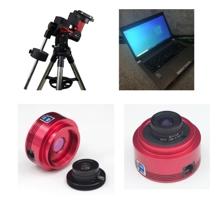 Additional Equipment The picture shows some of the other equipment used at the observatory. The top left shows the iOptron CEM40 mount which is used to quide the 6" and 9.25" telescopes. The top right shows the Dell laptop which acquires the imaging from the cameras. It is USB3 equipped for fast download of data, which is store on the internal 500GB SSD drive and external 2TB external drive. The bottom left shows the ZWOASI 120MM-s mono camera for imaging the moon. The bottom right shows the ZWOASI 290MC for color imaging. |