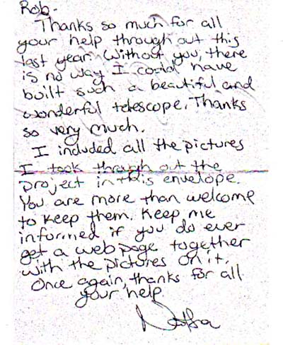 As part of graduation requirements at the Bonner Springs High School, all seniors were required to complete a "senior project". The project may be of their choosing, approved by the counselors, and stages of the project must be completed according to a set time table. The project consists of a written paper and oral presentation. This particular student wrote his paper on the "Future Exploration of Mars". For his "hands on" project, he decided to build a telescope. It must be noted that the student no experience using a telescope, let alone trying to build one.