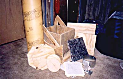 A multitude of components make up the final assembly. Besides the rocker box, a "cage" for the secondary mirror holder and eyepiece holder, plus connecting struts, make up the final design. For bearing surfaces (places where wood rubs against wood} telfon, formica and aluminum are used to provide a smooth movement of the telescope. Common construction materials ,most of which can be found at a local hardware store, are all that is needed for the mechanical parts of the telescope. |