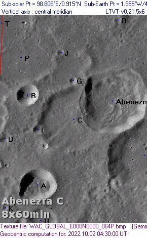Abenezra, +192,-358: This fine crater is 27 miles in diameter, and has loft walls rising 15,000 feet on both east and west. On the floor is a central mountain, whic is connected by a ridge to the south wall. Abenezra overlaps an older ring on the east, and this ring contains at least eight crater and two hills, which there are craters on its walls. The inner slopes of Abenezra are richly terraced. To the north of the ring is the crater B, and farther to the east a peculiar double depression, E. North of crater B is a partial ring, T. There are other fragmentary rings on the west and south. On the floor there is a crater at the foot of the north wall, and another on the south wall. - Wilkins and Moore, The Moon, Faber and Faber, 1955