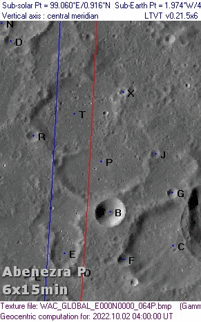 Abenezra P appears to have a fairly flat floor with no apparent central peak. Several craterlets dot the floor. The northeastern part of the wall appears to be lower than the remaining rim of the crater. Crater T overlays the northwestern part of P’s floor and destroyed P’s wall in that section.
