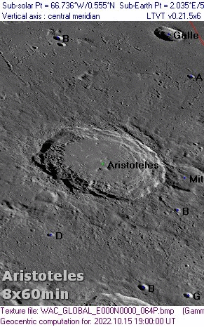Site Longitude = +75.800 Site Latitude = +40.100 Feature = Aristoteles Nearby Feature Longitude: = +16.900 Feature Latitude: = +50.000 Reproducing Lighting For: 2003/1/23 at 11:35 U.T. Desired Solar Altitude = +3.479(Setting), Azimuth = +263.846 Average Co-longitude = 157.683
