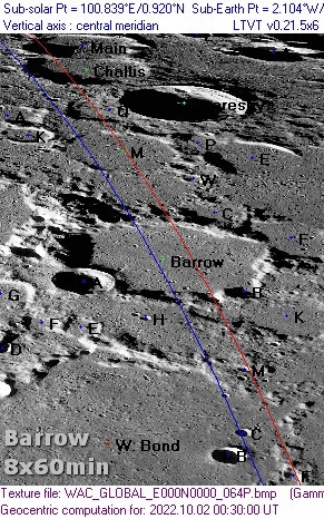 Starting Date = 2001 / 1 / 1 U.T. Site Longitude = 122.00 Latitude = 47.00 Redmond Washington Feature = BARROW Longitude = 7°42' Latitude = 71°18' Reproducing Lighting For: 2001 / 9 / 24 at 2 : 0 UT Desired Solar altitude = 0.505° (Rising), Azimuth = 86.692° Average Co-longitude = 353.877 In the time column, D=daylight, T=twilight ---- Moon's ---- Topocentric -- Earth's -- ------- Sun's ------- UT Date Time Alt° Semi-diam" long° lat° colong° lat° azim° 2001/ 3/31 22:46d 45.92 969.31 -4.70 0.73 358.38 -1.52 96.25 2001/ 6/28 0:52d 42.73 976.52 4.91 -6.78 353.89 -0.00 91.50 2001/ 9/24 2: 1t 19.89 927.98 7.22 -0.44 349.33 1.54 86.70 =================================================================================This showed the desired observing time, would be with a co-longitude of 353.877 and the solar altitude of .505 degrees rising.