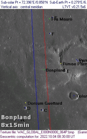 Later at 5:30 UT I made my way north to the region west of Parry. The high plains of northern Bonpland were crossed by a thin ray from a break in the western rim of Parry just short of 8 degrees south. It was hair fine and extended ~25Km to the west where the tips of the shadowed peaks met the depths of blackness at the terminator.-David Ryle