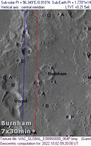 Burnham, +122 -242 [American astronomer, 1838-1921]. This object is a ring with low walls, at the north end of a long valley which runs southwards to a ring on the west of Airy. On the interior of Burnham are a crater and two hills. There is a small mountain on the outer, north-east wall.