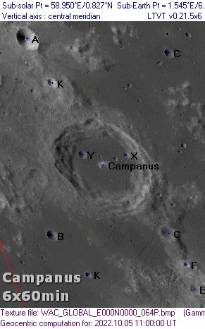 Observer: Tony Donnangelo Date/time of observation: 2003/01/13 02:56 U.T. Site location: Hummelstown RD 3, PA, USA (40.26° N., 76.75° W.) Site elevation: 479 feet (146 meters) Site classification: Suburban Moon's age: 10d 06:32, 73% illuminated Instrument: Takahashi FS-102 Magnification: 158x(Pentax 5.2mm XL), 234x(3.5mm Vixen SW) Object: Campanus (crater) Lunar ray coordinates: 28.0°S., 28.0°W. Rukl chart #: 53