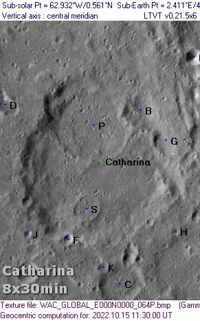 Catharina - +378,-310: A great but somewhat irregular walled-plain, about 55 miles in diameter, with broad walls torn by explosions and much deformed by depressions (the largest of which lies on the inner north-west slope, but still attaining 16,000 feet in places. A very prominent valley runs down the inner west slope and is, in part, a crater-chain. The outer north-west slope is altogether deformed by valleys and a mass of depressions, intruding upon wah other. The crest of the wall on the south-east and south is disturbed by small craters; on the outer slopes, among numerous craters, is the ring C connected to Polybius by a ridge and to Catharina by a valley. - Wilkins and Moore, The Moon, Faber & Faber, 1955