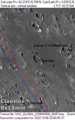 Description from Virtual Moon Atlas: Damaged circular formation. Steep slopes riddled supporting crater Blancanus to the southwest. Very high walls ridden by the craters Porter to the northeast, Rutherfurd to the southeast, Clavius K to the southwest, and Clavius L to the west. Large flat floor with Clavius D C N J & JA on an arc of circle. Numerous craterlets whose a chain to the southwest. Lines of crests.