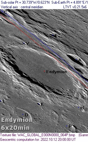 Endymion - +492,+803: A great crater, 78 miles in diameter, with loft, peak-surmounted walls, rising 15,000 feet on the west and still higher on the north. The floor is dark, which makes the formation easy to detect under any illumination. In general the floor is remarkably smooth, but there is some delicate detail...on the southern portion are a distinct craterlet, three mounds, also probably craterlets, and a landslip from the south-eastern wall...there is also a craterlet at the northern end of the floor. D.W.G. Arthur found a valley on the ourter north-east wall, ending on the north in two confluent irregular depressions. - Wilkins and Moore, The Moon, Faber & Faber, 1955