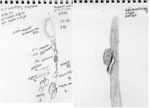 Date: Thu, 04 Sep 2003 15:34:43 -0700 From: Jane Houston Jones Subject: Sunset ray seen in crater Endymion ...on August 14th, 2003 Mojo was touring the lunar terminator with our f/9 AP180EDT, and he hollered out that there was a triple sunset ray visible. This was at 10:45 p.m.or 6:45 UT 8/15/03. We were at Glacier Point, Yosemite National Park, Latitude 37 43.741 N, Longitude 119 34.330 W, elevation 7,200 feet. We all took a look and sure enough, three bright wedges of light were sharply piercing the pool of dark shadow filled basin of a large crater. Try as I might, I couldn't figure which crater it was, so I sketched the entire terminator and other nearby craters so I could do the research later. I spent an hour with Mr. Rukl's Atlas back at the campsite the next day. The triple sunset ray was in the crater Endymion, identified on Rukl 7. I must say the Rukl paragraph on this crater is wonderful. Jane and Mojo |