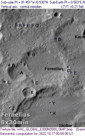 Fernelius +068, -617: A walled plain 40 miles in diameter. It lies closely north-east of Stofler, and is dwarfed by that great and important object. The floor is fairly level, though it does contain a number of small craterlets. To the east of Fernelius is an imperfect formation, A, 17 miles in diameter; this lacks part of its western wall, so that the interior is joined to that of Fernelius. (Wilkins & Moore, The Moon, 1955, Faber & Faber Ltd)