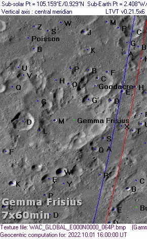 GEMMA FRISIUS, +187 -562 [Dutch scientist, 1508-55]. A great formation about 80 miles in diameter, with irregular walls, broken in places by craters ; on the northwest a large formation, Goodacre, intrudes. The western wall is tolerably even, and commences on the north at a crater, east of which-on the floor of Gemma Frisius-is a partial ring, D. A large ring abuts on the outer south-west; this is known as A, and has a remarkable crater group on its inner east slope. On the south crest of Gemma Frisius is a crater-chain. East of this the main wall runs in a bold sweep to the northeast, where its continuity i.s destroyed by the intrusion of two large rings, both open on the south, so that their interiors are in communication with that of Gemma Frisius. The larger of these rings, H, has very broad walls. On the floor of Gemma Frisius is a nearly central hill, as well as some craterlets and a dark spot on the west. On the outer east is a large enclosure, G, with two overlapping rings, D and K, at the end of the south wall-which is prolonged, and with a gap between it and the wall of Gemma Frisiust The ring, D, has a central peak. On the outer south-east there are many craters. The Moon, by Wilkins and Moore, 1955, Faber & Faber Ltd, London p.142